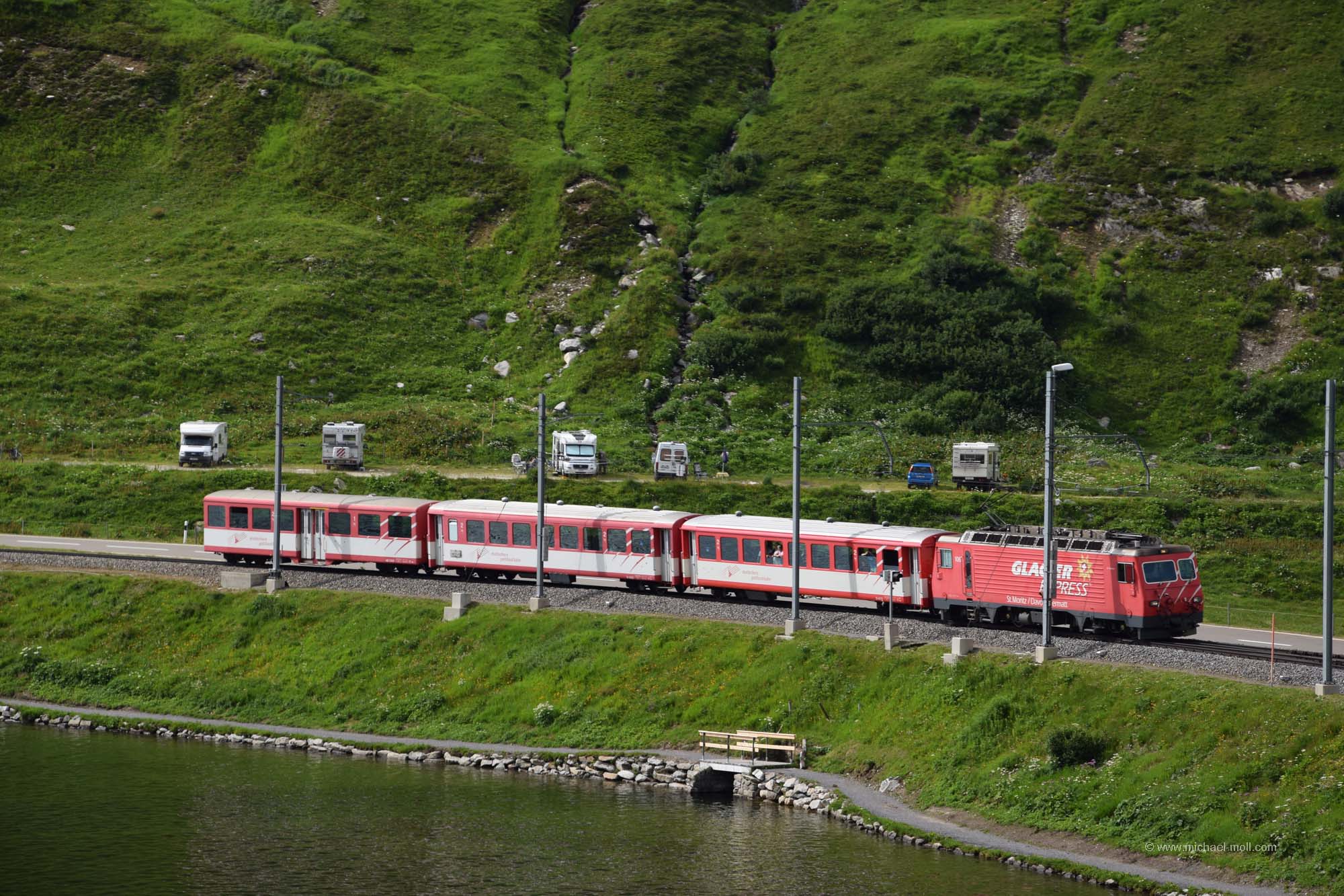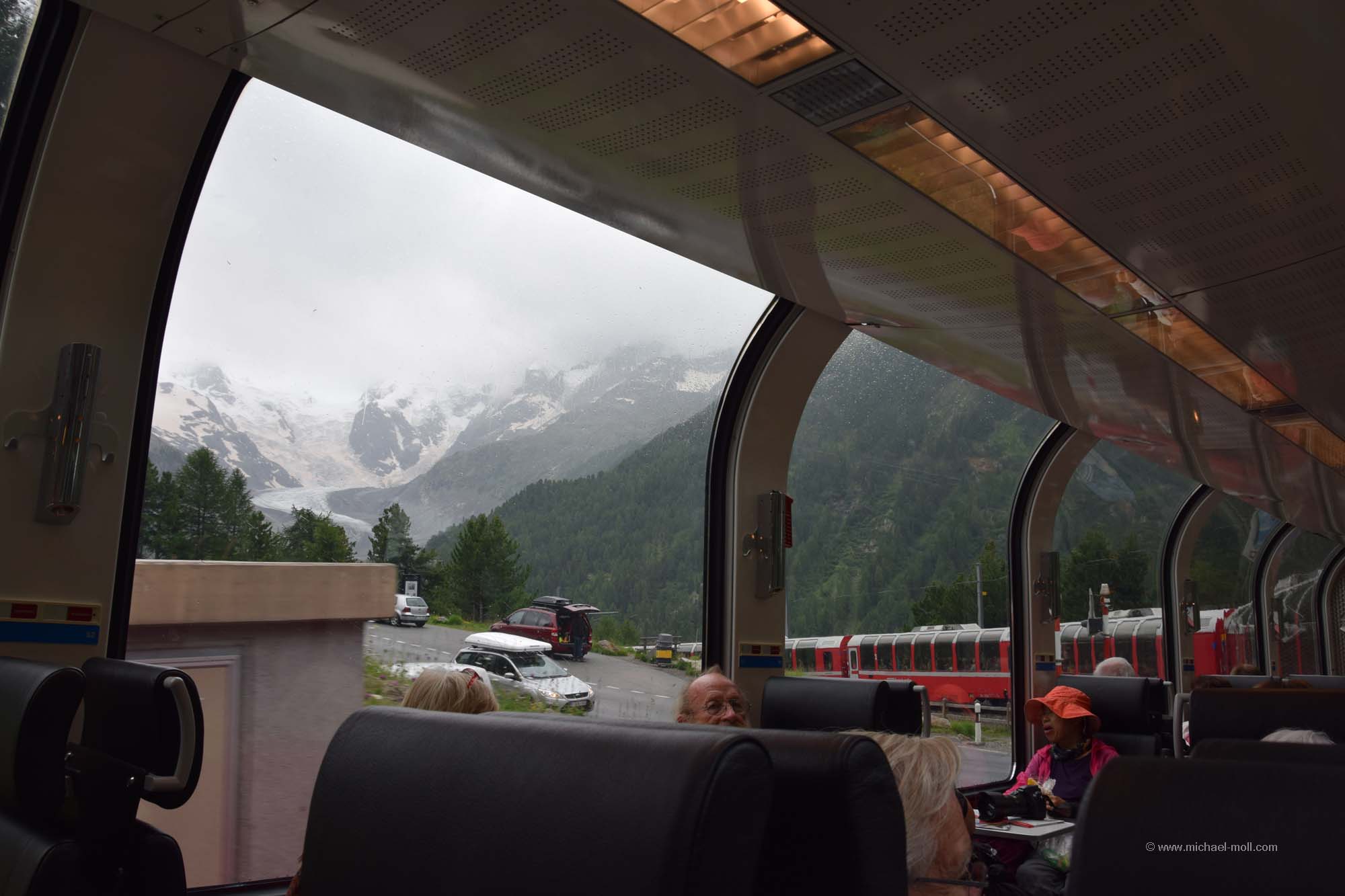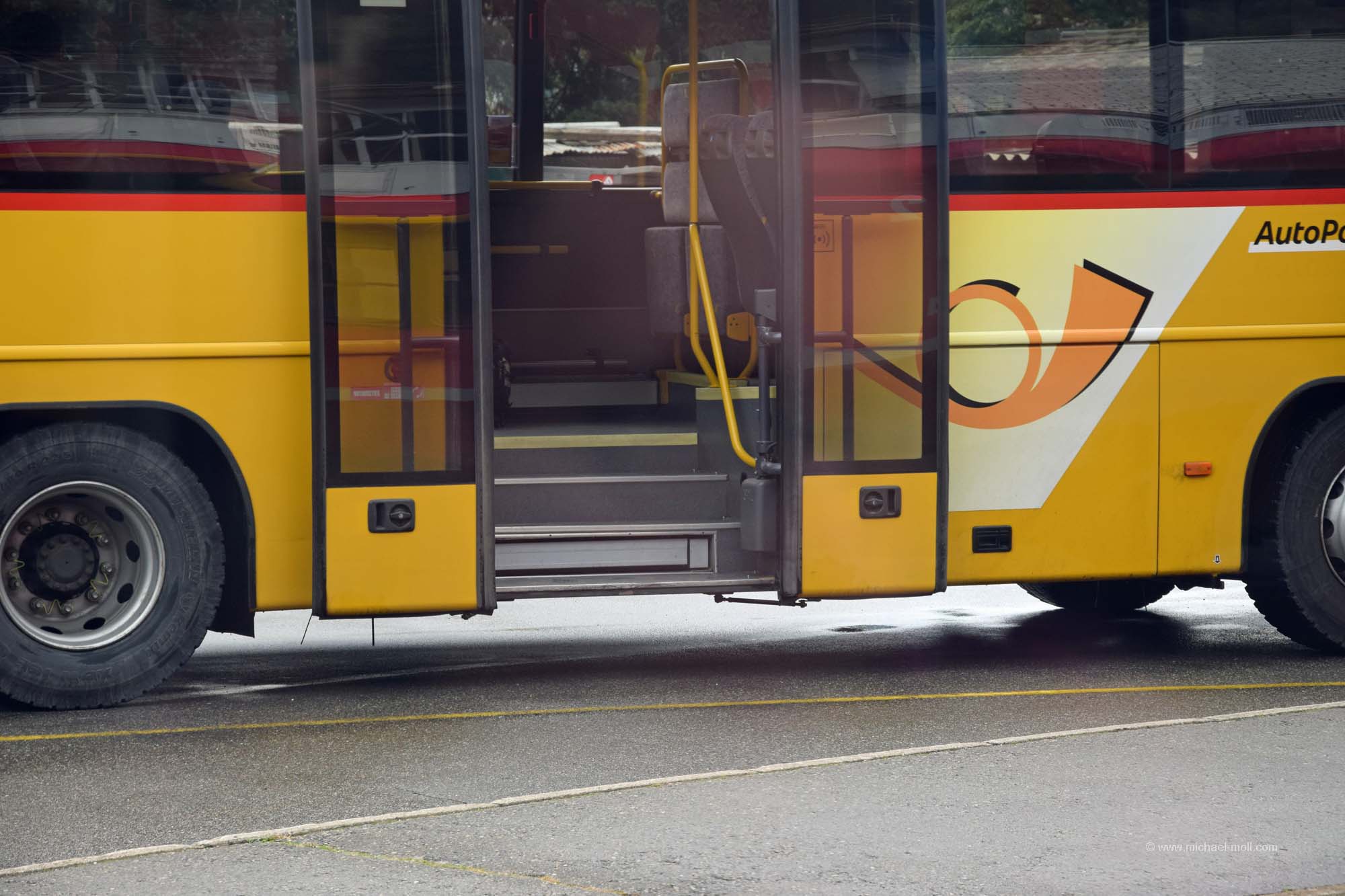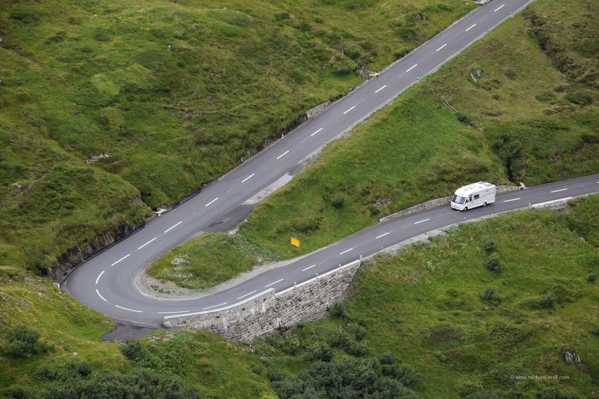 Da ich für das Buchprojekt auch immer wieder Bilder von Wohnmobilen brauche, die auch mal in Bewegung sein müssen und nicht immer meines zeigen sollen, achtete ich natürlich während der gesamten Reise auf jedes Wohnmobil, ob es irgendwie fotografisch verwertbar war. Und als Moni auf dem Rückweg rief, dass da ein Wohnmobil käme, rannte ich zur Straße, um einen besseren Blick zu erhaschen. Witzigerweise sah ich genau in diesem Moment einige Franken-Münzen auf dem Boden liegen und musste mich in Bruchteilen von Sekunden entscheiden, ob ich mich nach dem Geld bücke oder ob ich das vorbeifahrende Wohnmobil fotografiere. Ich entschied mich für einen Kompromiss und rief im Weiterlaufen der Moni zu, dass in St. Moritz Geld auf der Straße liegt. Es war kein Vermögen, aber es passte irgendwie zu dem Ort, wo man viel Geld benötigt.