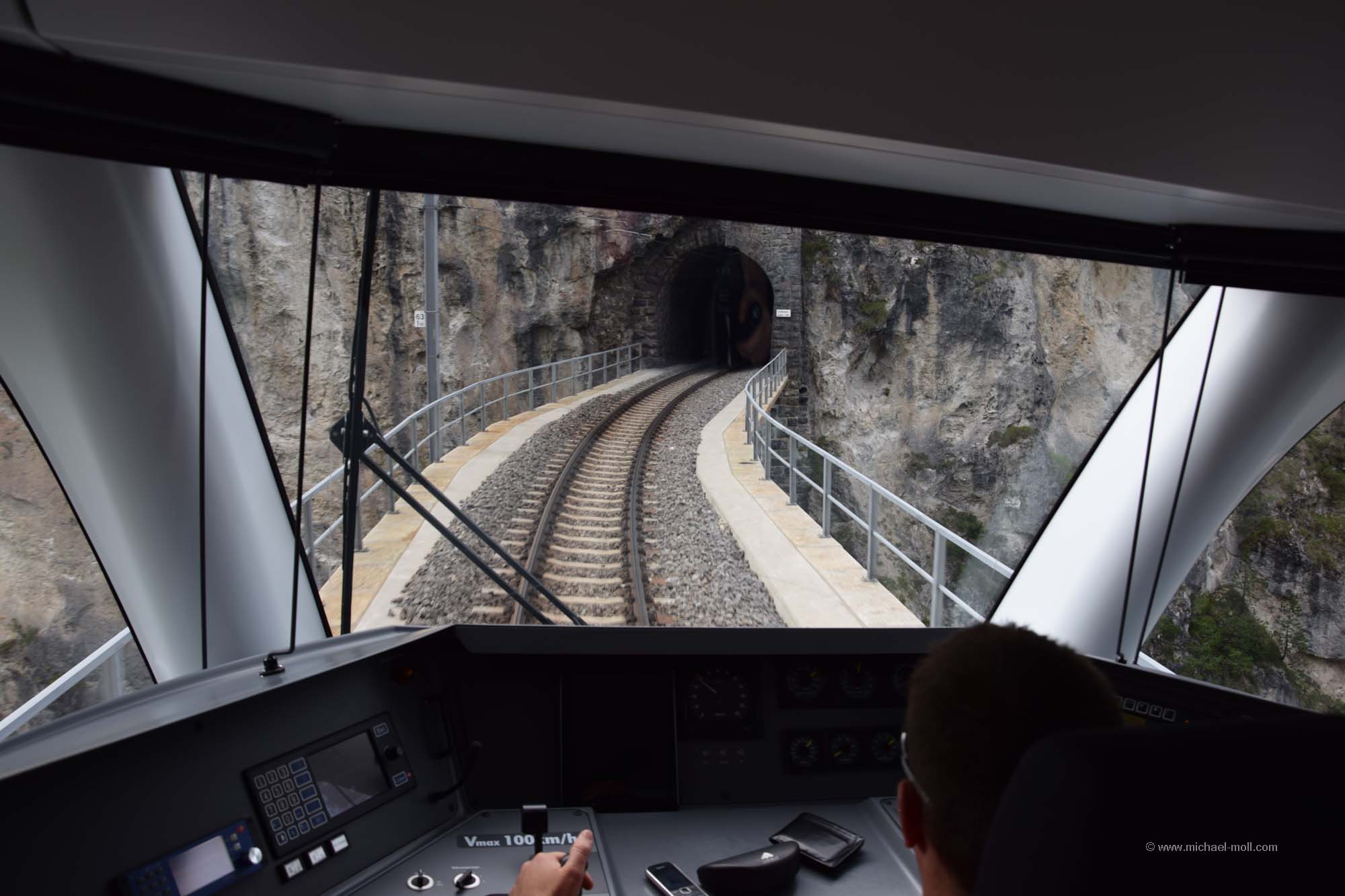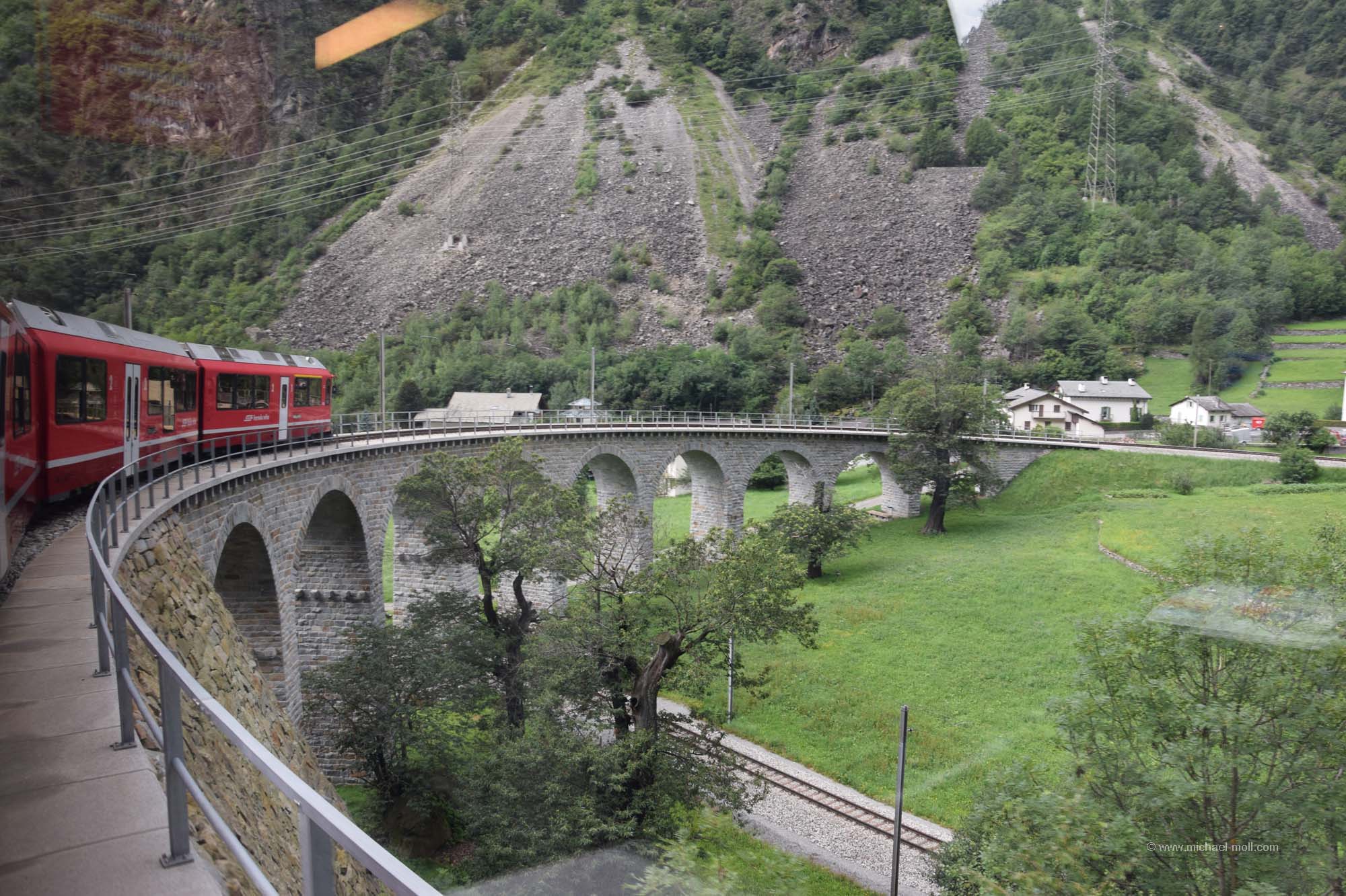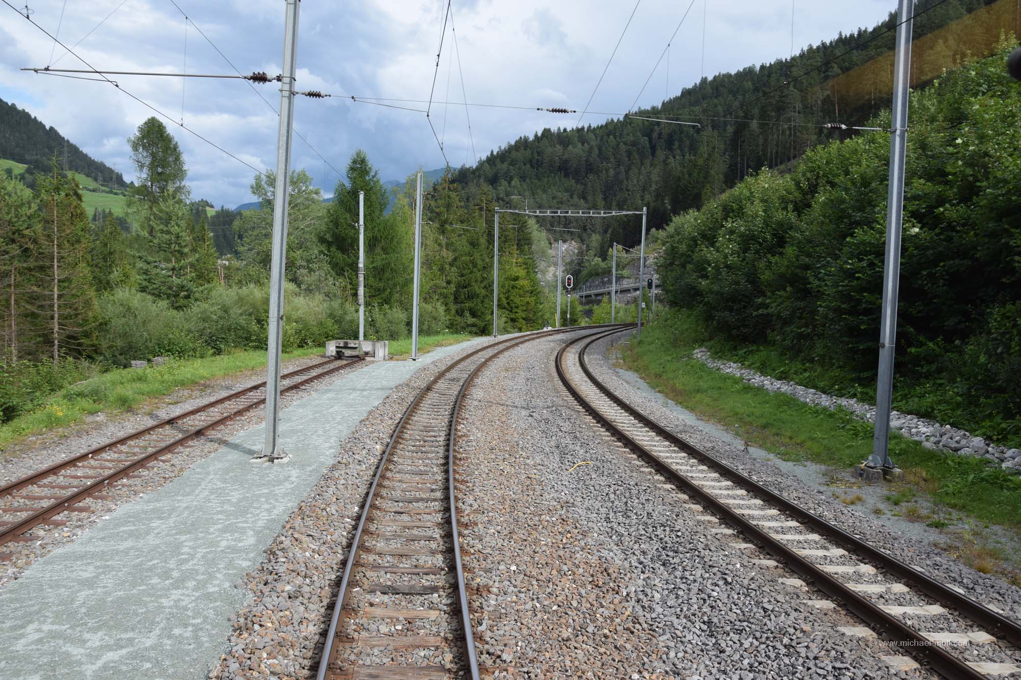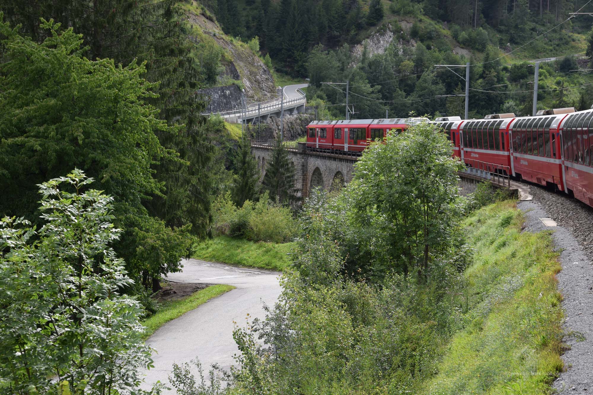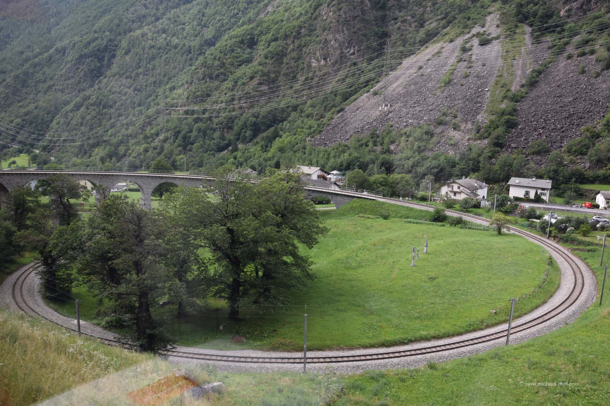 Auf der Aussichtsplattform steht man oberhalb der eingleisigen Bahnstrecke und hat einen wunderbaren Blick auf die Brücke und auf die Züge, die direkt im Anschluss an die Brückenüberquerung in einer Felswand verschwinden. Wenn denn ein Zug kommt. Aber da man ja heutzutage mit den richtigen Apps auf Reisen ausgestattet ist, konnten wir einen Blick auf den elektronischen Fahrplan werfen und wussten, dass wir noch ein Weilchen warten müssten. Nicht berücksichtigt waren allerdings die Güterzüge, die auch dieser Trasse fahren und prompt ein Motiv abgaben.