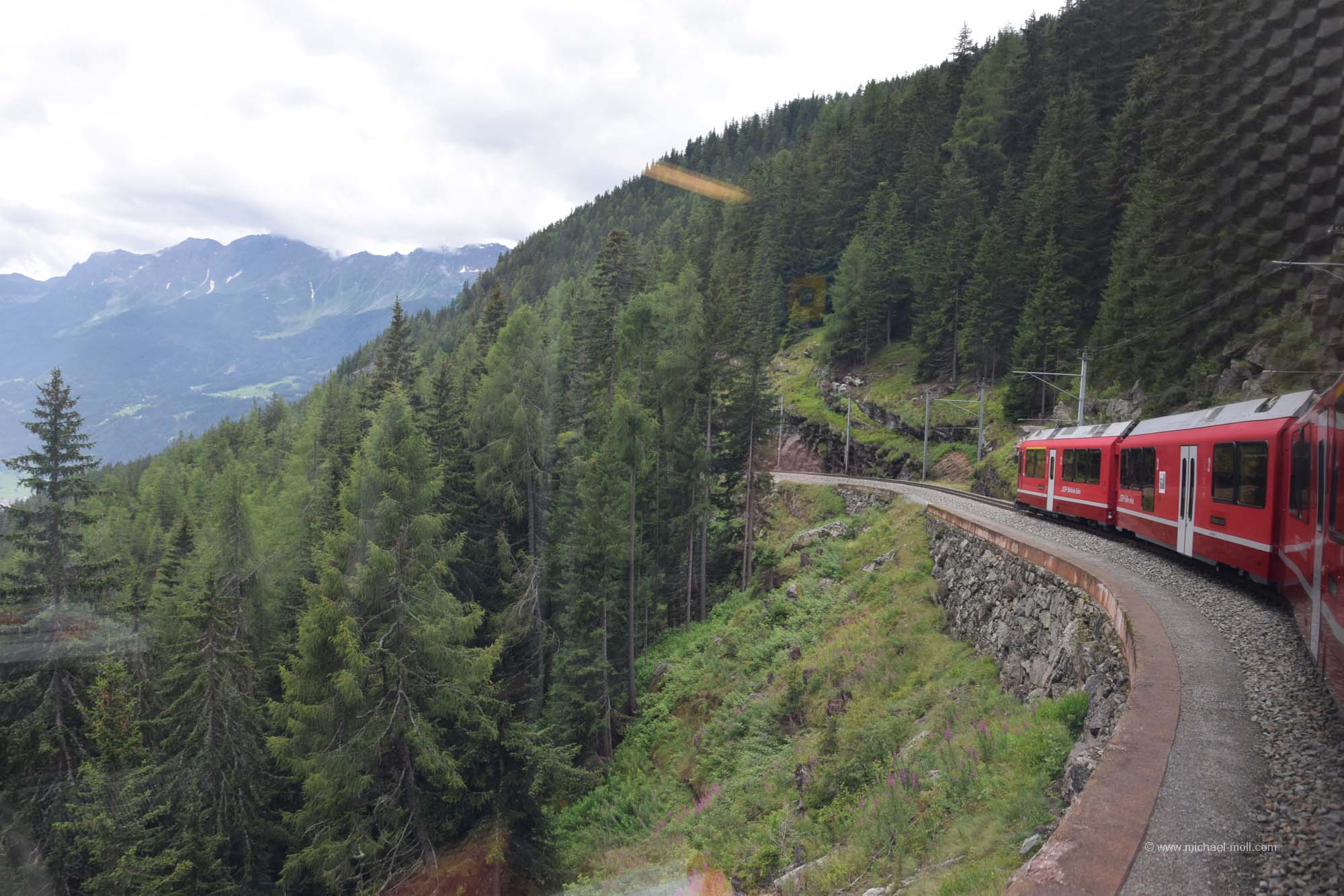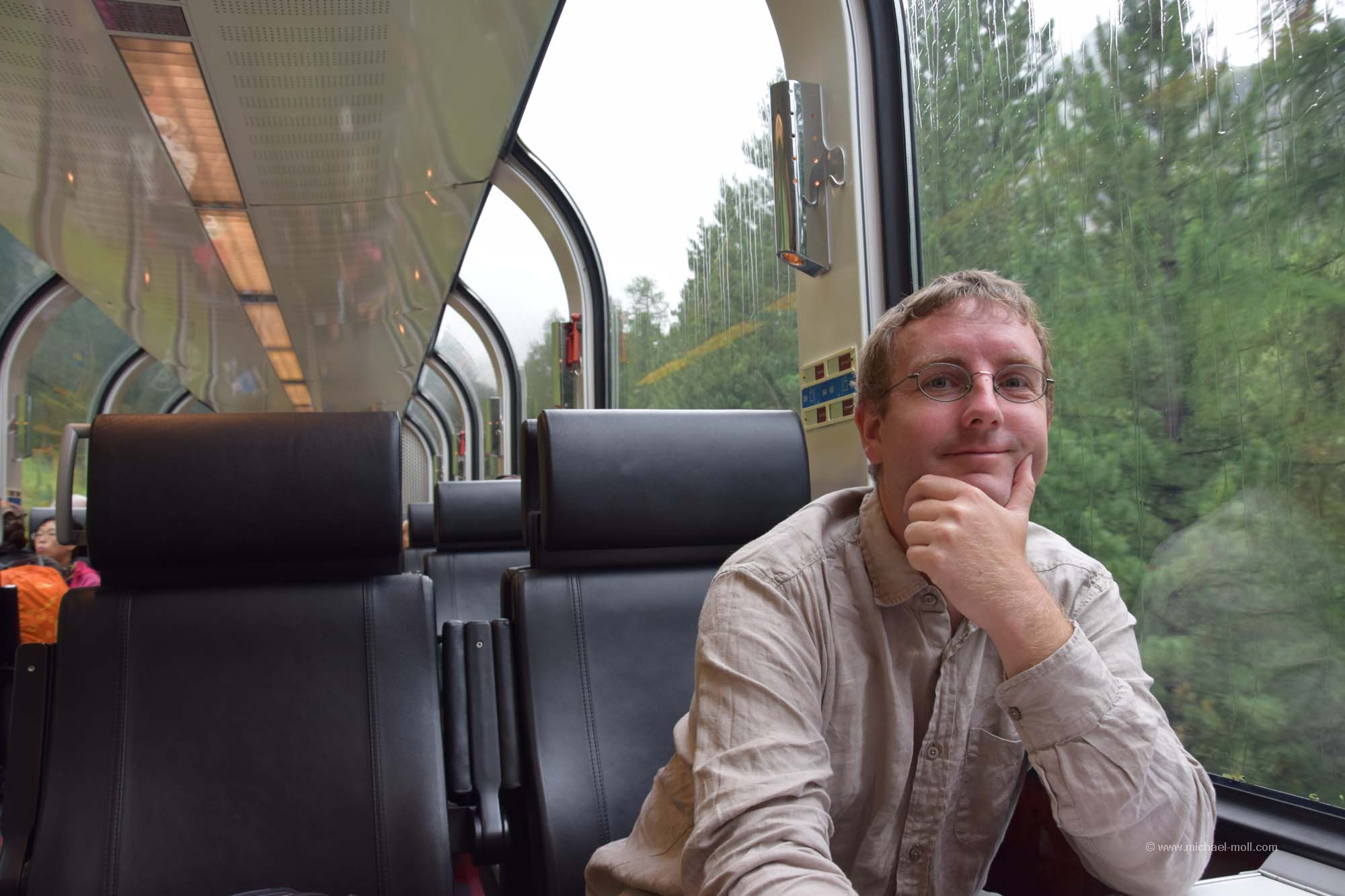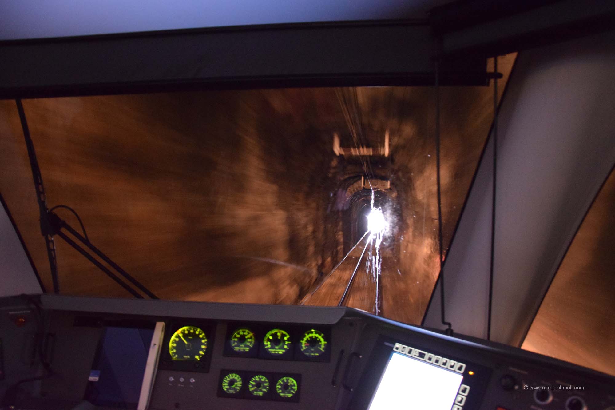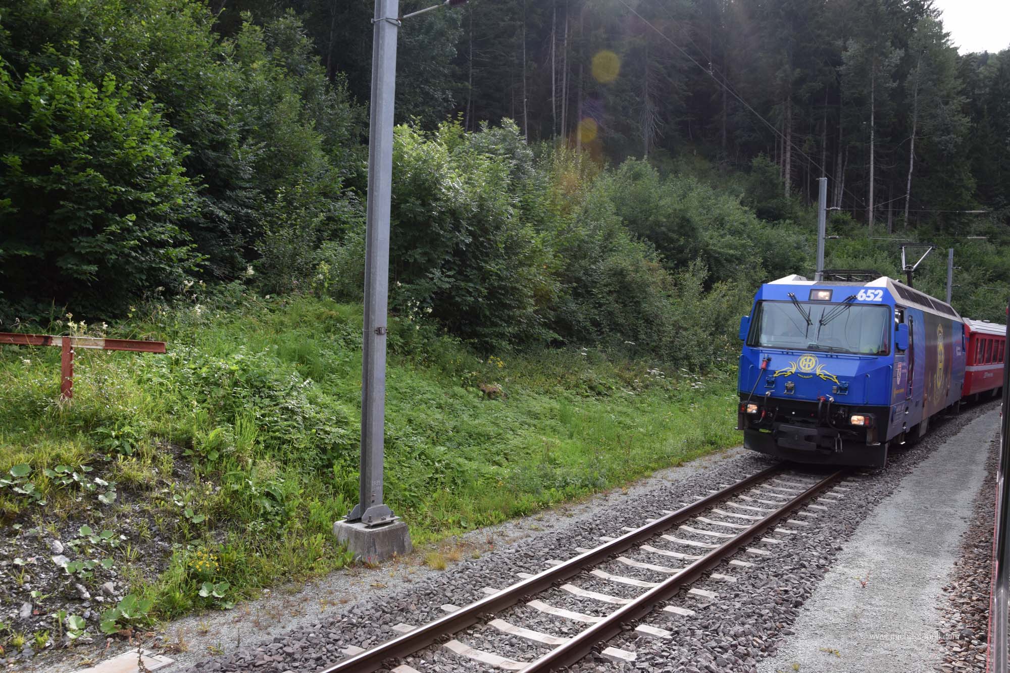 Auf der Aussichtsplattform steht man oberhalb der eingleisigen Bahnstrecke und hat einen wunderbaren Blick auf die Brücke und auf die Züge, die direkt im Anschluss an die Brückenüberquerung in einer Felswand verschwinden. Wenn denn ein Zug kommt. Aber da man ja heutzutage mit den richtigen Apps auf Reisen ausgestattet ist, konnten wir einen Blick auf den elektronischen Fahrplan werfen und wussten, dass wir noch ein Weilchen warten müssten. Nicht berücksichtigt waren allerdings die Güterzüge, die auch dieser Trasse fahren und prompt ein Motiv abgaben.
