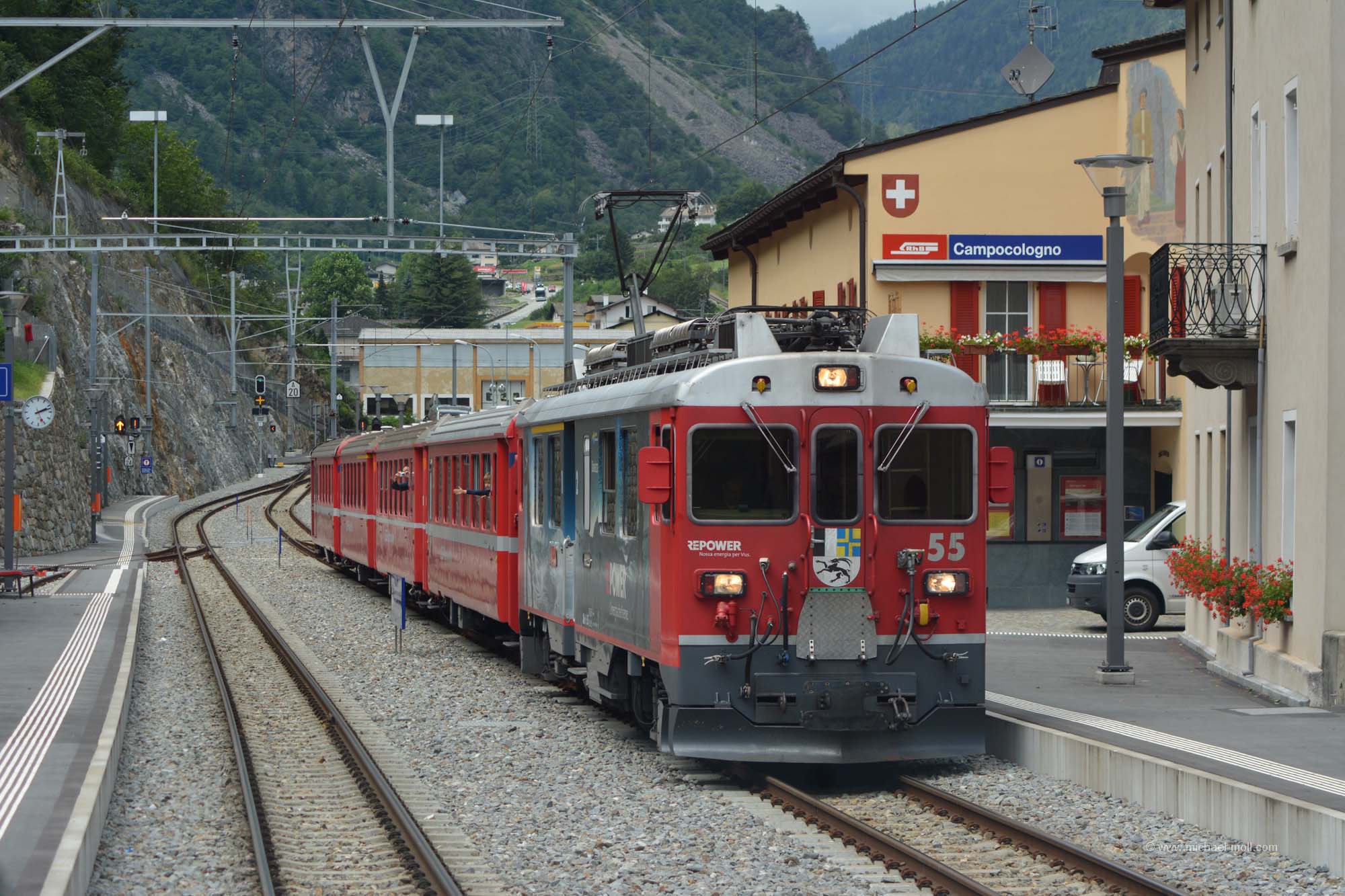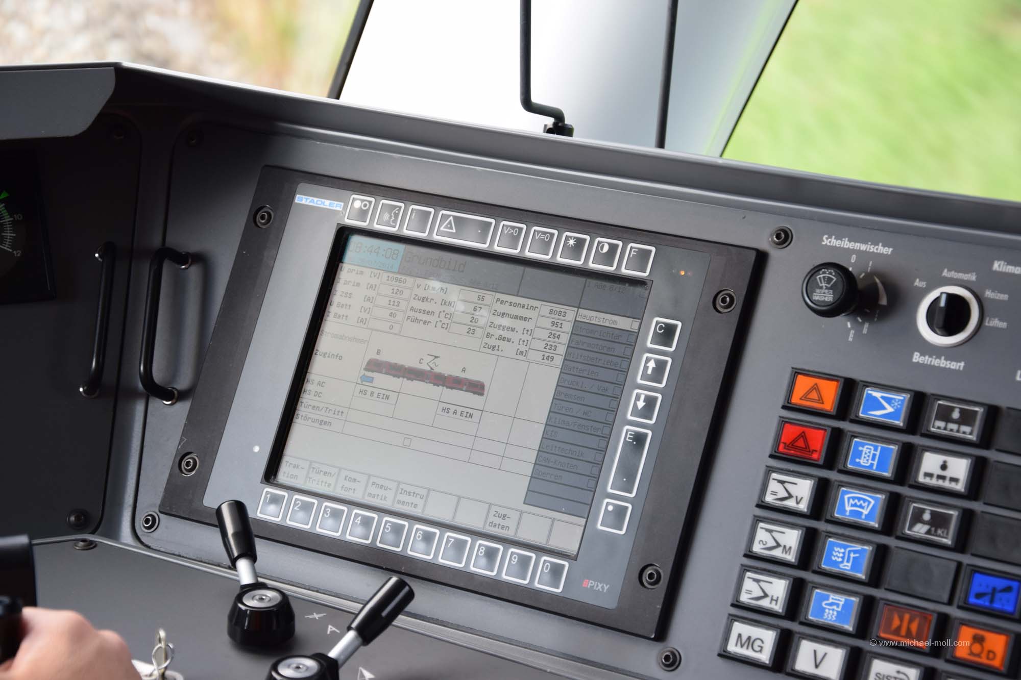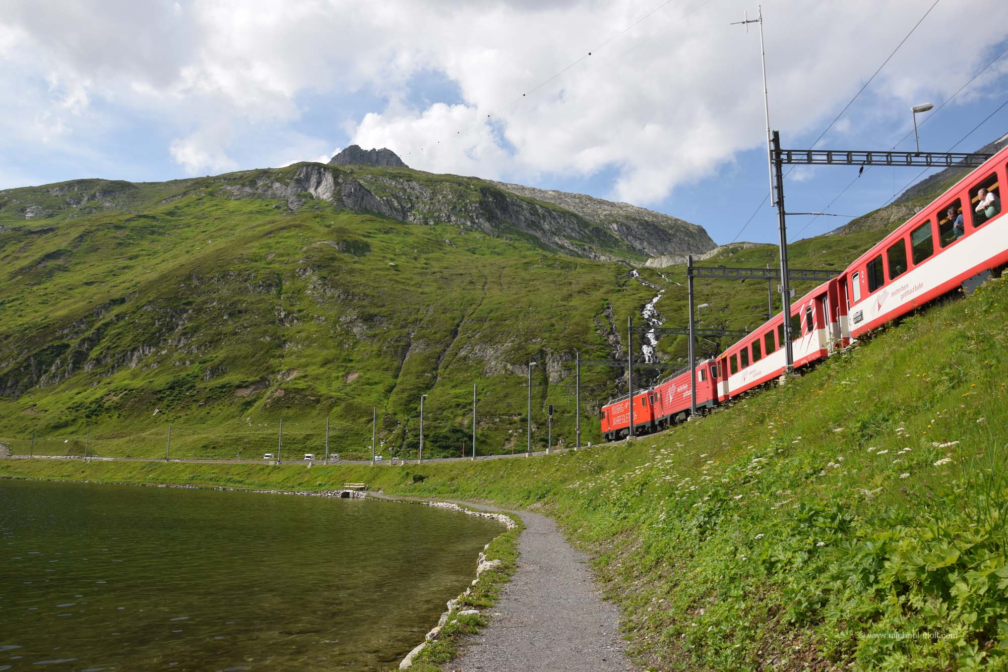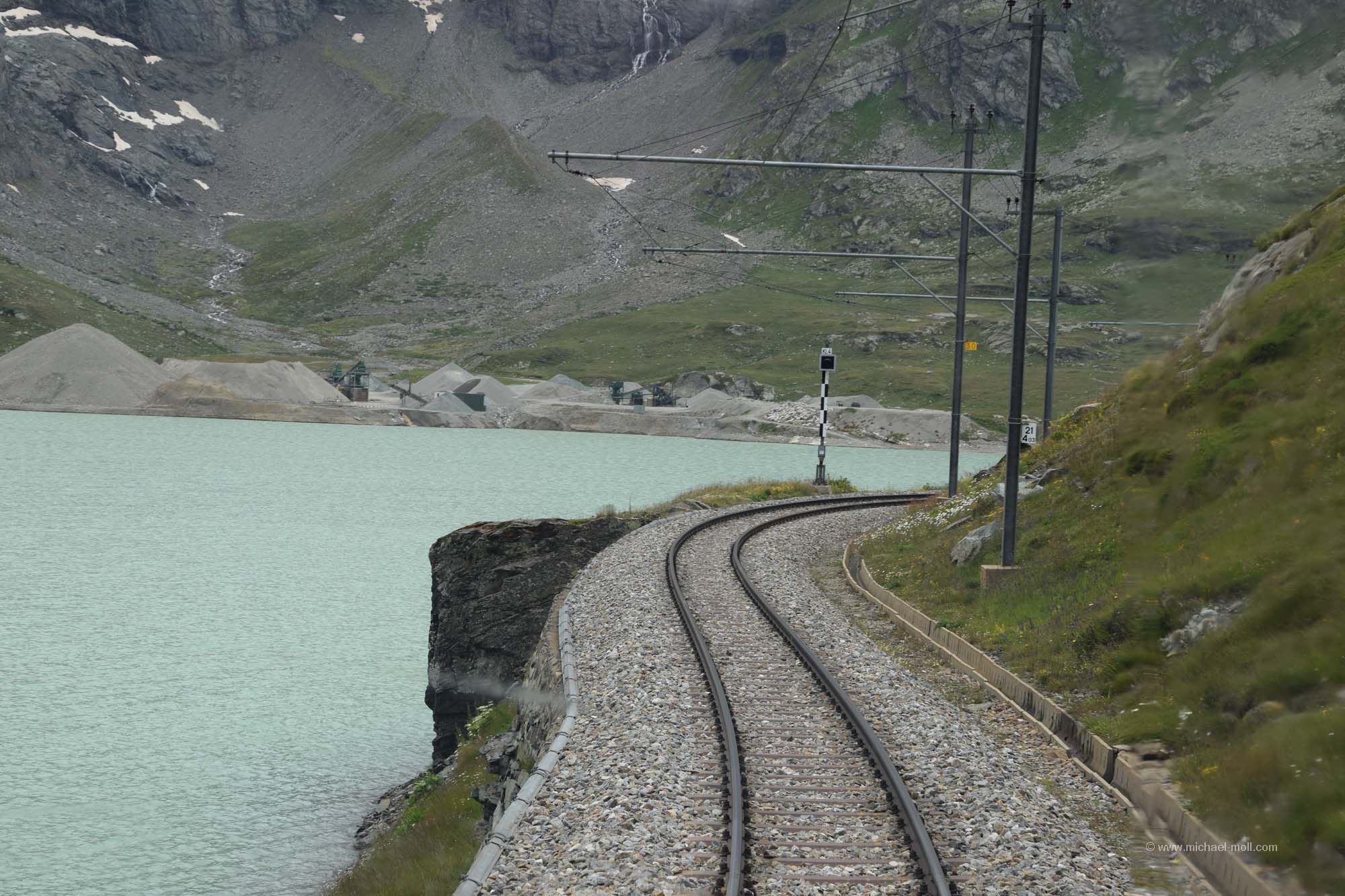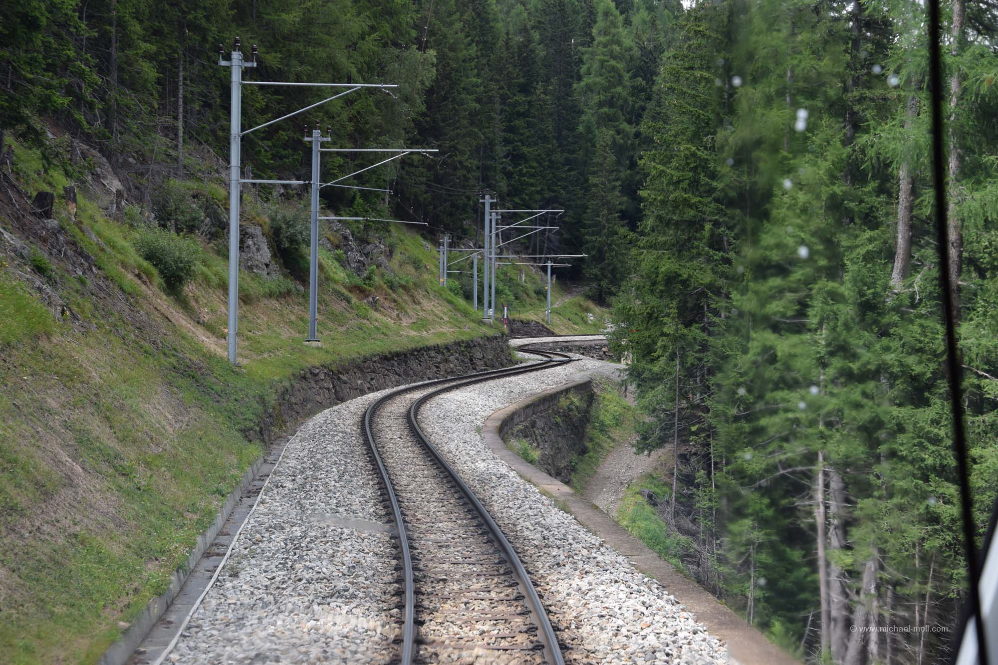 Auf der Aussichtsplattform steht man oberhalb der eingleisigen Bahnstrecke und hat einen wunderbaren Blick auf die Brücke und auf die Züge, die direkt im Anschluss an die Brückenüberquerung in einer Felswand verschwinden. Wenn denn ein Zug kommt. Aber da man ja heutzutage mit den richtigen Apps auf Reisen ausgestattet ist, konnten wir einen Blick auf den elektronischen Fahrplan werfen und wussten, dass wir noch ein Weilchen warten müssten. Nicht berücksichtigt waren allerdings die Güterzüge, die auch dieser Trasse fahren und prompt ein Motiv abgaben.