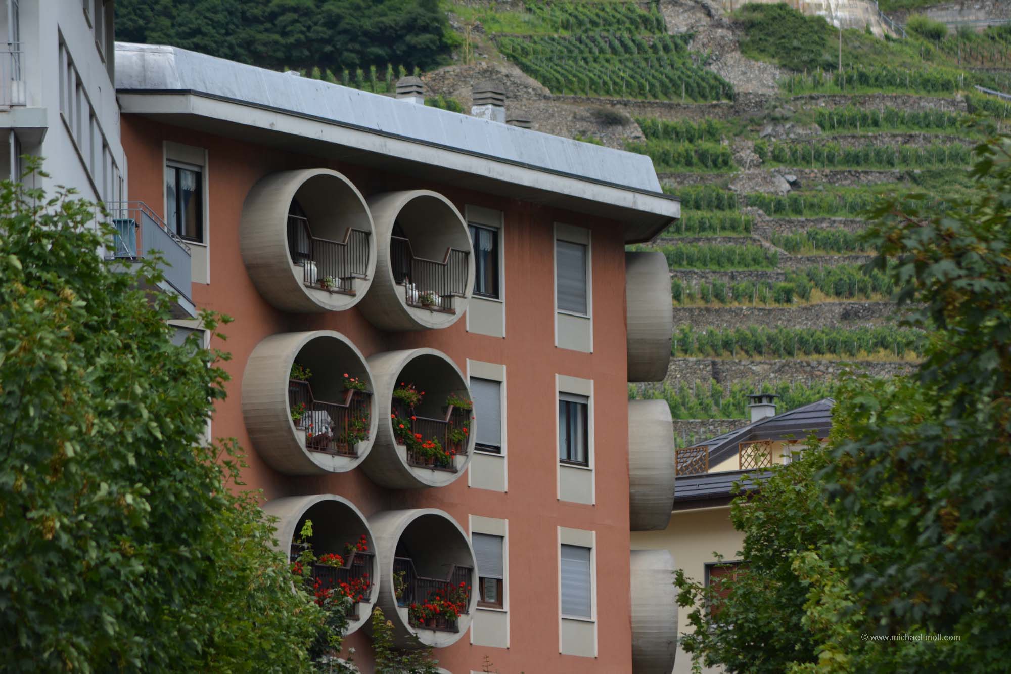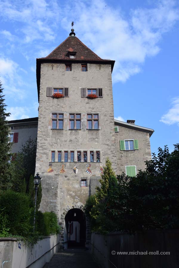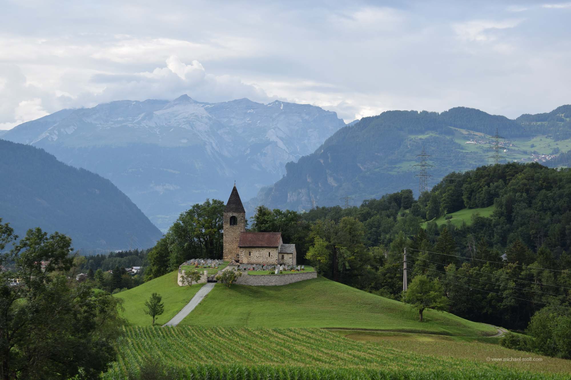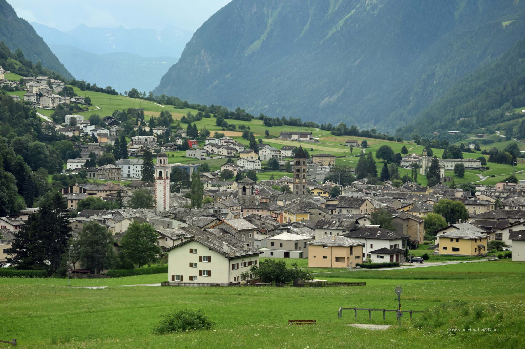 Deutlich erholter setzten wir unsere Reise am nächsten Tag, natürlich wieder in der Frühe, fort. Den Höhenunterschied bis in das Vinschgau legten wir mit Leichtigkeit zurück. Unten im Tal angekommen, war der Motor noch nicht warm, die Bremsen aber auch nicht. Es waren ja nur drei Spitzkehren und ein sanftes Gefälle. Wenn man mal immer so fahren könnte. Wir fuhren zwar in Richtung Reschenpass, aber wir hatten nicht vor, diesen wieder zu überqueren. Denn jetzt wollten wir nun endgültig in die Schweiz hinein. Wir waren ja schon fast eine Woche unterwegs und hatten Schweizer Boden nur an der Dreisprachenspitze betreten. Zuvor wollten wir zwar noch in Glurns kurz halt machen, weil dort eine nette Altstadt wartet. Aber das Stadttor sah nicht einladend aus – zumindest für Wohnmobile. Es wirkte zu klein und wir wollten nichts riskieren. Also machten wir kehrt, ließen uns vom Navi außenherum führen und erreichten den Parkplatz von Glurns auf der anderen Seite der Altstadt. Eigentlich ist man damit schon fast in der Altstadt, denn besonders groß ist sie nicht und besteht im Wesentlichen nur aus dem Stadtplatz. Sieht aber trotzdem nett aus, nur viel Zeit muss man eben dafür nicht einplanen. Auf dem Vinschgauer Radweg gingen wir noch am Ufer des Flusses Etsch entlang, warfen einen Blick auf den dortigen Campingplatz bzw. Stellplatz, bestiegen noch einen Teil der Stadtmauer und starteten dann endlich in die Schweiz.