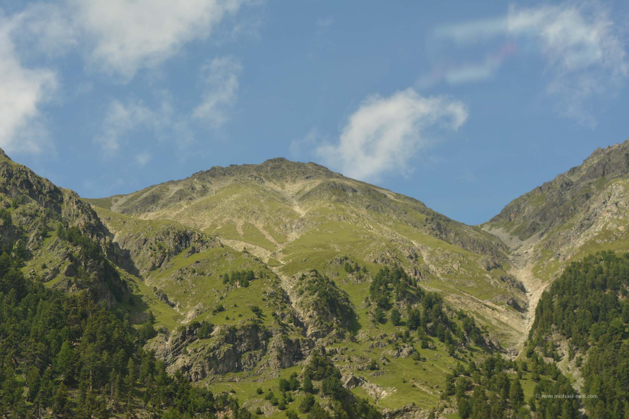 An der Bergstation einer Seilbahn hatten wir den ersten und schönsten Abschnitt des Wanderwegs geschafft. Geschafft war ich mittlerweile aber auch schon. Eigentlich war es nicht anstrengend, aber ich empfand es so. Vermutlich lag es an der für mich ungewohnten Höhe von über 2.500 Metern. An der Seilbahn ging es dann deutlich steiler bergab. Wir tauchten in einen Wald ein und hatten eigentlich nur noch einen Waldweg hinab zu gehen. Von einer schönen Aussicht, wie wir sie zuvor hatten und die bis in das Vinschgau reichte, war nun nichts mehr zu sehen.