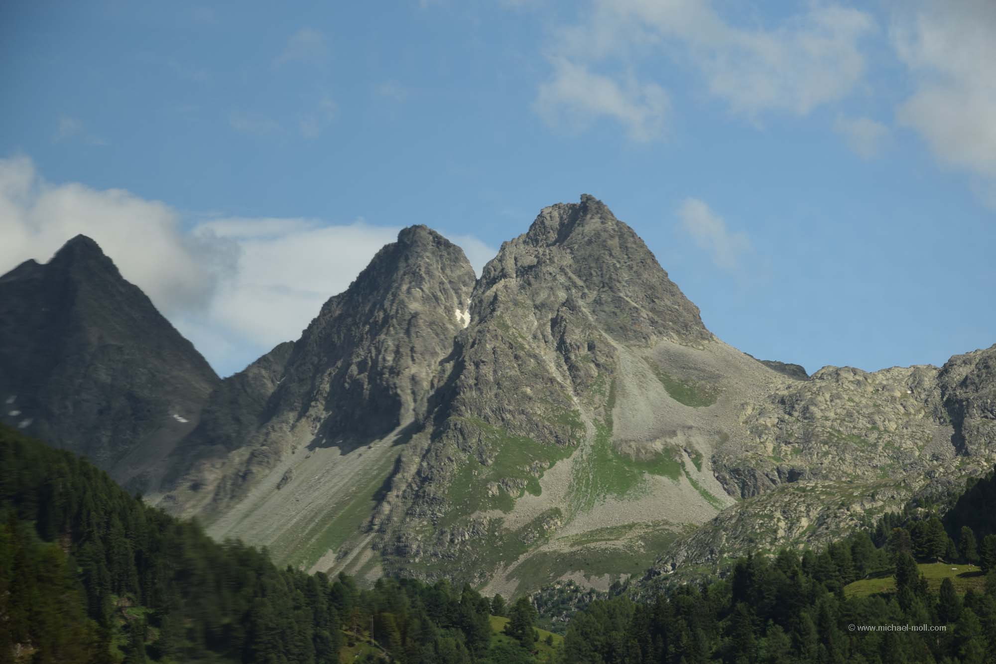 Dafür stapften wir erst einmal hinauf zur Dreisprachenspitze, wo Deutsch, Italienisch und Rätoromanisch aufeinander treffen und sich dementsprechend auch die Grenze zur Schweiz befindet. Von dort sollte der Weg eigentlich ein einfacher sein. Es ging ja immer nur bergab. Am Anfang mit nur einem geringen Gefälle. Wir wanderten auf einem gut erkennbaren Weg, teilweise über Schneefelder, aber meistens auf Schotter. Es ging an einem See vorbei und immer wieder und öfter ließ sich die Sonne blicken. Hatten wir in den letzten Tagen Pech mit dem Wetter, so passte es super, dass wenigstens bei der Wanderung auch mal blauer Himmel zu sehen war. Und nicht nur das, wir konnten sogar auf der gegenüberliegenden Talseite die Spitze des Ortlers entdecken. Als wir diese fotografierten und in das Bild hineinzoomten, erkannten wir sogar relativ deutlich das dortige Gipfelkreuz. Immerhin ist der Ortler der höchste Punkt von Südtirol und war einstmals der höchste Gipfel Österreichs. Dieser Teil der Geschichte wird einem auf dem Wanderweg auch oft erläutert, denn die heute idyllische Landschaft war einstmals ein heftig umkämpftes Gebiet. Zahlreiche Informationsschilder und Überreste diverser Kriegsbauten weisen daraufhin bzw. erinnern daran.