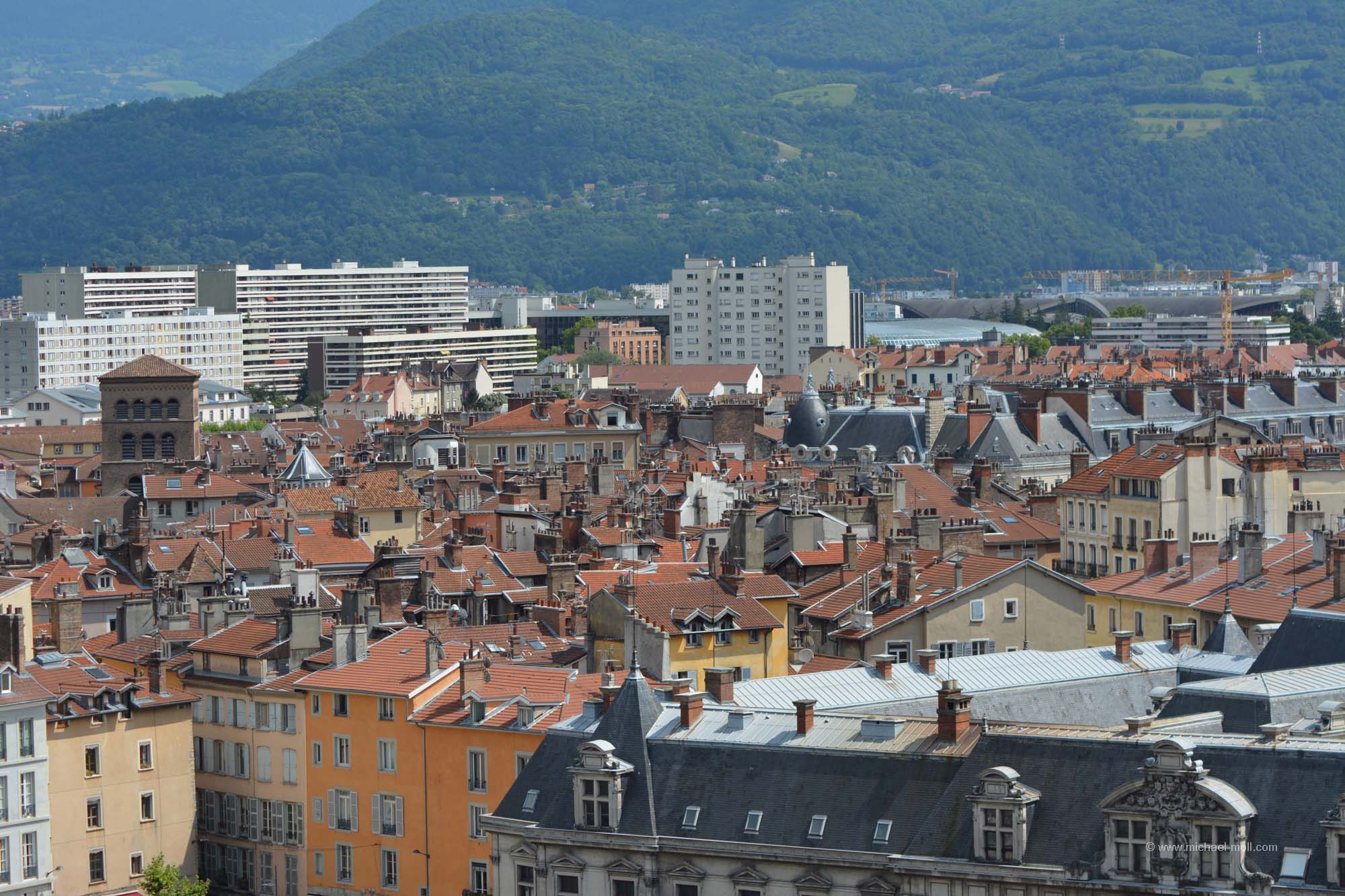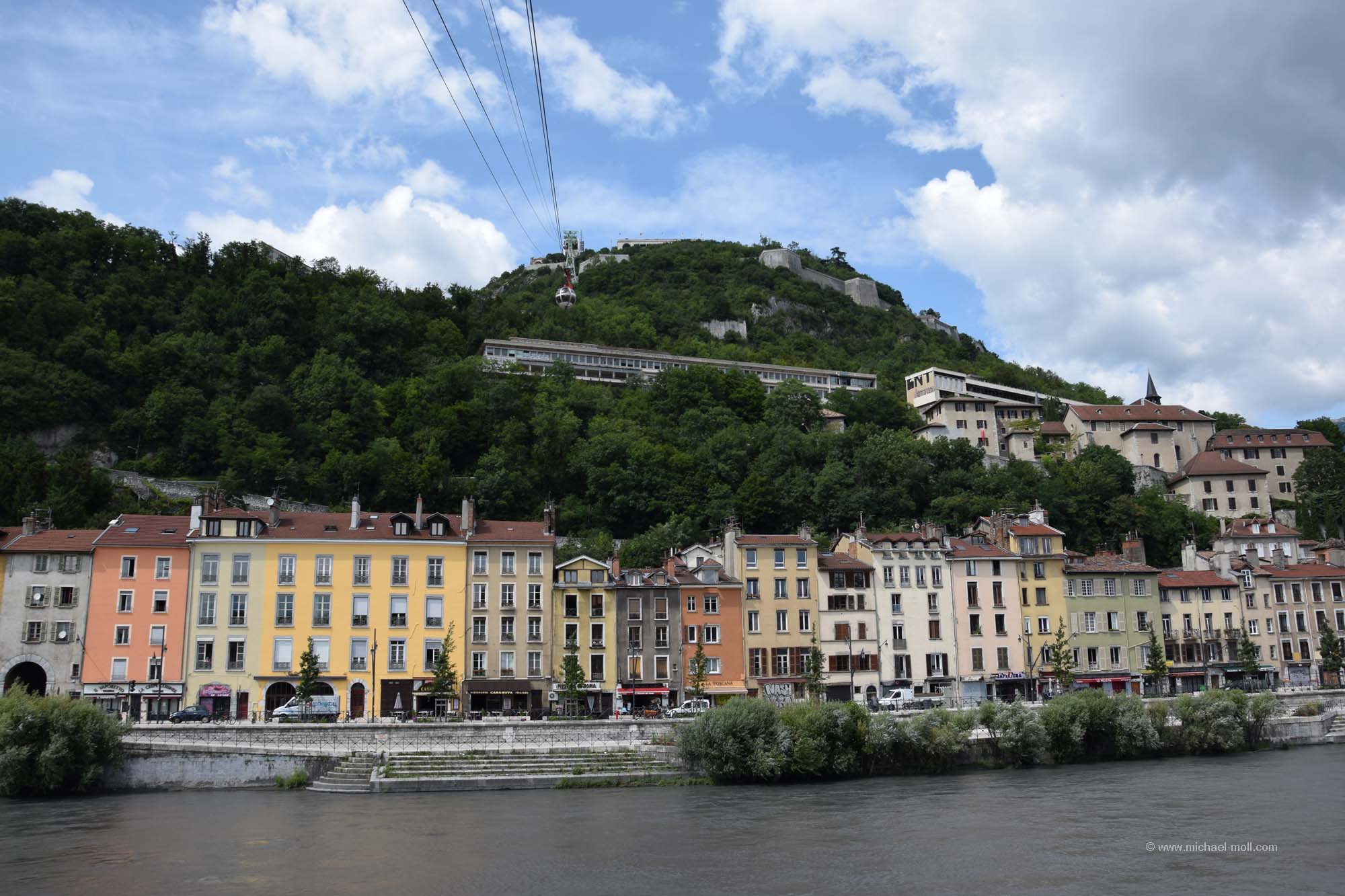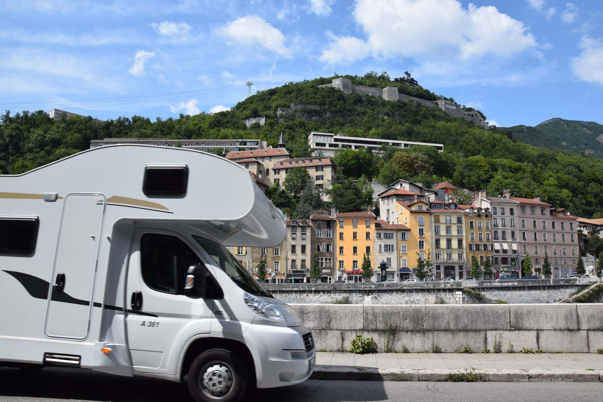 Schnell fuhren wir an Genf vorbei und ich war froh, nicht mit dem Wohnmobil in die Stadt fahren und einen Parkplatz suchen zu müssen. Kurz darauf folgte der Grenzübergang zu Frankreich und es dauerte gar nicht lange, bis wir in Grenoble ankamen. Wir stellten das Wohnmobil auf dem dortigen Großparkplatz ab und schlenderten am Ufer der Isere entlang. Unser Hauptaugenmerk richteten wir auf die dortige Seilbahn, die gleichzeitig eine Art Wahrzeichen der Stadt ist. Sie sieht schon ganz drollig aus mit ihren fünf kleinen Kabinen, doch fahren wir wollten wir damit genauso wenig wie mit jeder anderen Seilbahn auch. Um auf die Festung oberhalb der Stadt Grenoble zu gelangen, gab es auch mehrere steile Wege. Dummerweise entschieden wir uns für den falschen, der uns nur bis zu einer Sackgasse brachte. Für einen weiteren Aufstieg an anderer Stelle hatten wir danach keine Lust mehr. Also beließen wir es bei einem Spaziergang am Flussufer und erfreuten uns zudem daran, dass wir bei der Einfahrt in die Stadt auch ein Hinweisschild auf die Partnerstädte von Grenoble vorfanden. Denn Partnerstadt ist Essen und hatten wir nach Tampere in Finnland, Sunderland in England und Nishnij Nowgorod fast alle Partnerstädte unseres Wohnortes erreicht. Fehlt nur noch Tel Aviv, aber da zieht es uns so schnell nicht hin.