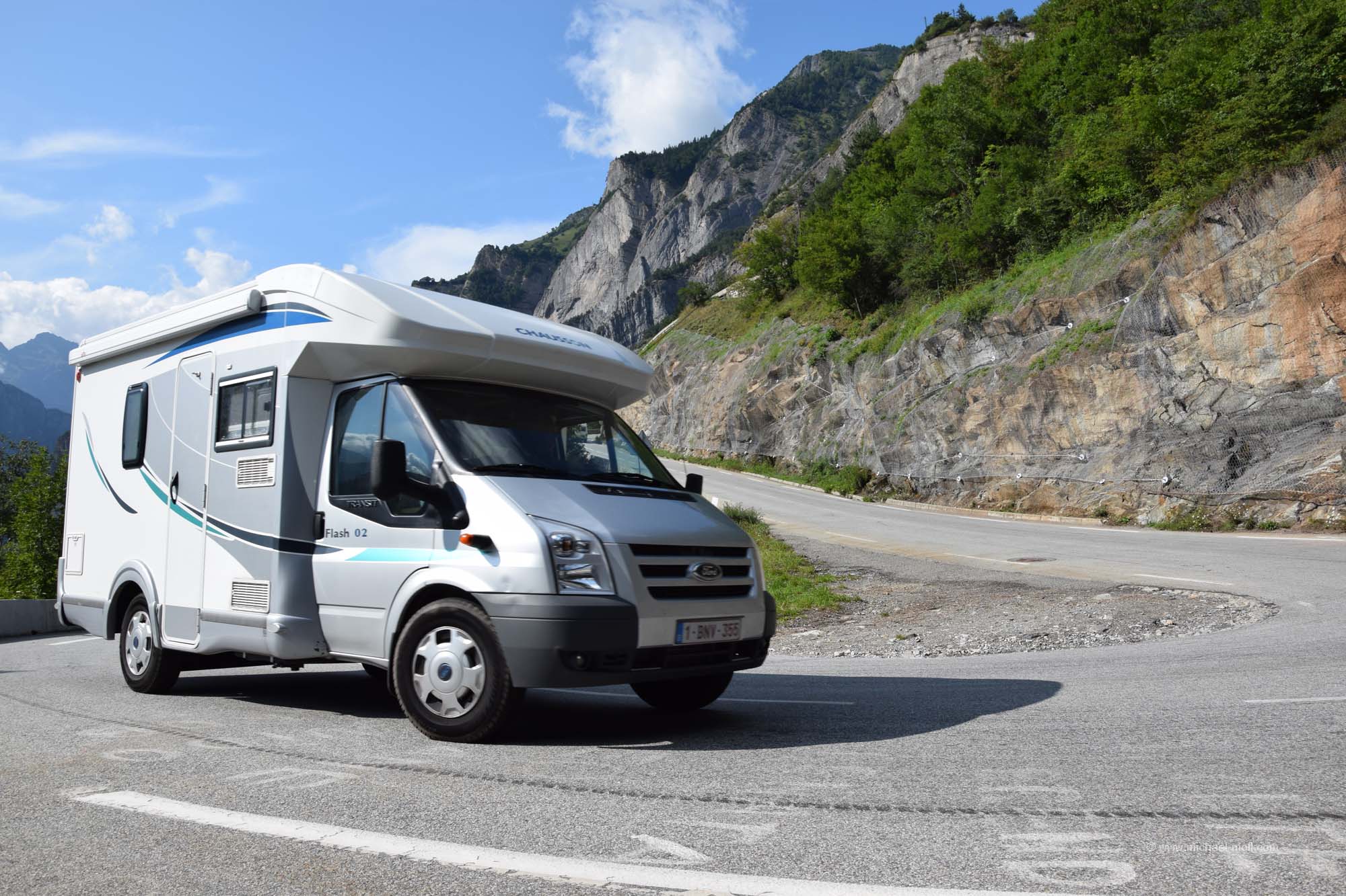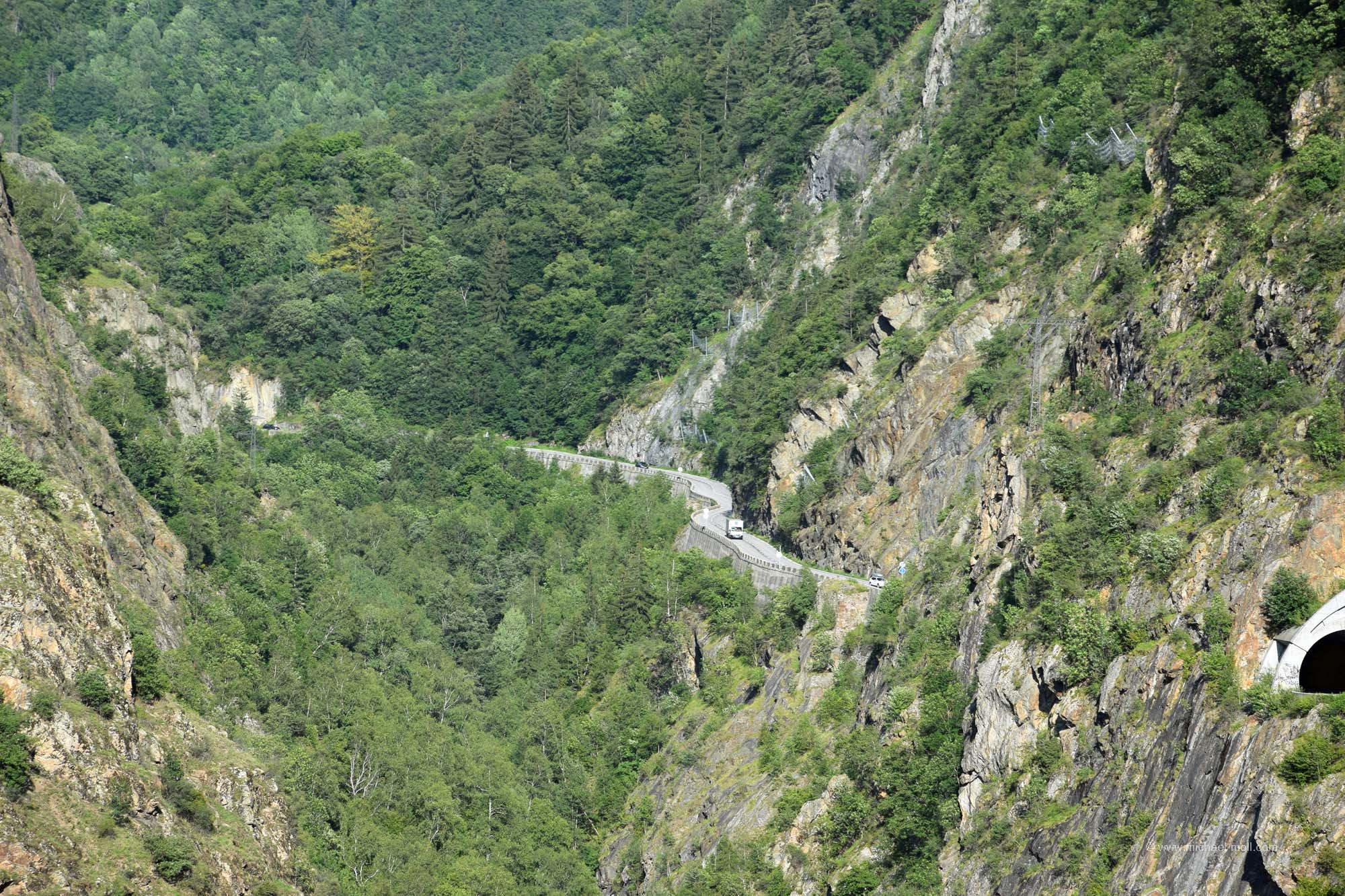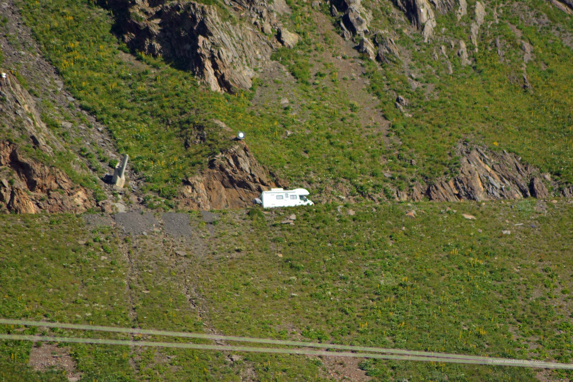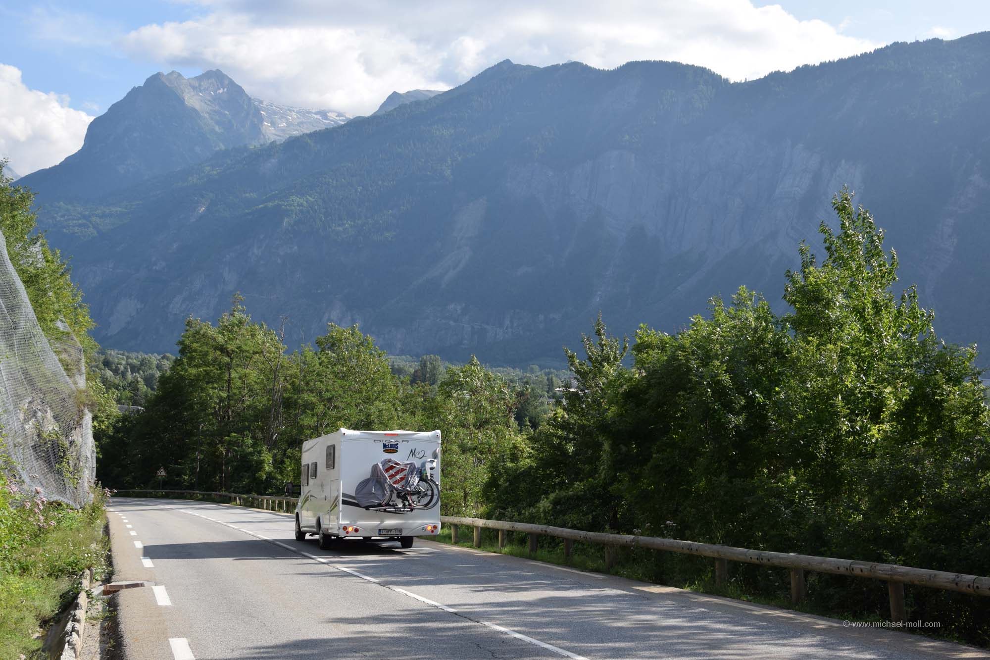 Eine Passabfahrt stand uns noch bevor, bis wir wieder im Rhône-Tal wären. Einen schönen und vor allen Dingen weiten Blick konnten wir bereits vorher von einem Aussichtspunkt aus sehen. Wir erkannten tief im Tal die Stadt Martigny und auch die Bahnstrecke, auf der wir vor wenigen Tagen bis Visp zum Matterhorn fuhren. Aber ansonsten gab uns das Tal nicht viel. Es wirkte sehr zugebaut und wenig ansehnlich. An dem Aussichtspunkt sahen wir auch ein Wohnmobil aus Island. Das fand ich schon erstaunlich. Isländische Autokennzeichen hatte ich noch nie gesehen und ich behaupte, dass man nicht oft ein isländisches Fahrzeug auf dem europäischen Kontinent zu Gesicht bekommt. Danach ging es an die Abfahrt, die ich dieses Mal als ziemlich steil empfand.