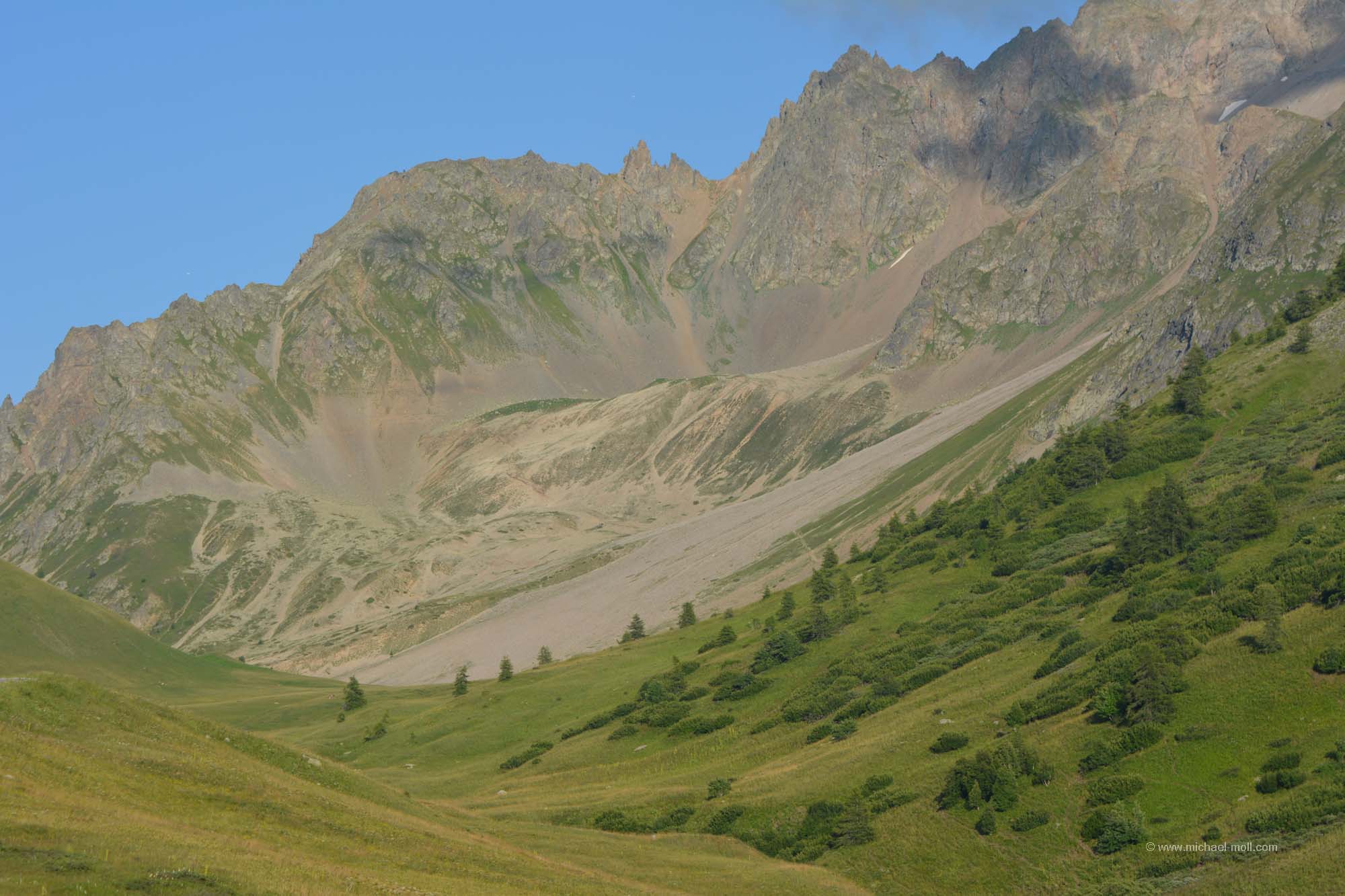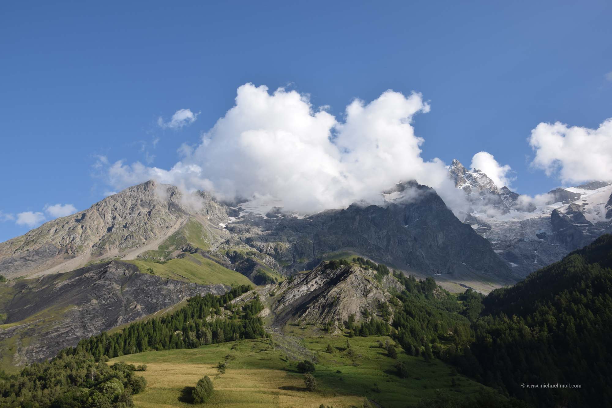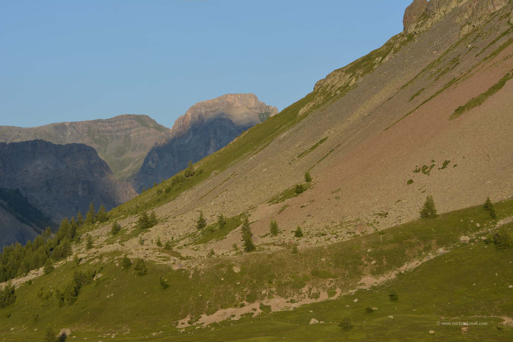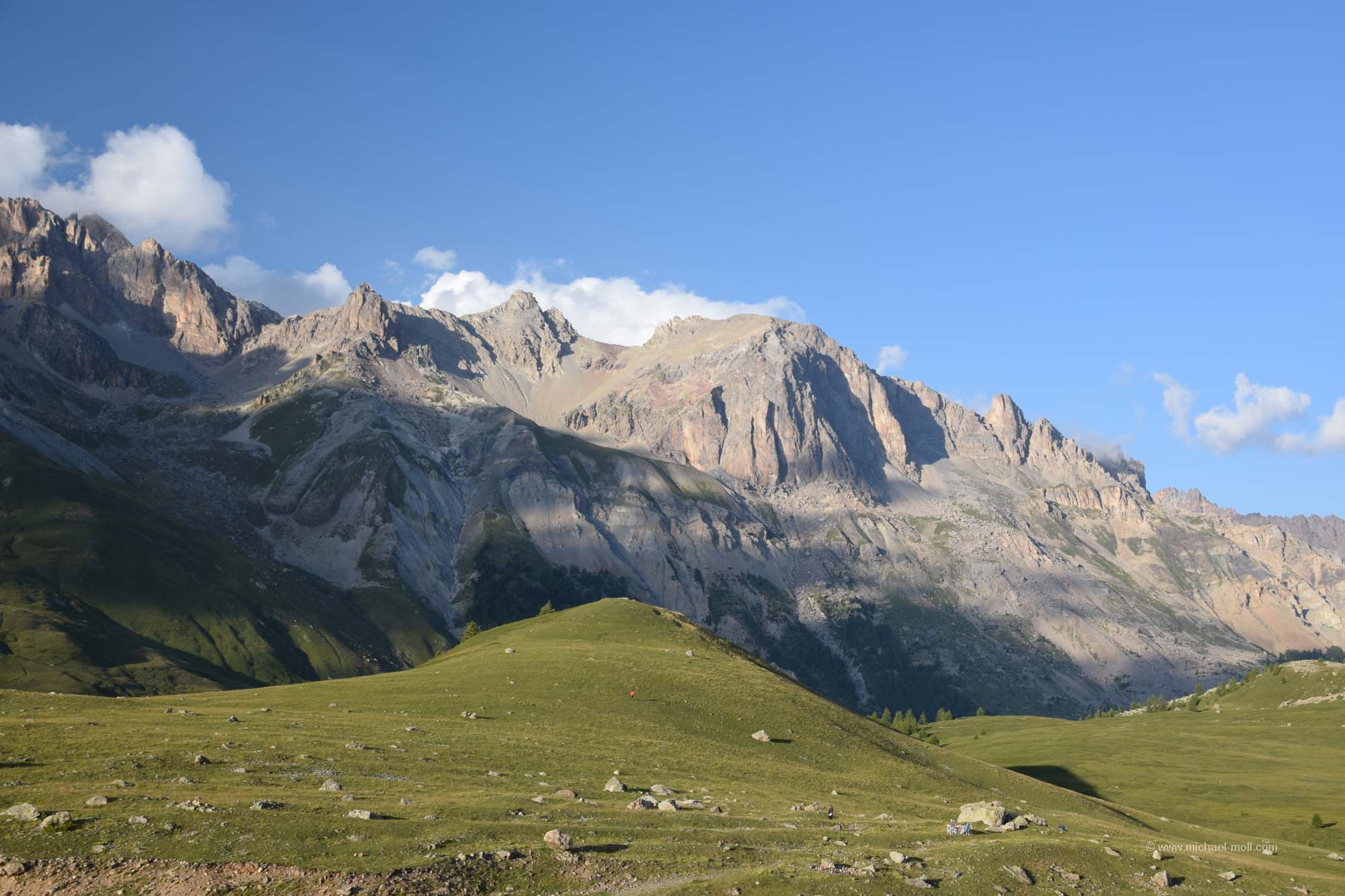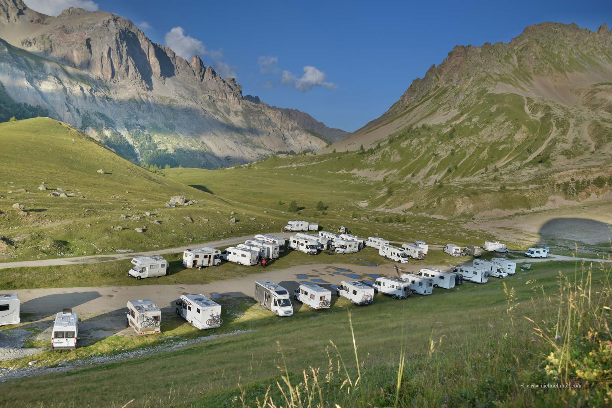 Auf der D1091 fuhren wir weiter, machten einen kurzen Stopp in La Grave und waren ganz angetan von der tollen Landschaft der französischen Alpen. So schön hatte ich es mir dann doch nicht vorgestellt. Unser Tagesziel war jedoch ein Passübergang am Rande des Nationalparks des Écrins. Wir hatten in den Tagen zuvor im Netz einen schönen Stellplatz gefunden, den wir ansteuern wollten. Nach den vielen Campingplatzübernachtungen der letzten Tage waren wir Stellplätze oder freies Stehen ja schon gar nicht mehr gewohnt. Unser Weg führte immer weiter bergauf und wir durchquerten gelegentlich auch mal eine Spitzkehre, während der Himmel über uns fast wolkenfrei war. Es passte einfach alles. Und dann kam der Col du Lautaret mit seinem Stellplatz. Dieser war zwar total voll, aber ein kleines Plätzchen am Rande fanden wir schon noch. Ein altes verwittertes Schild spricht zwar davon, dass Camping verboten sei, aber zu sehen ist nur ein durchgestrichenes Zelt und wie es schien, hielt sich kaum einer daran. Wir machten noch ein paar kleinere Spaziergänge, aber für größere Wanderungen reichte die Zeit nicht mehr, da die Sonne schon bald hinter den Gipfeln verschwand.