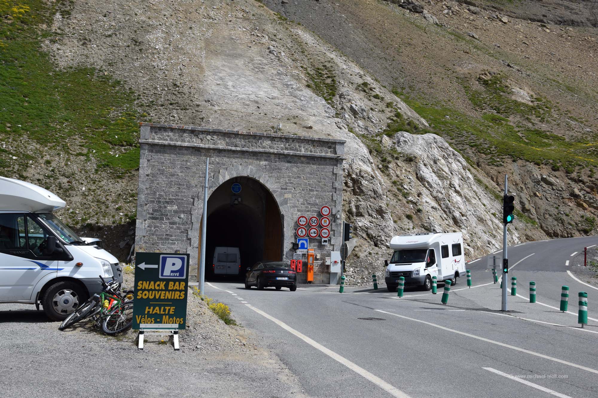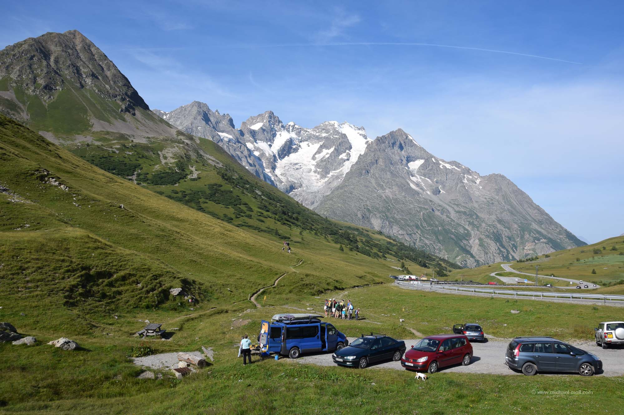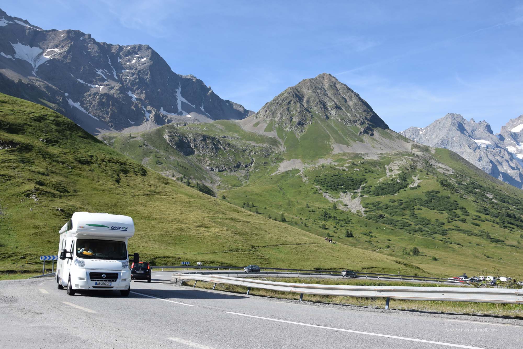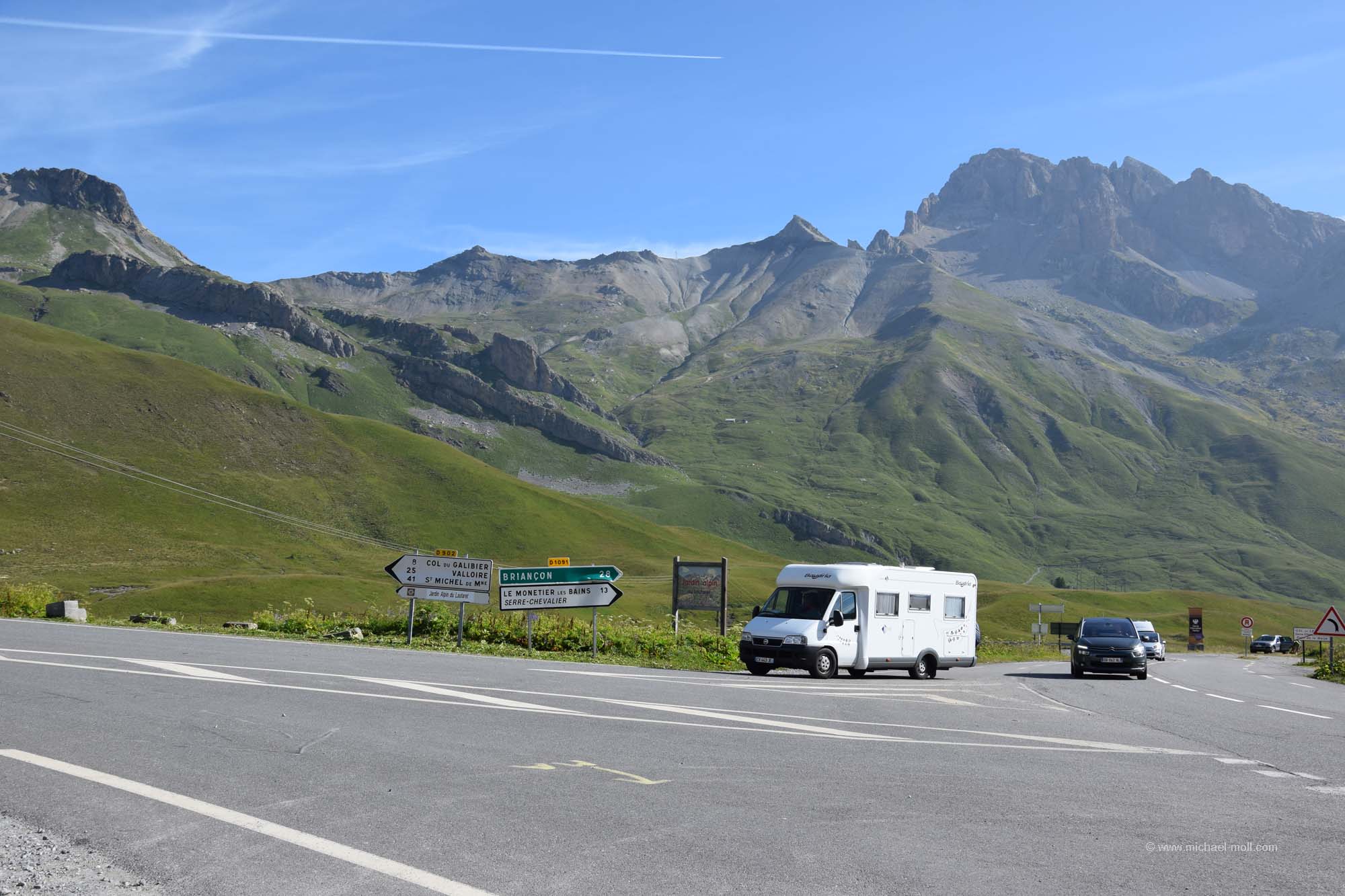 Am nächsten Morgen überlegten wir hin und her, wo wir lang fahren sollten. Es reizte uns natürlich total die Fahrt auf den Col du Galibier. Aber das würde bedeuten, direkt mit kaltem Motor die nächste Passfahrt anzugehen. Nur wäre das die kürzeste Strecke gewesen und außerdem lockte natürlich die tolle Aussicht bei wolkenlosem Himmel. Also frühstückten wir kurz, machten noch einen schnellen Rundgang durch den Souvenirladen und versuchten am Hang des Berges andere Fahrzeuge zu erkennen, um zu sehen, wo sie entlang fahren und wie lange sie brauchen würden. Danach stand unser Entschluss fest: Auch wir wollten dort hinauf. Wir hätten sonst kaum eine andere Möglichkeit mehr auf dieser Reise, bis in diese Höhe von rund 2.700 Metern vorzudringen. Und siehe da, so dramatisch war die Auffahrt gar nicht. Der Gipfel des Col du Galibier ist untertunnelt und Fahrzeuge bis zu einem Gewicht von maximal dreieinhalb Tonnen dürfen bis ganz oben hinauf. Das ließen wir uns dann nun auch nicht mehr nehmen. Der kleine Parkplatz dort oben war zwar rappelvoll, aber eine kleine Fläche am Straßenrand war genau wie für uns gemacht. Und wenn der Wagen ein wenig im Weg stehen sollte, ist das auch nicht so schlimm, denn wer hierher fährt, der fährt aus denselben Gründen hierhin, nämlich um anzuhalten und um die Aussicht zu genießen. Man kann noch zu Fuß ein paar Meter höher gehen und hat einen wirklich sagenhaften Blick. In nördliche Richtung sieht man sogar das Massiv des Mont Blanc, das sich in über 90 Kilometern Entfernung befindet. Ein wirklich tolles Erlebnis.