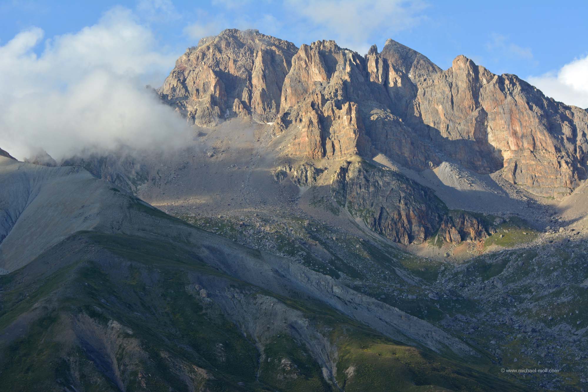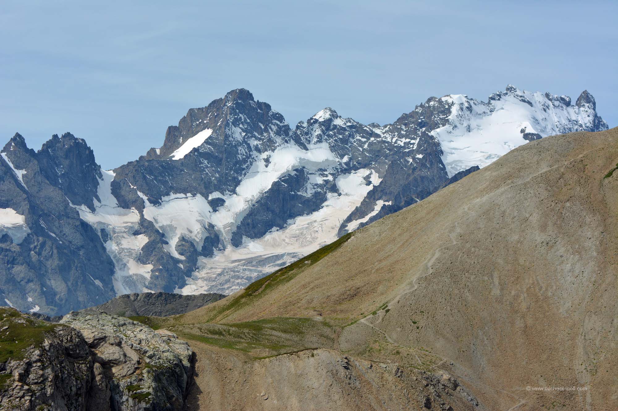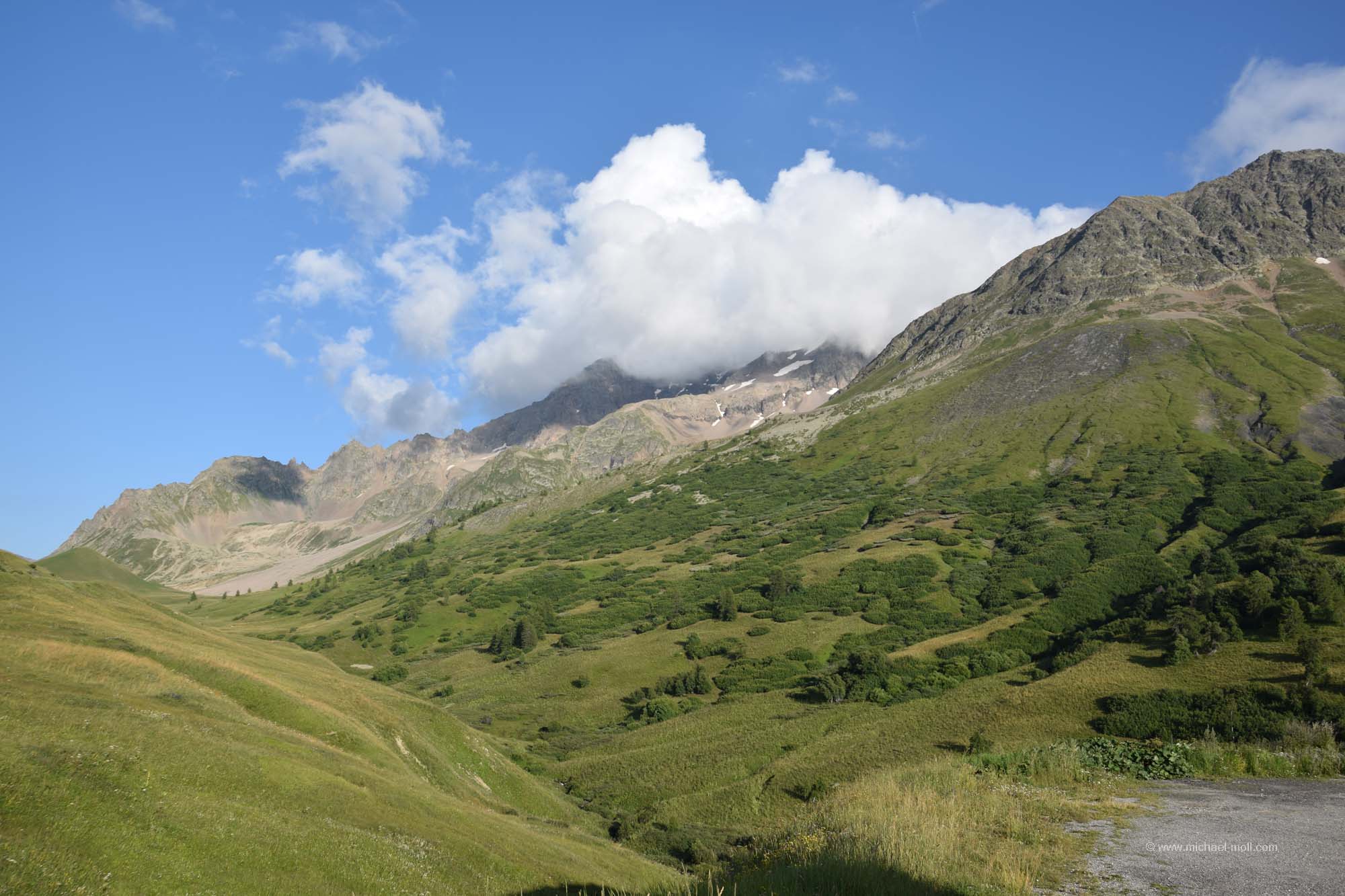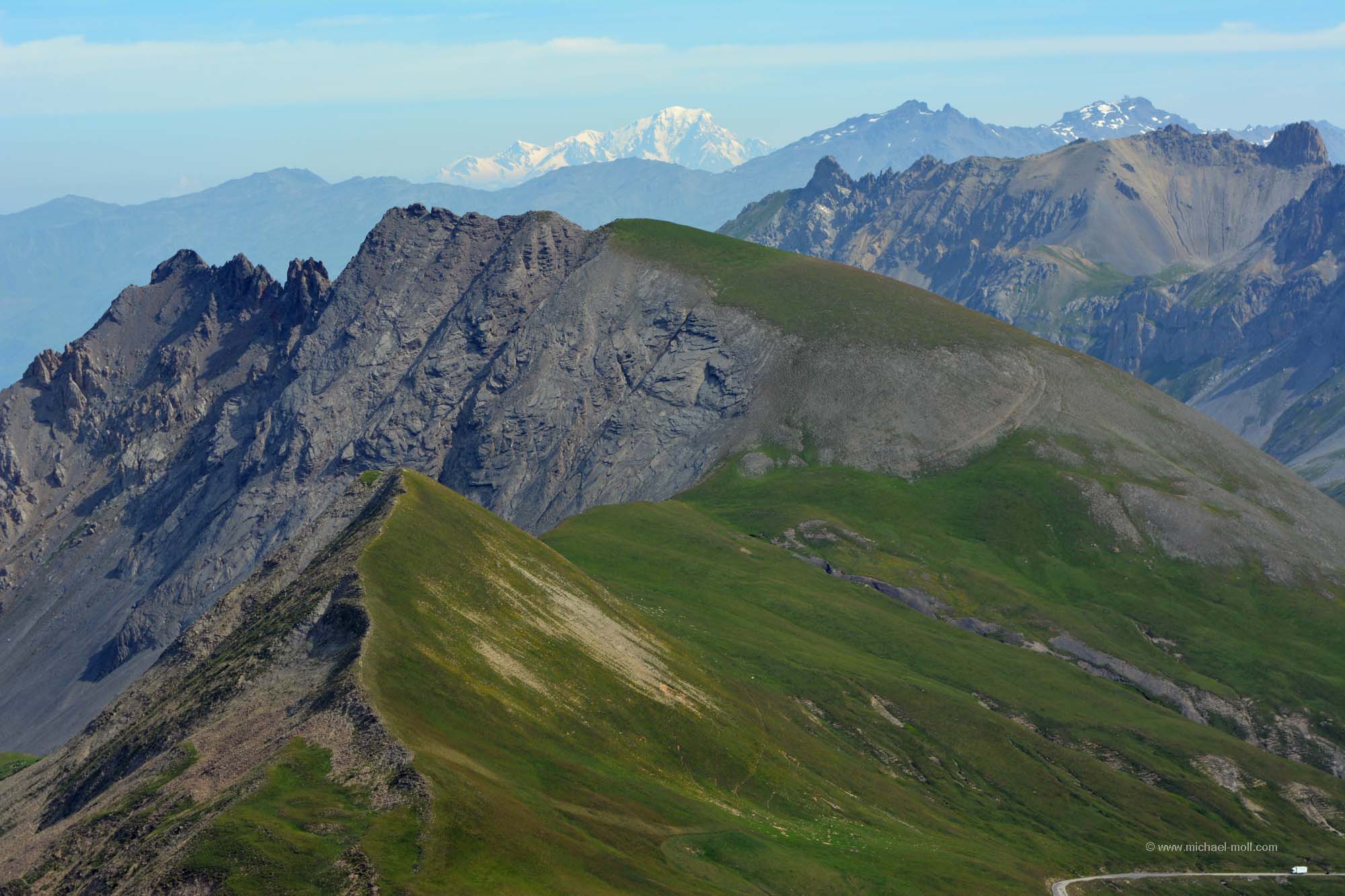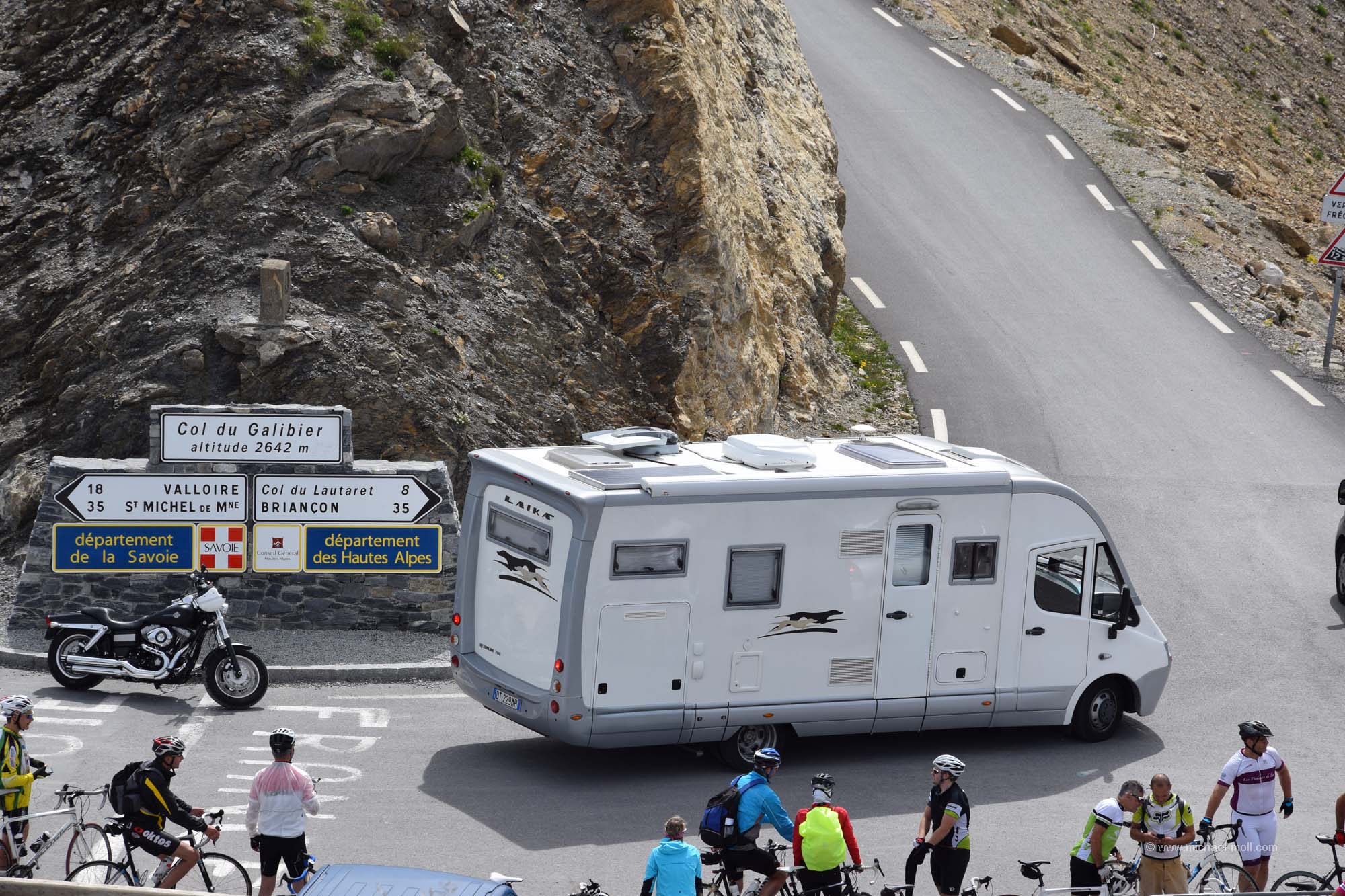 Am nächsten Morgen überlegten wir hin und her, wo wir lang fahren sollten. Es reizte uns natürlich total die Fahrt auf den Col du Galibier. Aber das würde bedeuten, direkt mit kaltem Motor die nächste Passfahrt anzugehen. Nur wäre das die kürzeste Strecke gewesen und außerdem lockte natürlich die tolle Aussicht bei wolkenlosem Himmel. Also frühstückten wir kurz, machten noch einen schnellen Rundgang durch den Souvenirladen und versuchten am Hang des Berges andere Fahrzeuge zu erkennen, um zu sehen, wo sie entlang fahren und wie lange sie brauchen würden. Danach stand unser Entschluss fest: Auch wir wollten dort hinauf. Wir hätten sonst kaum eine andere Möglichkeit mehr auf dieser Reise, bis in diese Höhe von rund 2.700 Metern vorzudringen. Und siehe da, so dramatisch war die Auffahrt gar nicht. Der Gipfel des Col du Galibier ist untertunnelt und Fahrzeuge bis zu einem Gewicht von maximal dreieinhalb Tonnen dürfen bis ganz oben hinauf. Das ließen wir uns dann nun auch nicht mehr nehmen. Der kleine Parkplatz dort oben war zwar rappelvoll, aber eine kleine Fläche am Straßenrand war genau wie für uns gemacht. Und wenn der Wagen ein wenig im Weg stehen sollte, ist das auch nicht so schlimm, denn wer hierher fährt, der fährt aus denselben Gründen hierhin, nämlich um anzuhalten und um die Aussicht zu genießen. Man kann noch zu Fuß ein paar Meter höher gehen und hat einen wirklich sagenhaften Blick. In nördliche Richtung sieht man sogar das Massiv des Mont Blanc, das sich in über 90 Kilometern Entfernung befindet. Ein wirklich tolles Erlebnis.