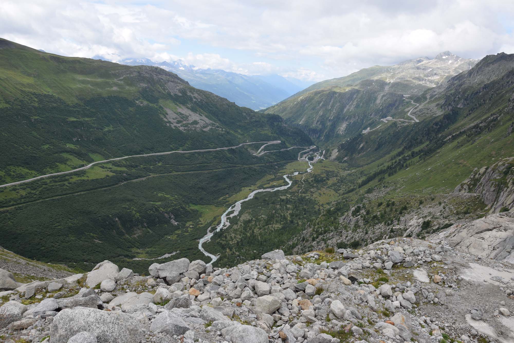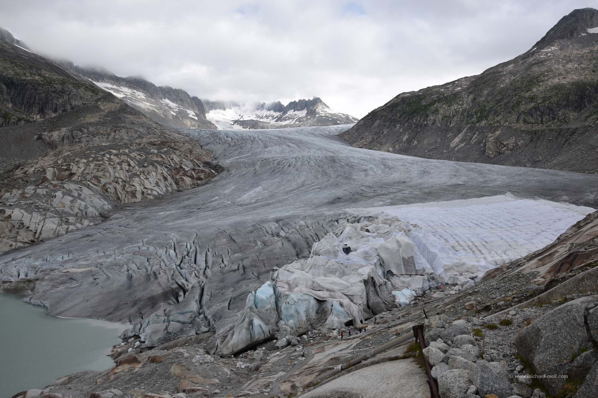 Nach der Nacht stand unser letzter, unbekannter Pass bevor. Denn wir wollten wenigstens auch auf den Furkapass hinauf. Dort befindet sich nämlich der Rhône-Gletscher, der auch als Quelle der Rhône bezeichnet werden kann. Und diesen Gletscher kann man auch von innen begehen. Das wollten wir uns anschauen. Doch das bedeutete, dass wir zunächst den Grimselpass verlassen mussten, um direkt im Tal die nächste Passstraße hinauf zu fahren. Irgendwie schon doof, da man sich fast schon einem Pass zum anderen zuwinken kann. Doch die Fahrt verlief ereignis- und problemlos. So standen wir wenig später am Souvenirladen kurz unterhalb des Furkapasses und kauften uns neben Andenken auch noch Tickets für den Gletscher. Das kam uns, ehrlich gesagt, ein wenig doof vor. Denn wie kann ein Gletscher Privateigentum sein? Bei einer Wanderung käme man sicherlich auch an den Gletscher heran. Außerdem waren die Damen in dem Laden nicht besonders freundlich. Und als wir dann sagten, dass wir mit Karte zahlen wollten, da war es sowieso schon zu viel. In einem der modernsten Länder, in denen wir bisher keine Probleme hatten, wurde auf einmal die normale EC-Karte in einer gut besuchten Sehenswürdigkeit abgelehnt. Man würde nur Kreditkarte nehmen. Aber mit dieser konnten wir nicht elektronisch bezahlen, sondern noch mit der klassischen Variante, dass die Karte in dieses Ritsch-Ratsch-Gerät eingelegt wird, um auf Blaupapier einen Abdruck der Zahlenfolge zu erhalten.