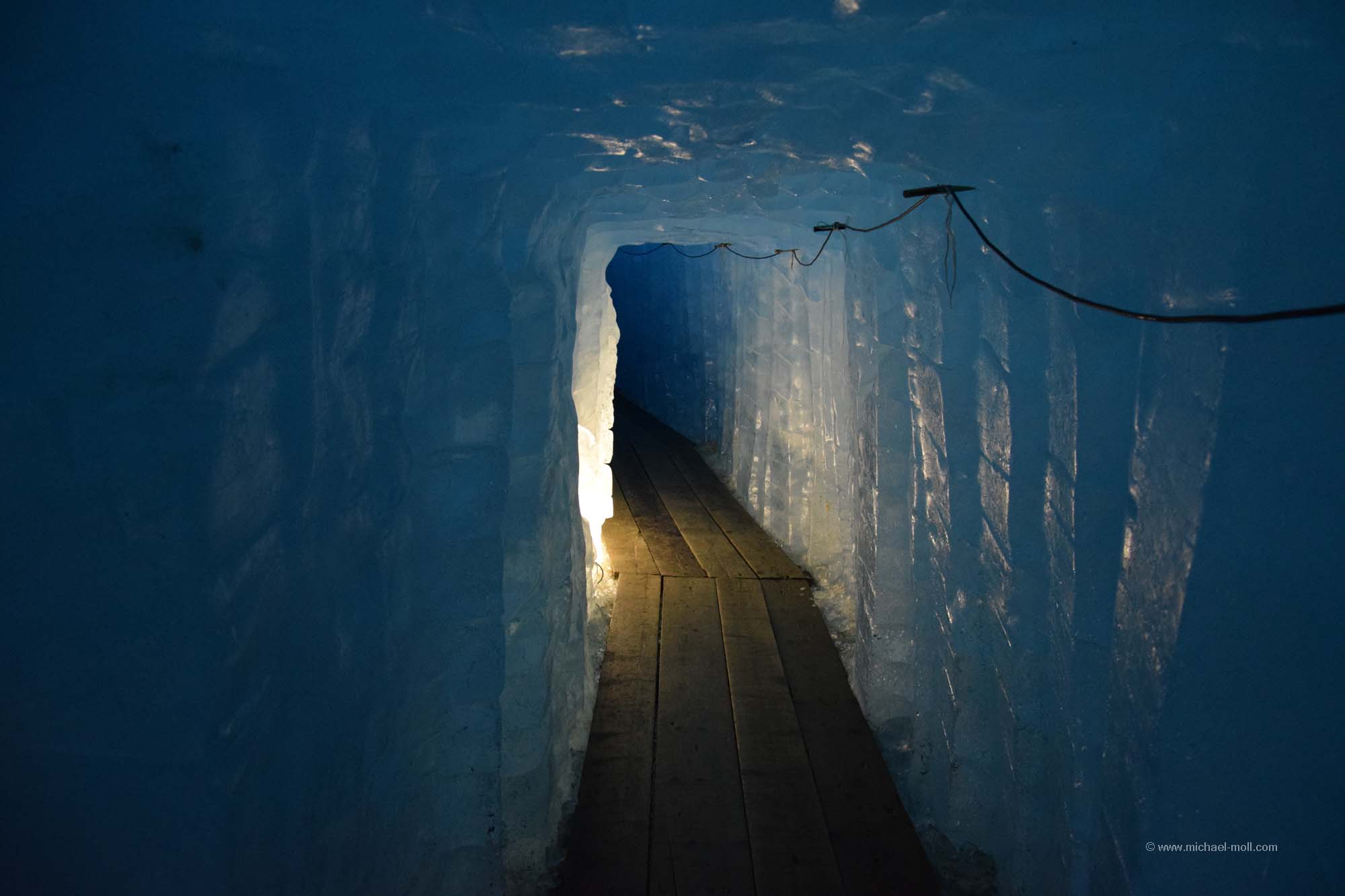 Diese vorsintflutliche Zahlaktion passte aber zu dem Laden, der ebenfalls einen völlig veralteten Eindruck hinterließ. Das angerostete Gebäude schien nur von einer sehr laut rappelnden Schiebetür und einem quietschenden Drehkreuz gehalten zu werden. Meiner Meinung nach ein prima Beispiel, warum man über den eigenen Tellerrand hinwegblicken und sich auch mal die Konkurrenz anschauen sollte. Das alles trübte natürlich ein wenig den Eindruck. Besser wurde es in Richtung Gletscher aber auch nicht. Denn die Stelle, die untertunnelt wurde, ist mit riesigen Planen abgedeckt, damit der Gletscher an der Stelle nicht zu schnell schmilzt. Das sieht zum einen total hässlich aus und nimmt dem Gletscher auch noch seine Natürlichkeit. Leider war es zu diesem Zeitpunkt schon zu spät, doch ich fragte mich, warum ich unbedingt einen sterbenden Gletscher von innen betrachten müsste. Und ich fragte mich, warum man einen Gletscher, der in Zukunft komplett verschwunden sein wird, jedes Jahr aufs Neue untertunneln muss. Die Arbeit ist natürlich hart, aber ich habe den Sinn darin nicht mehr gesehen. In dem kleinen Tunnel befanden sich Neonlampen, die den Gletscher aufwärmten und weitere Löcher in das Eis einbrachten, während ich mich fragte, wofür das alles? Überall ist man bemüht, der Erderwärmung entgegen zu treten und hier wird der Gletscher mit Absicht zerstört. Nein, das gefiel mir nicht und ich bereute es sehr, mir hierfür ein Ticket gekauft zu haben.