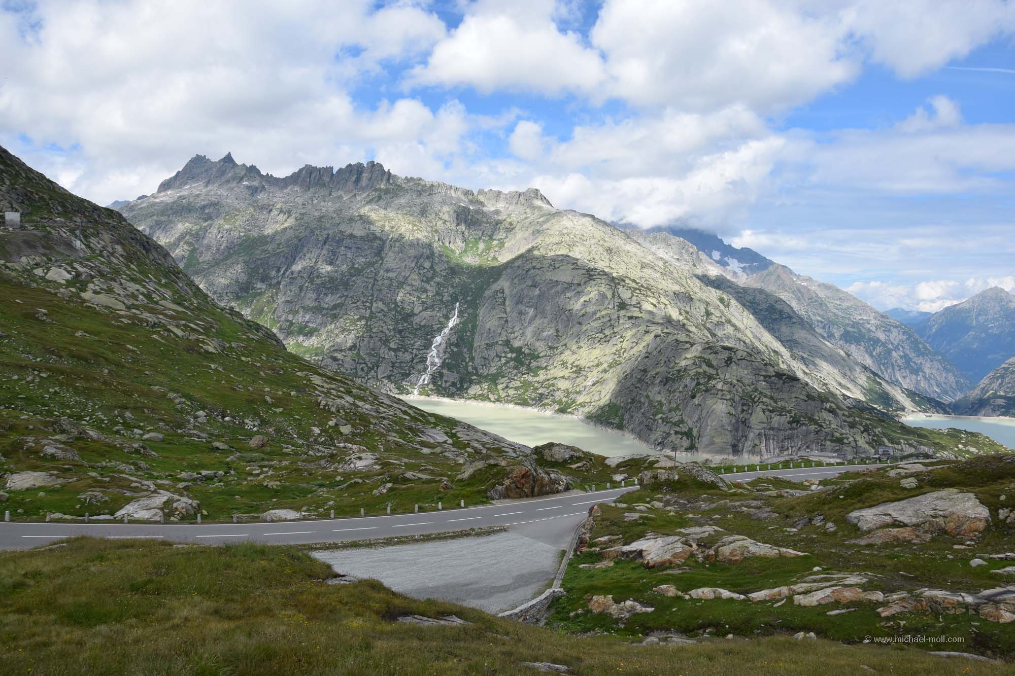 Bei der Abfahrt vom Furkapass hörte ich wieder diese seltsamen Geräusche von der Lenkung, besonders dann, wenn ich in den Spitzkehren weit einschlagen musste. In Gletsch hielt ich kurz an, konnte aber nichts feststellen. Also fuhren wir langsam wieder auf den Grimselpass hinauf, man hat ja sonst nichts zu tun als immer nur die Pässe rauf und runter zu fahren. Dort oben fuhren wir am Murmeltierpark vorbei, hielten auf der anderen Seeseite und machten noch einige Aufnahmen von der tollen Landschaft, bevor wir unseren letzten nennenswerten Pass auf dieser Reise nordwärts verließen. Bei der Abfahrt dann das gleiche Spiel: Seltsame Geräusche von der Lenkung – gleichzeitig in einem kurzen Tunnel Gestank von überhitzten Bremsen. Dabei hatte ich die Bremse kaum genutzt. Wir fuhren sofort rechts ran und schauten nochmal genauer nach.