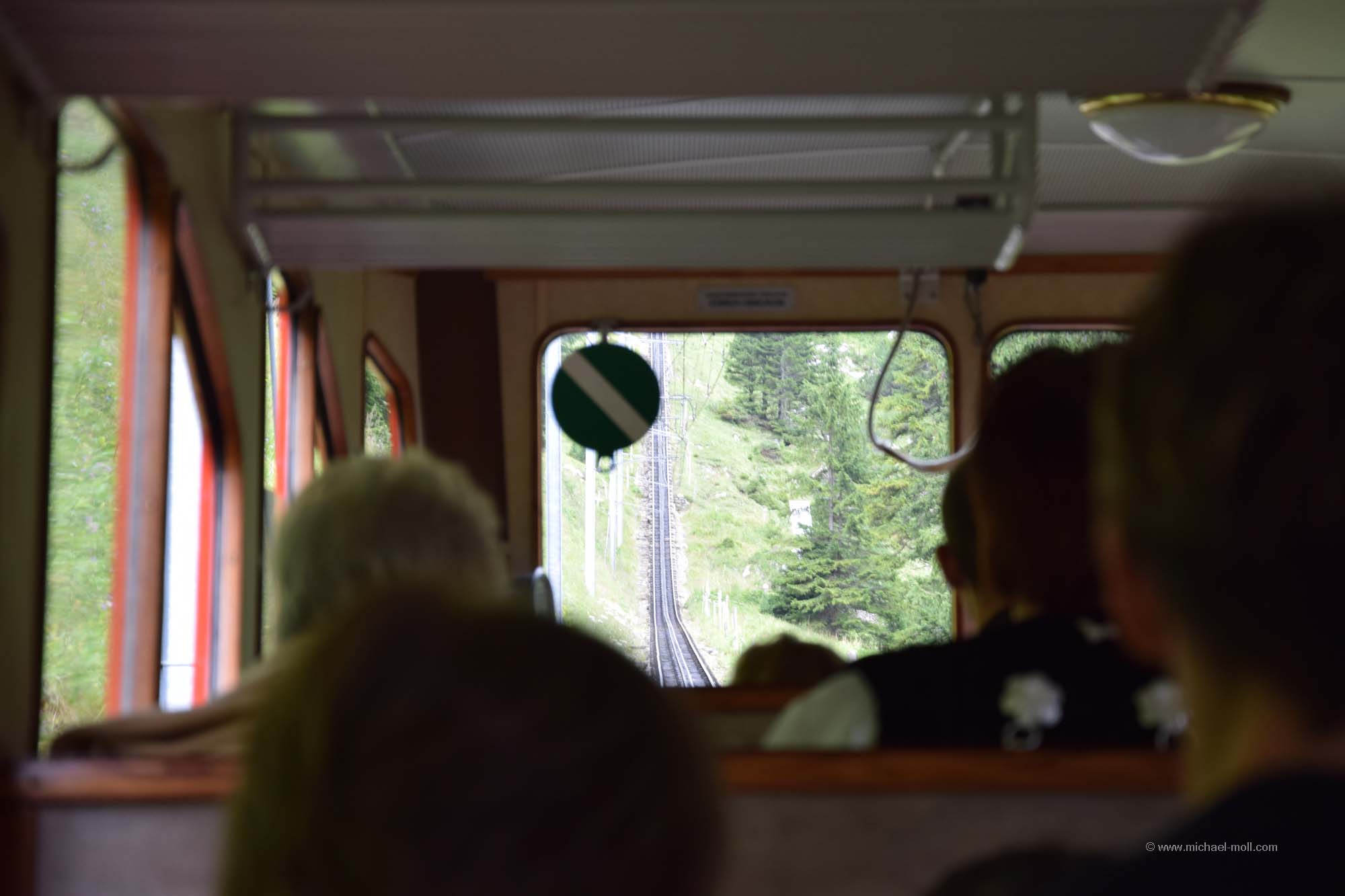 Das einzige Problem war jedoch, dass wir nur noch 5 Franken in der Tasche hatten, nichts zu trinken, nichts zu essen und mit einfachen Turnschuhen auch nicht wirklich das richtige Schuhwerk an hatten. Außerdem fehlte uns Regenkleidung, falls das Wetter umschlagen sollte. Doch als wir oben ankamen, die Fotos machten, die Aussicht genossen und uns daran aufmachten, zurück ins Tal zu kehren, sahen wir das Wanderschild, dass uns versprach, dass wir in nur drei Stunden zu Fuß am Wohnmobil sein könnten. Wir investierten die letzten fünf Franken in eine Halbliterflasche Wasser und machten uns auf den Weg. Und es machte uns Spaß. Im Hochgebirge war es sogar ziemlich einfach. Dem breiten Weg brauchte man ja nur geradeaus und im Zickzack zu folgen. Gelegentlich kamen uns die Zahnradbahnen entgegen oder überholten uns. Aber ab der Waldgrenze wurde es dann doch etwas ungemütlich. Durch den vielen Regen der vergangenen Tage war der Waldweg nämlich total aufgeweicht und an manchen Stellen so glatt, dass wir uns beim Bergab nur von Baumstamm zu Baumstamm hangeln konnten. Es wurde in der Tat noch richtig anstrengend. Aber im Gesamtpaket hat es Spaß gemacht und es war ein schöner Abschied von den Alpen.