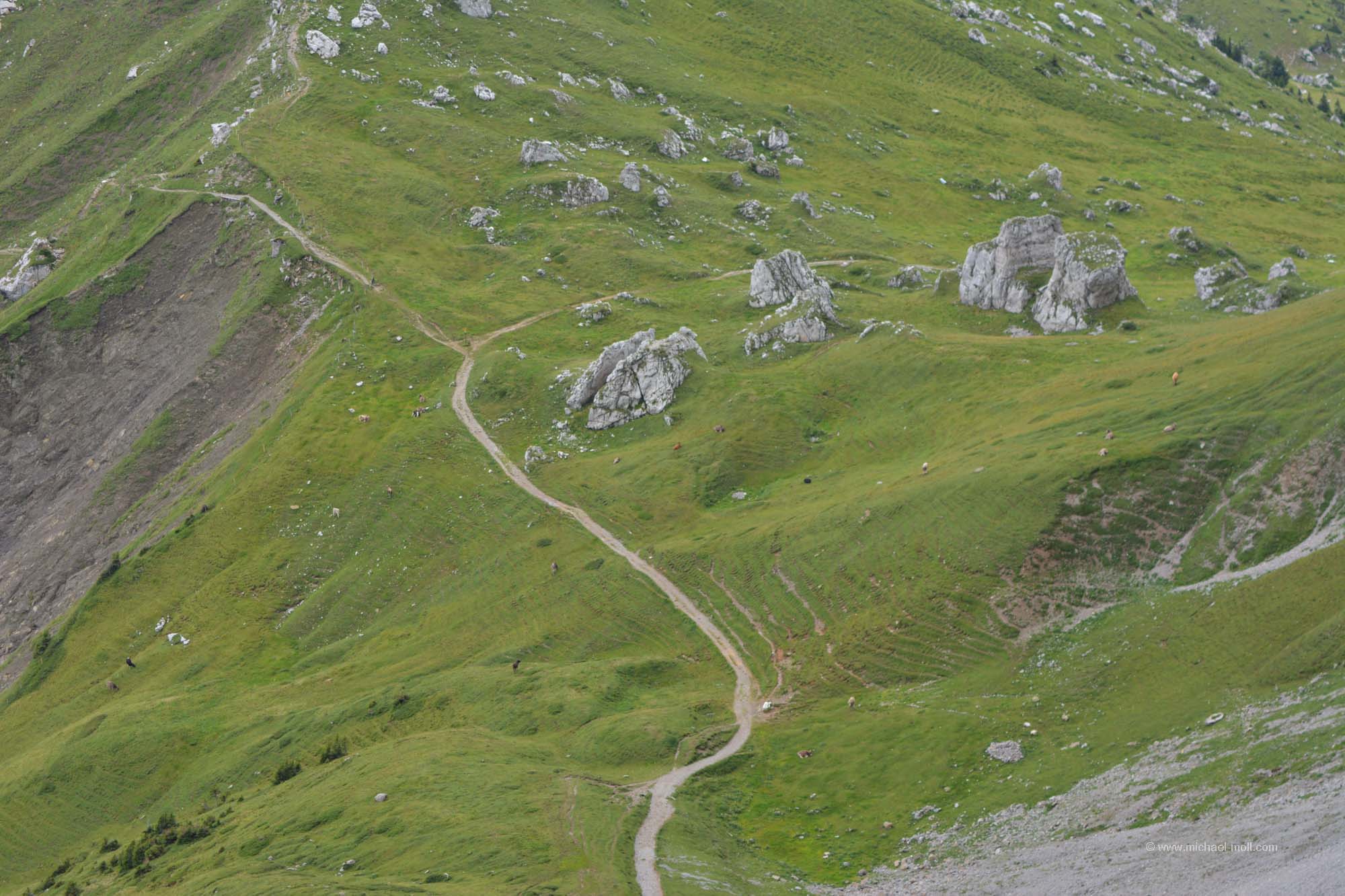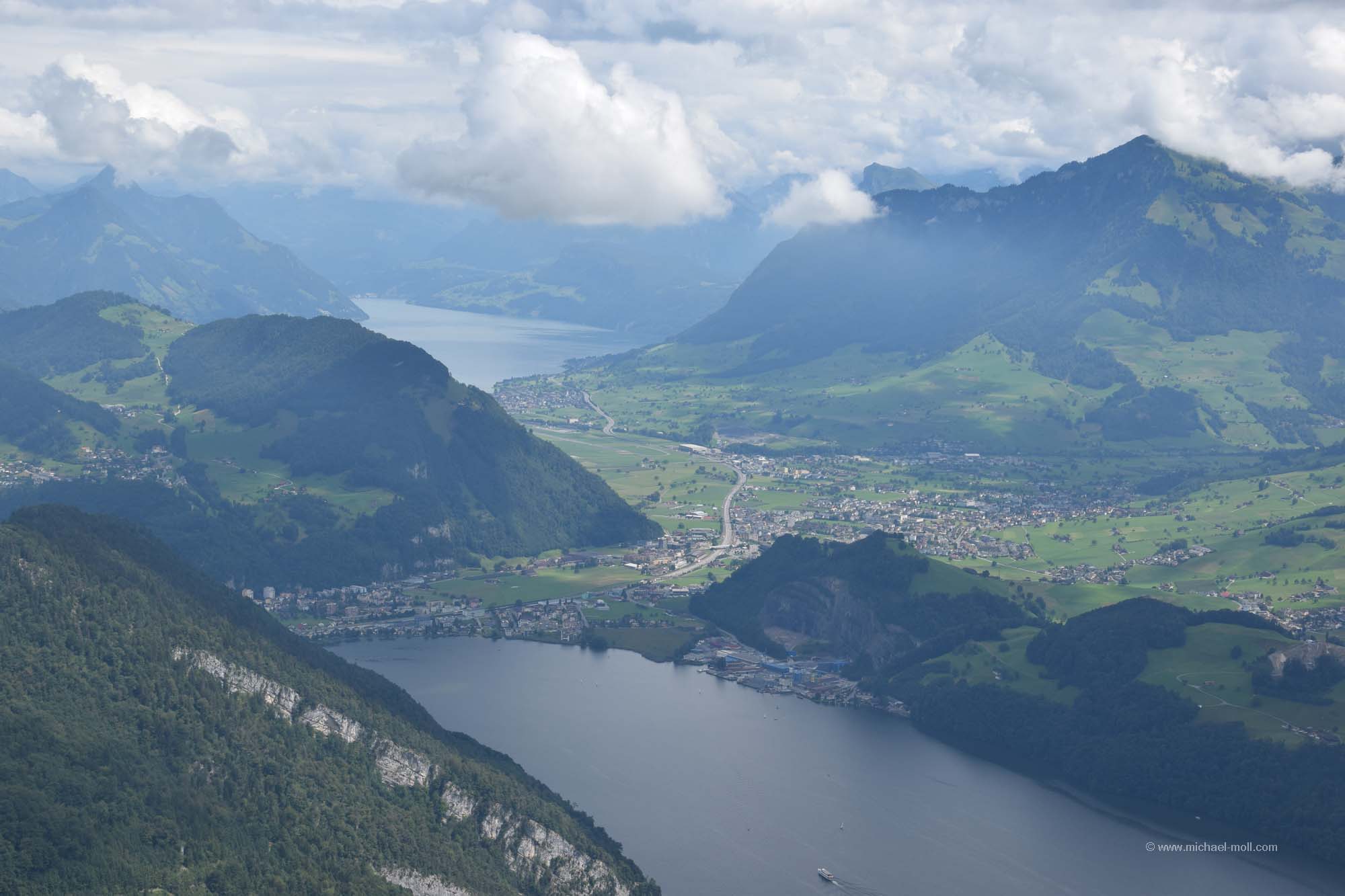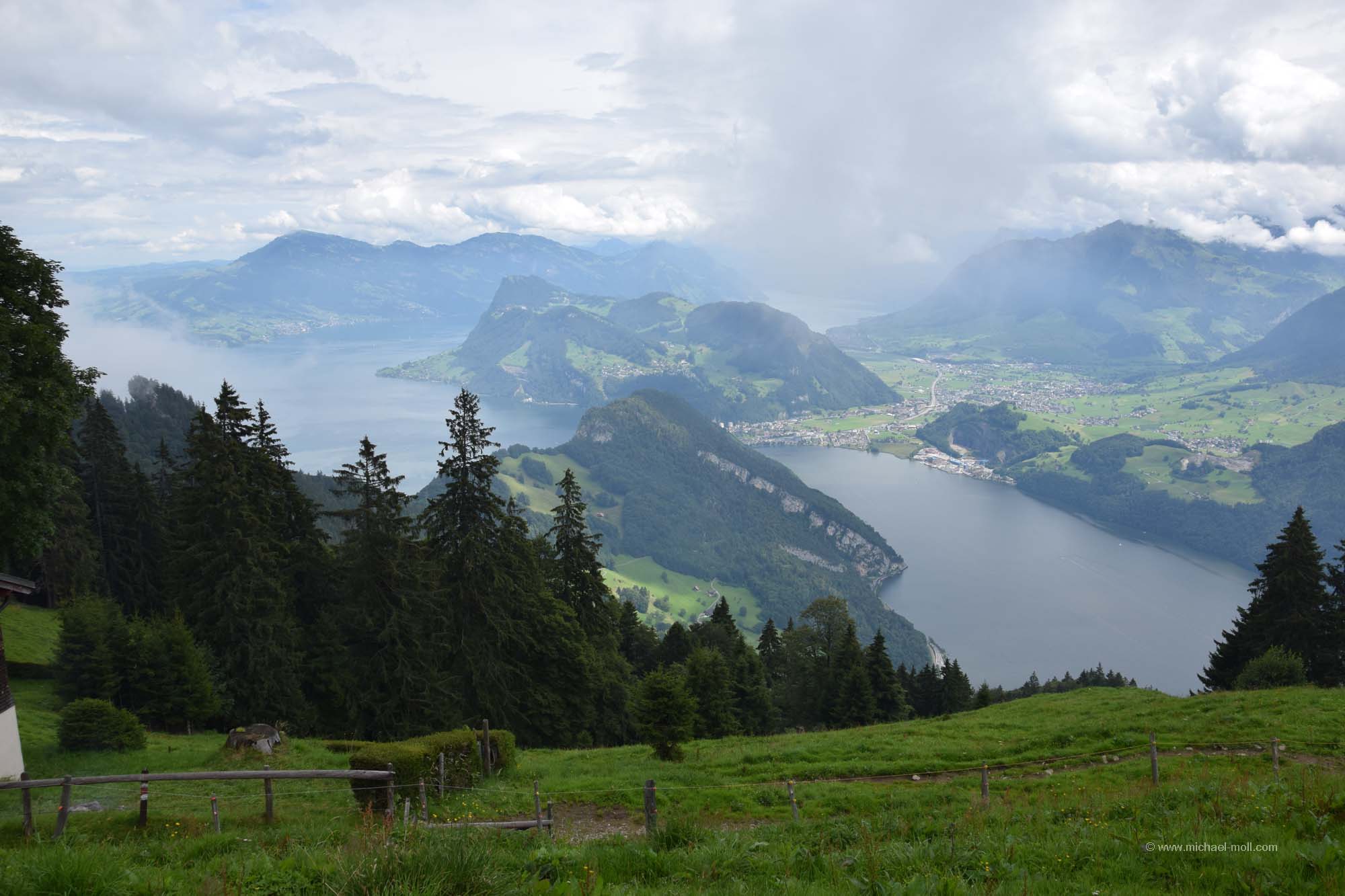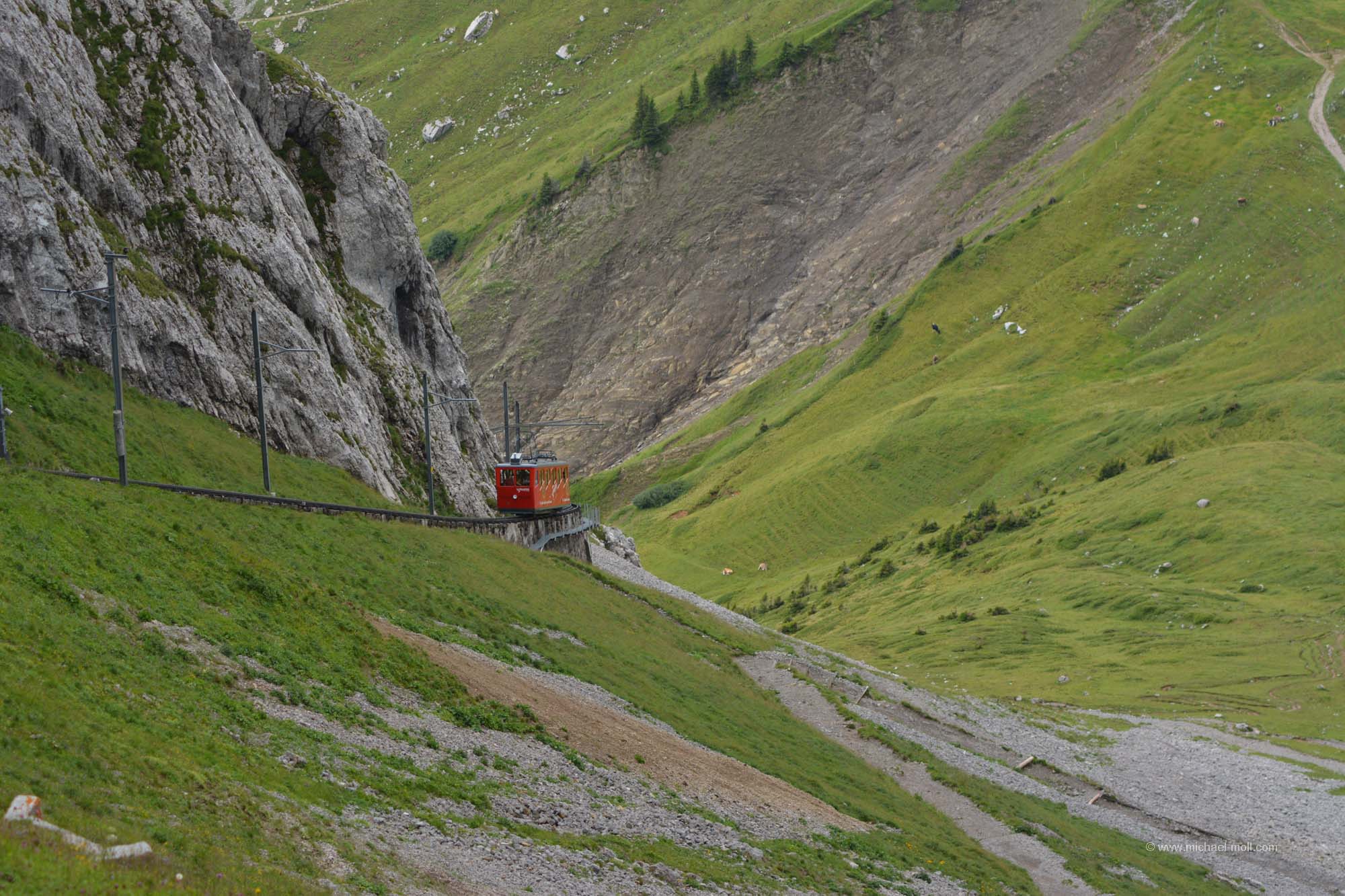 Eigentlich hatten wir auch ein Rückfahrticket für die Pilatus-Bahn. Doch als wir hinauf fuhren, sahen wir an einem Berghang eine schöne Zick-Zack-Strecke. Wir konnten den Wanderweg vom Gipfel hinab ins Tal sehr deutlich erkennen und wir wussten beide, dass es die letzte Möglichkeit auf dieser Reise wäre, eine kleine Bergwanderung zu unternehmen. Und wir wussten auch, dass es uns mehr Spaß bereiten würde als mit der Zahnradbahn einfach nur wieder hinab zu fahren. Genau so machten wir es damals ja auch in Wales, als wir mit der Zahnradbahn auf den Snowdon, den höchsten Berg von Wales fuhren. Auch dort entschieden wir spontan, dass wir doch lieber zu Fuß wieder hinab gehen. Außerdem passte so eine Entscheidung auch ganz gut in die bisherige Reise, wo wir das Stilfser Joch, das Jungfraujoch und den Gornergrat zumindest teilweise zu Fuß hinabwanderten.