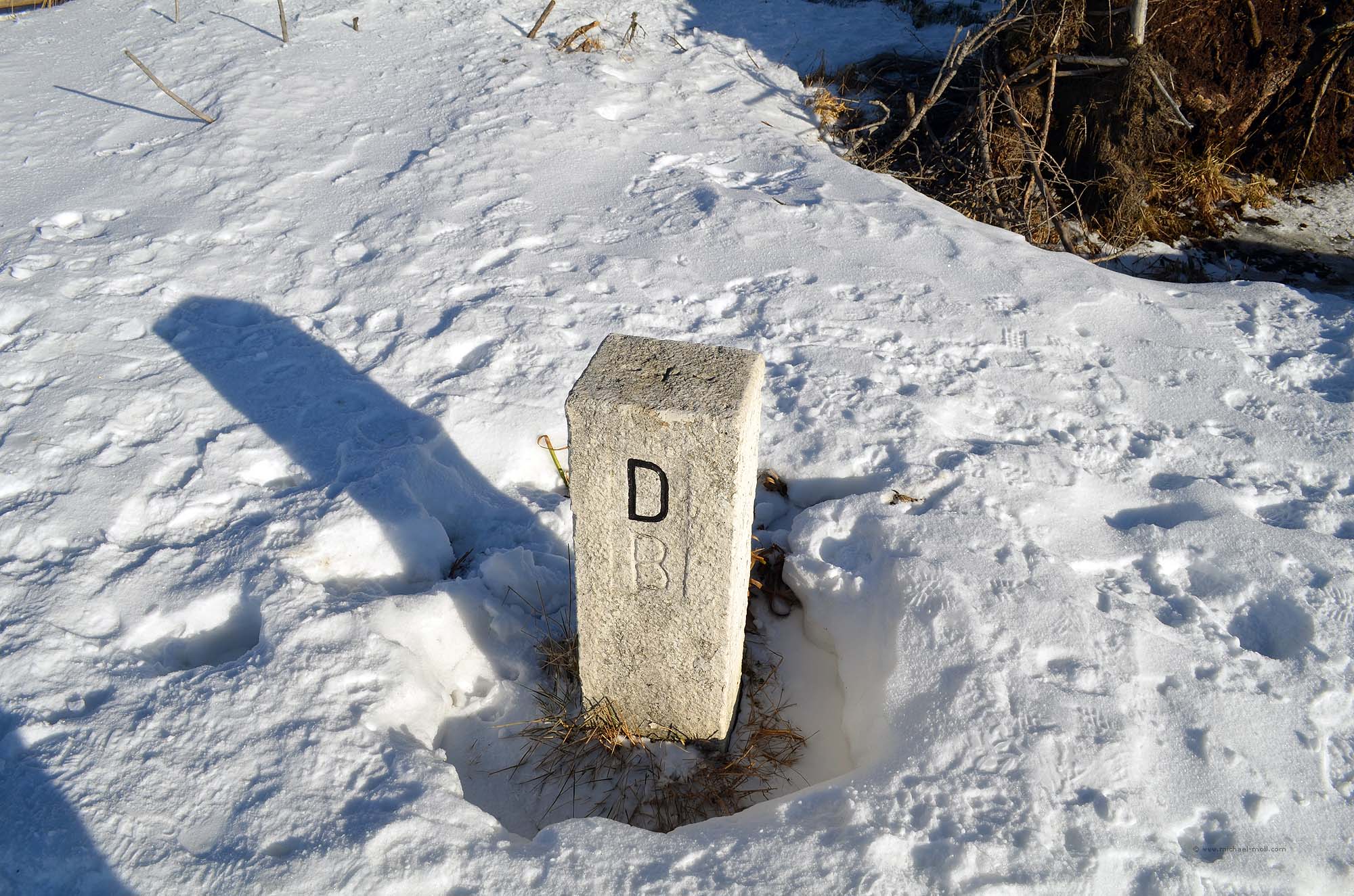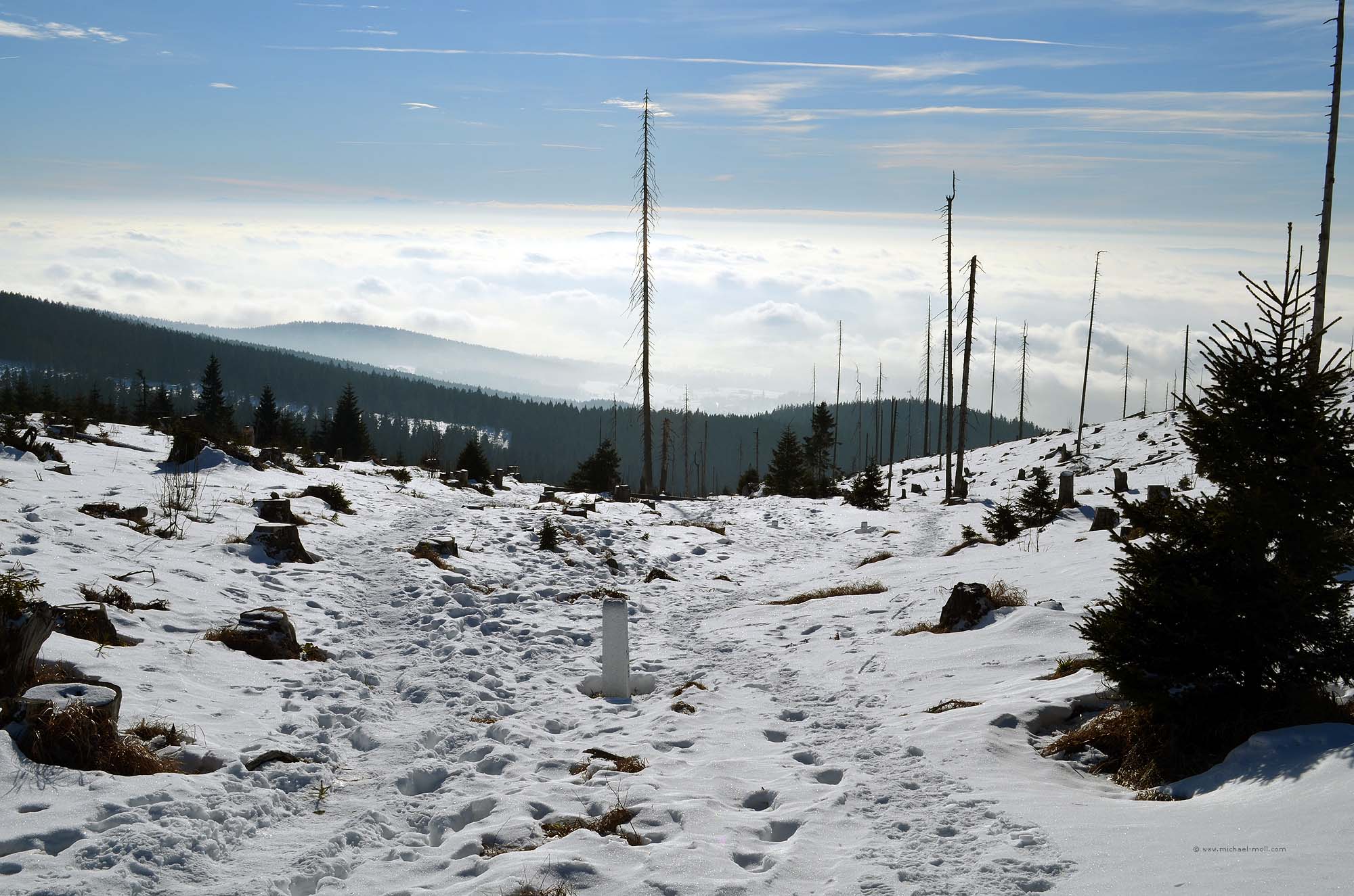 Auch der Waldweg war völlig vereist und wir mussten höllisch aufpassen, dass wir nicht wegrutschten. Als wir am Wasserfall ankamen und uns nach der ausgiebigen Fotografiererei aufmachen wollten, zum Wohnmobil zurückzukehren, fiel uns auf, dass wir noch weiter gehen könnten und von viel weiter unterhalb weitere Aufnahmen machen könnten. Also, gesagt getan und wenige Minuten später waren wir noch an einer weiteren, schönen Stelle. Meiner Meinung nach sogar die schönere. Gut, dass wir das noch entdeckten. Aber genau hier stellten wir eben fest, dass es noch einen weiteren Parkplatz gibt, der kein bisschen vereist war und wir möglicherweise gleich noch vor einem Problem stehen würden, wenn wir die dreieinhalb Tonnen vom Eis fahren müssten. Aber es stellte sich heraus, dass das Problem gar keines war. Völlig problemfrei konnte ich den Wagen von der großen Eisfläche auf eine kleine Brücke zusteuern und gleich dahinter waren wir schon wieder auf der befestigten und eisfreien Straße.