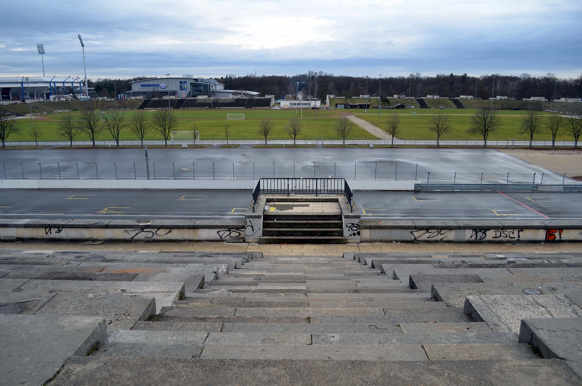 Wir parkten an der Dokumentationsstätte, die gar nicht allzu weit entfernt vom Stellplatz war und folgten innerhalb des Baus dem sehr interessanten Rundweg. Draußen betrachteten wir das Areal natürlich auch noch und spazierten daher um den Großen Dutzendteich herum. Dabei gingen wir auf der Großen Straße entlang und erklommen die Tribüne der Zeppelinwiese.