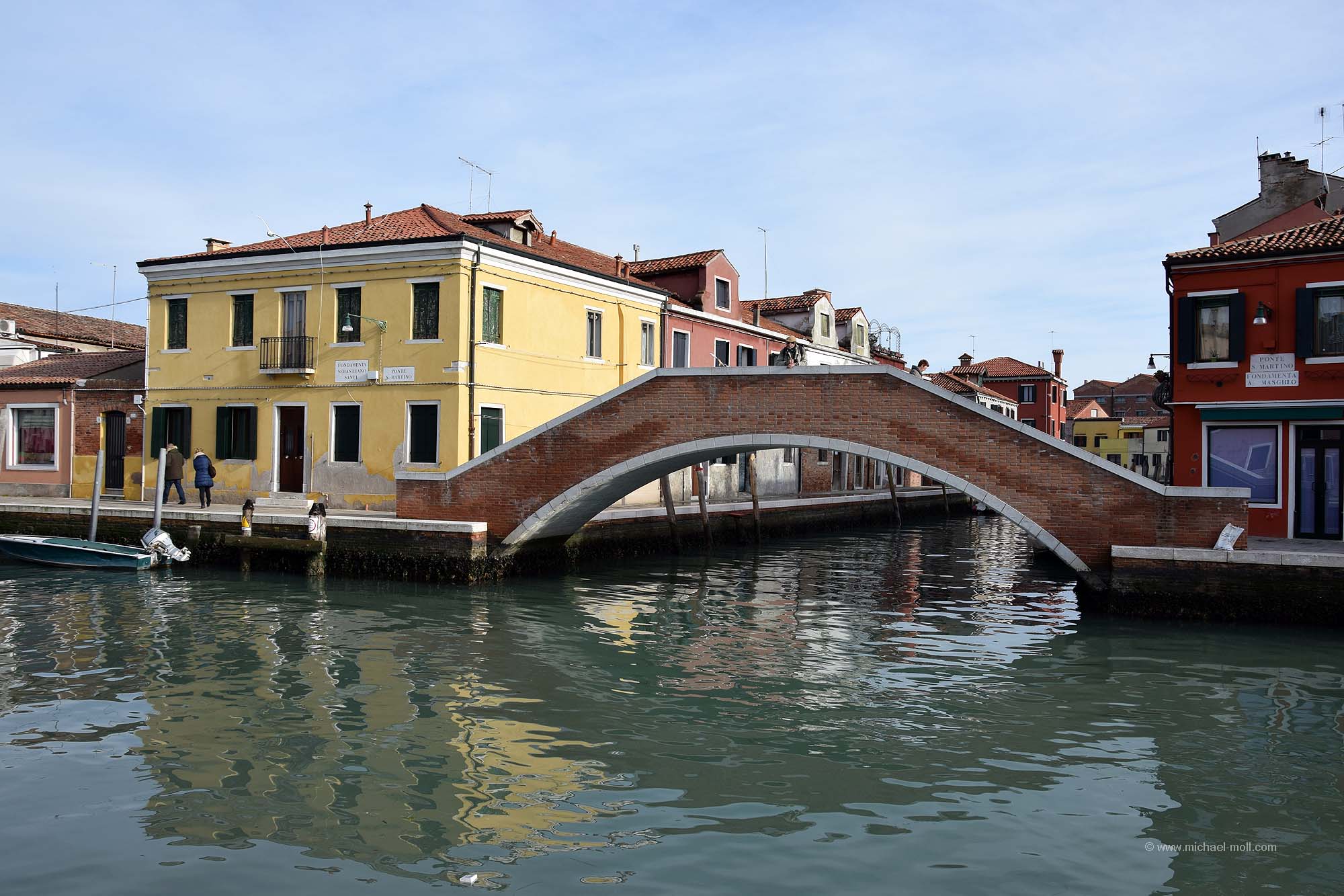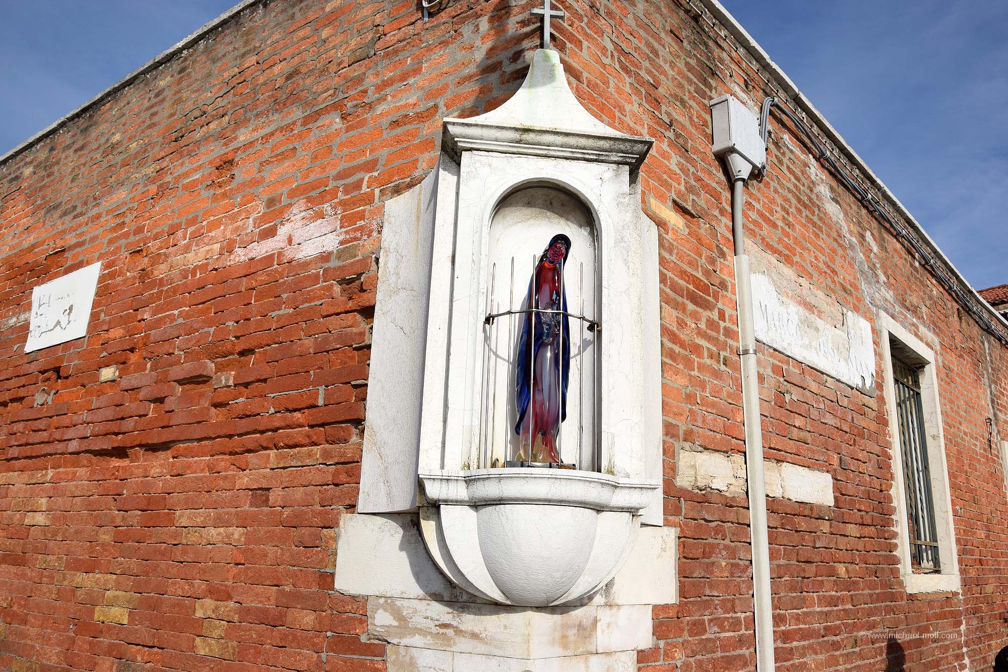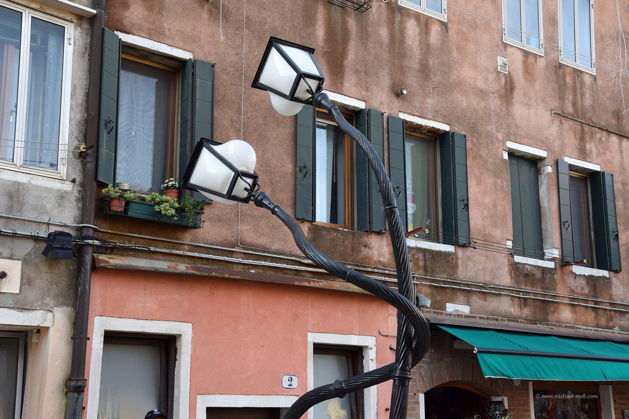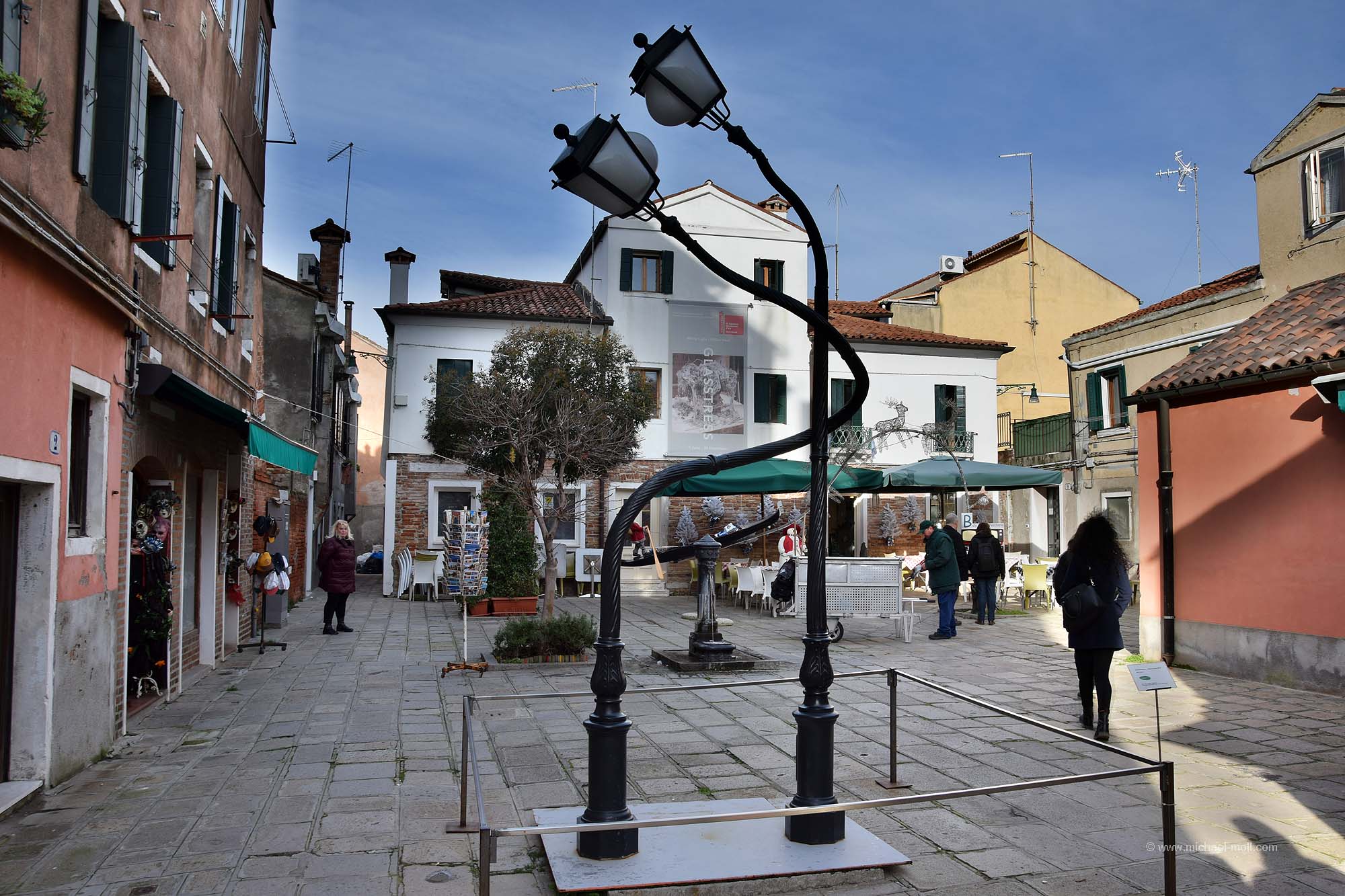 Doch auch wenn der zweite Tag sein Ende nahm, so hatten wir ja noch einen weiteren Besuchstag in petto. Und diesen nutzten wir, indem wir ein 24 Stunden-Ticket kauften. Denn mit so einem Ticket sind die Fahrten mit den Wasserbussen, also den Vaporetto kostenlos. Man kann alle Strecken fahren so oft wie man möchte. Und nachdem wir nun die Hauptinsel Venedigs einigermaßen kennengelernt hatten, wollten wir auch noch Burano und Murano sehen. So stiegen wir am Canal Grande in den Wasserbus und ließen uns bei strahlend blauem Himmel zunächst nach Murano bringen. Dort setzten wir unseren Venedigbesuch so fort, wie wir ihn am Vortag beendeten. Nämlich mit einem Gang entlang der dortigen Kanäle, obwohl es dort wesentlich weniger sind als auf der Hauptinsel. Das Hauptaugenmerk von Murano liegt bei der Glasbläserkunst und so spaziert man auch an zahlreichen Schaufenstern vorbei, in denen hin und wieder neben der Auslage ein kleines Hinweisschild zu lesen ist: „Nichts in diesem Schaufenster stammt aus China“. Schön fand ich auch die drolligen Straßenlaternen, die sich wie Verliebte ganz verschlungen zeigten. Erinnerte mich ein wenig an die sprechenden Laternen von Celle.