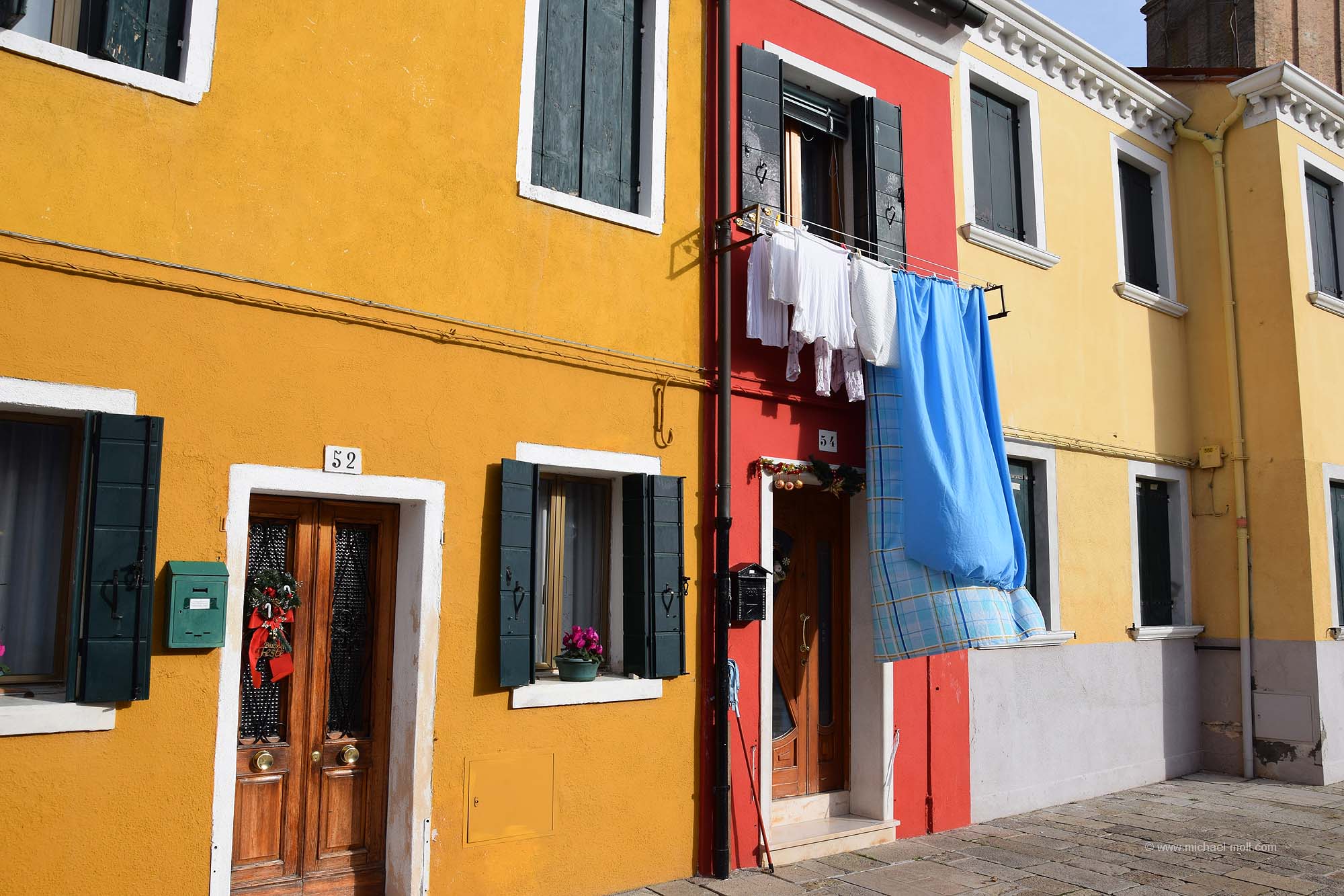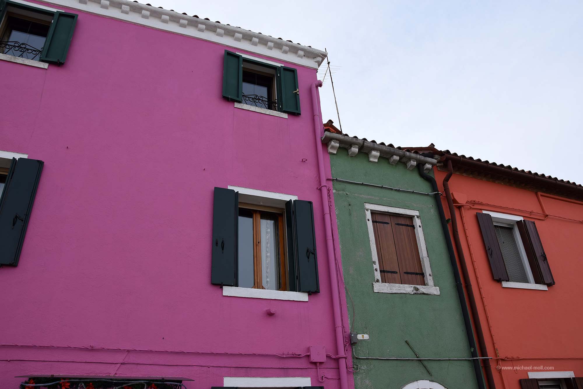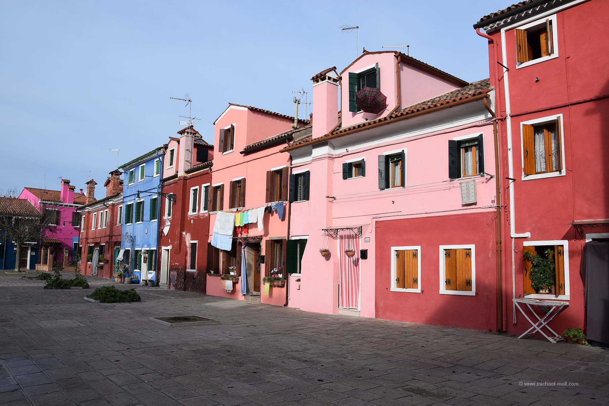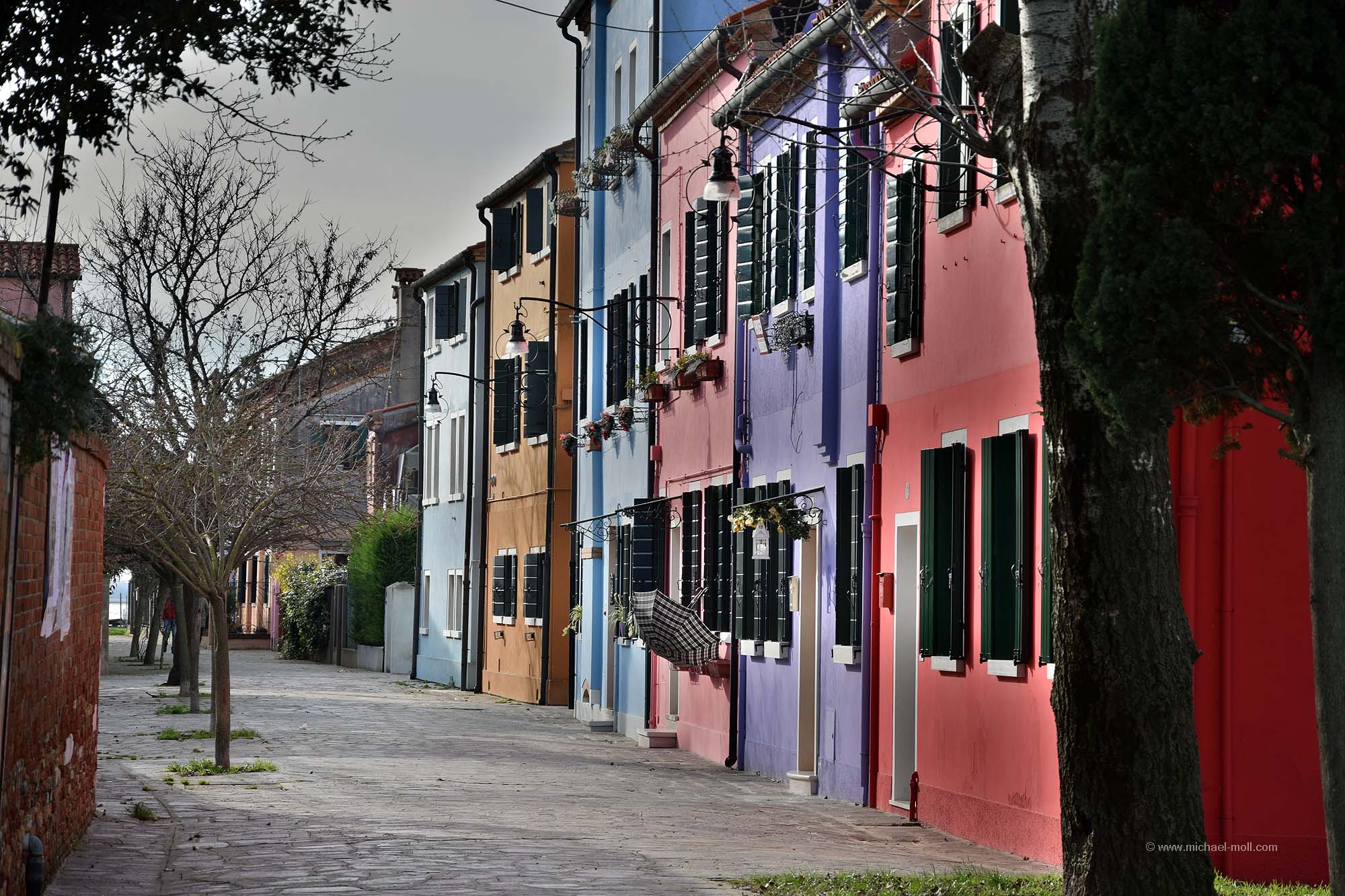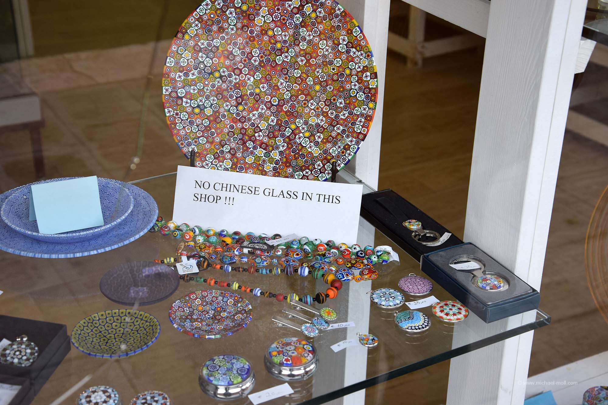 Doch auch wenn der zweite Tag sein Ende nahm, so hatten wir ja noch einen weiteren Besuchstag in petto. Und diesen nutzten wir, indem wir ein 24 Stunden-Ticket kauften. Denn mit so einem Ticket sind die Fahrten mit den Wasserbussen, also den Vaporetto kostenlos. Man kann alle Strecken fahren so oft wie man möchte. Und nachdem wir nun die Hauptinsel Venedigs einigermaßen kennengelernt hatten, wollten wir auch noch Burano und Murano sehen. So stiegen wir am Canal Grande in den Wasserbus und ließen uns bei strahlend blauem Himmel zunächst nach Murano bringen. Dort setzten wir unseren Venedigbesuch so fort, wie wir ihn am Vortag beendeten. Nämlich mit einem Gang entlang der dortigen Kanäle, obwohl es dort wesentlich weniger sind als auf der Hauptinsel. Das Hauptaugenmerk von Murano liegt bei der Glasbläserkunst und so spaziert man auch an zahlreichen Schaufenstern vorbei, in denen hin und wieder neben der Auslage ein kleines Hinweisschild zu lesen ist: „Nichts in diesem Schaufenster stammt aus China“. Schön fand ich auch die drolligen Straßenlaternen, die sich wie Verliebte ganz verschlungen zeigten. Erinnerte mich ein wenig an die sprechenden Laternen von Celle.