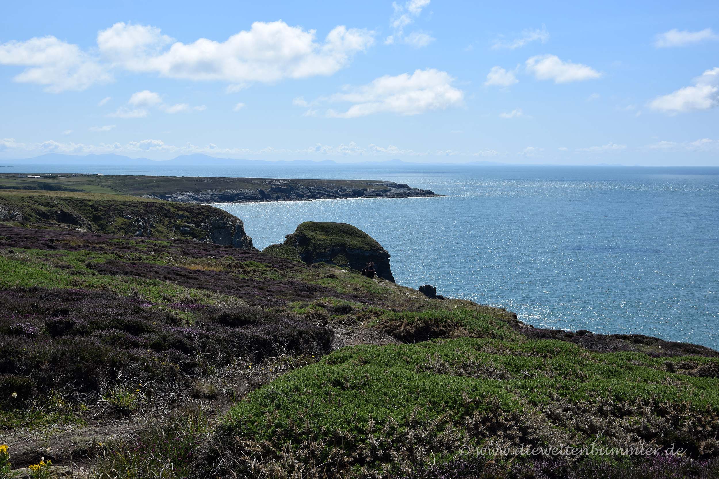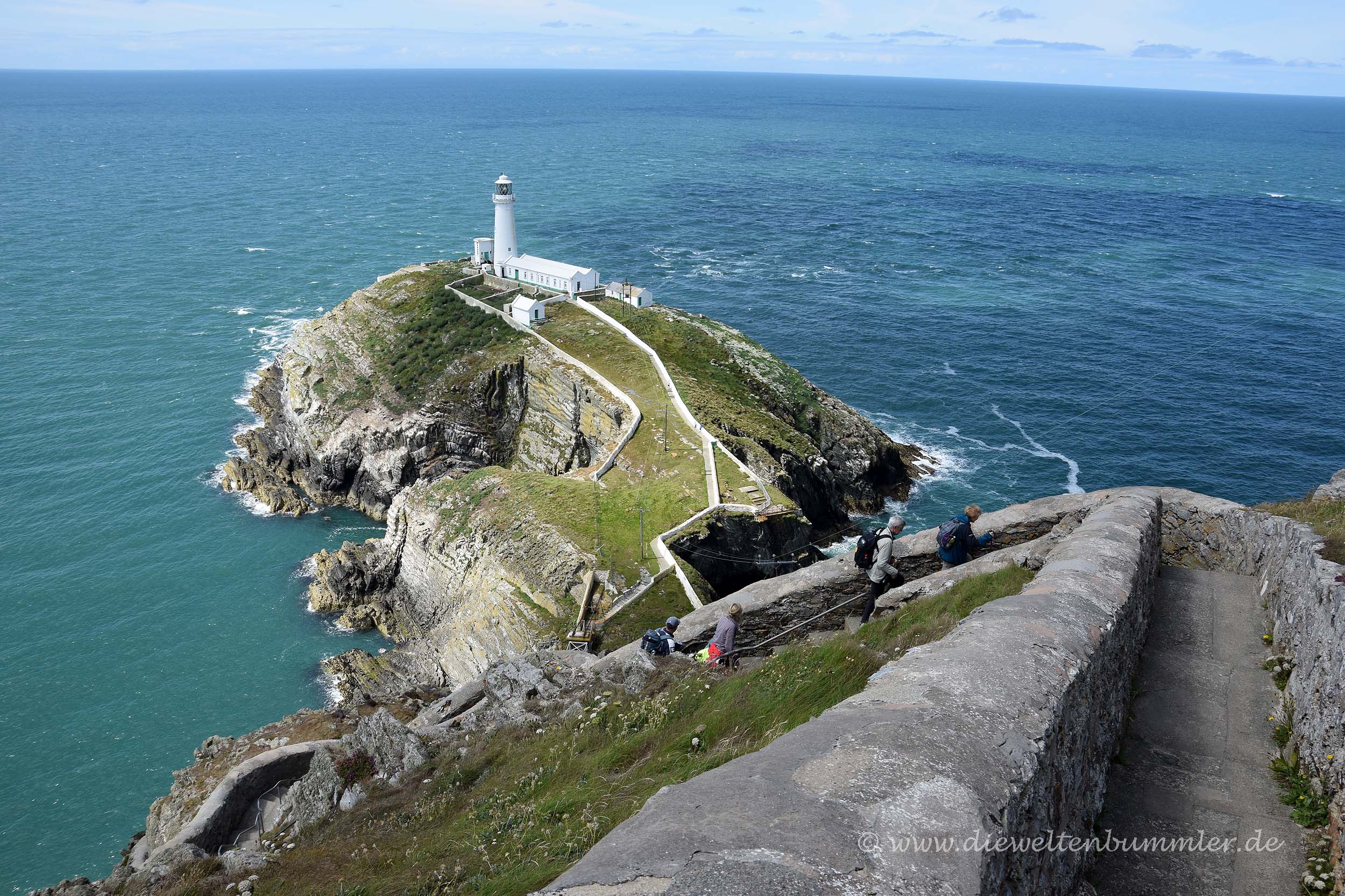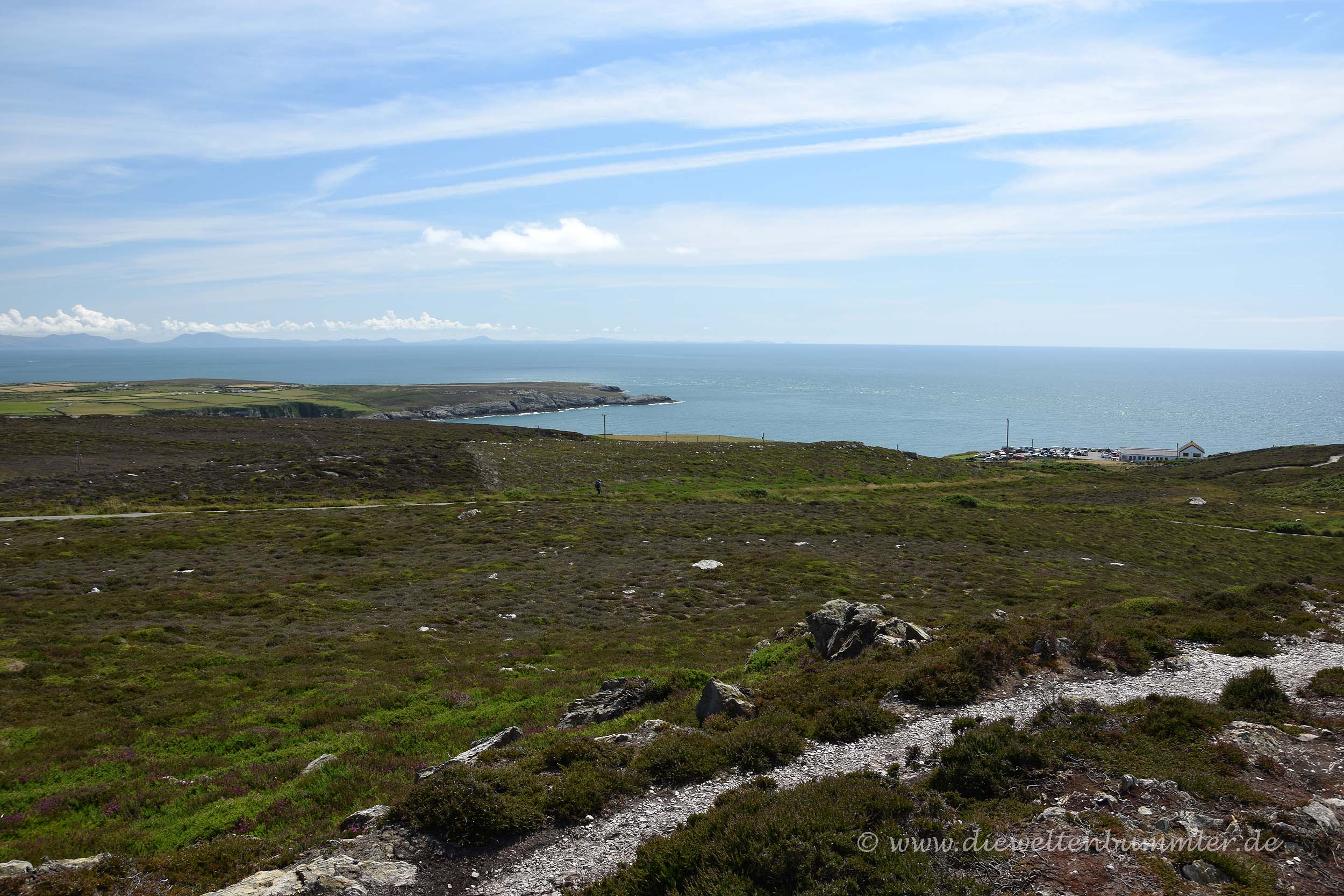 Auf dem kurzen Weg durch die Heidelandschaft oberhalb einer Steilküste gelangten wir zum westlichsten Punkt der Insel Anglesey. Dort hat man die Möglichkeit, über zahllose Treppen hinab zu einer kleinen Brücke zu steigen. Über die Brücke erreicht man das kleine Eiland Holy Island, die als Vogelinsel bekannt ist und den bereits erwähnten Leuchtturm beherbergt. Der Eintritt ist kostenpflichtig, aber wir waren nun einmal hier und wollten uns das nicht unbedingt entgehen lassen. Wir fragten jemanden der hier ansässigen Naturschutzwarte, ob denn Papageitaucher zu sehen seien, doch die Aussichten hierfür waren nicht besonders gut, da wir in der Jahreszeit schon ein wenig zu spät dran seien. Aber dennoch war der Ausblick von der Insel auf die schroffe Felsküste wirklich schön. Im Hintergrund konnte man die Berge vom Snowdonia-Nationalpark sehen.