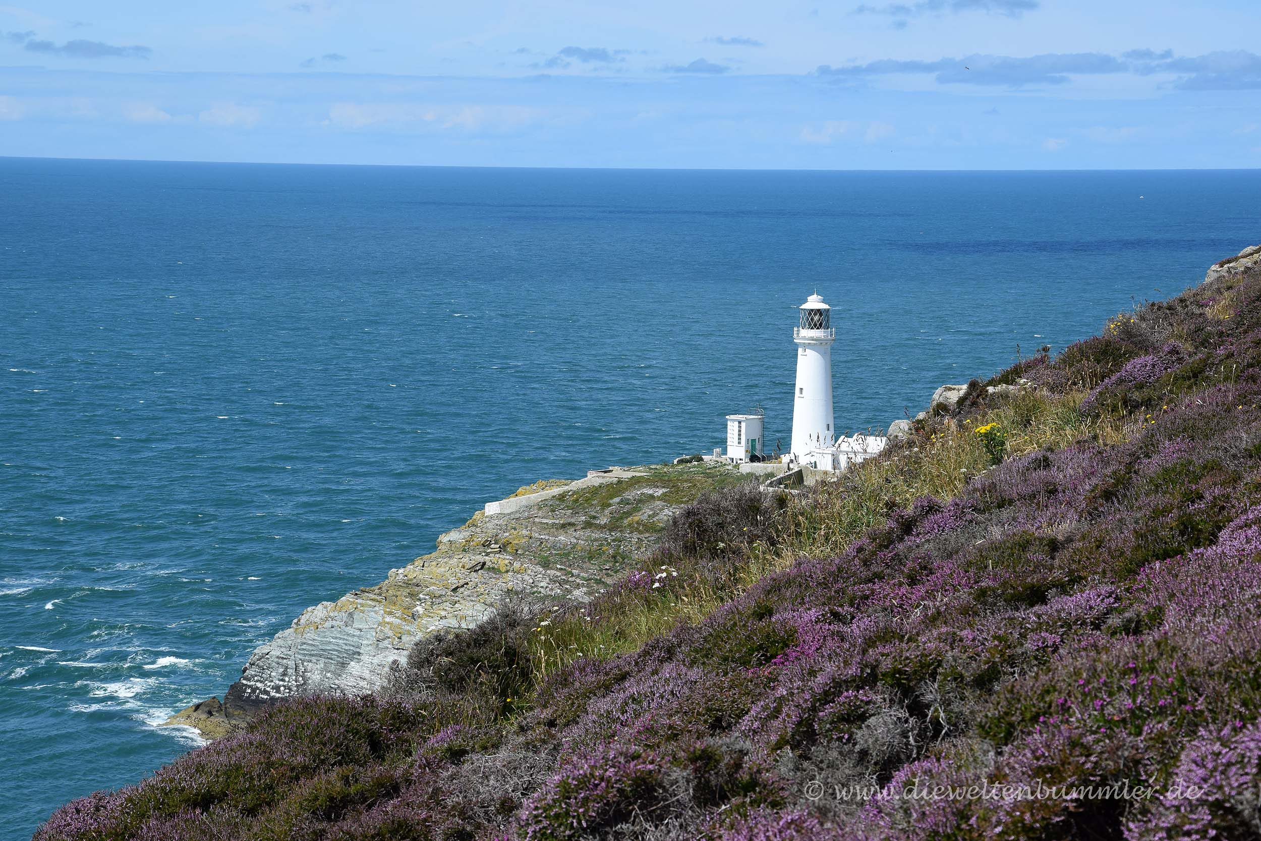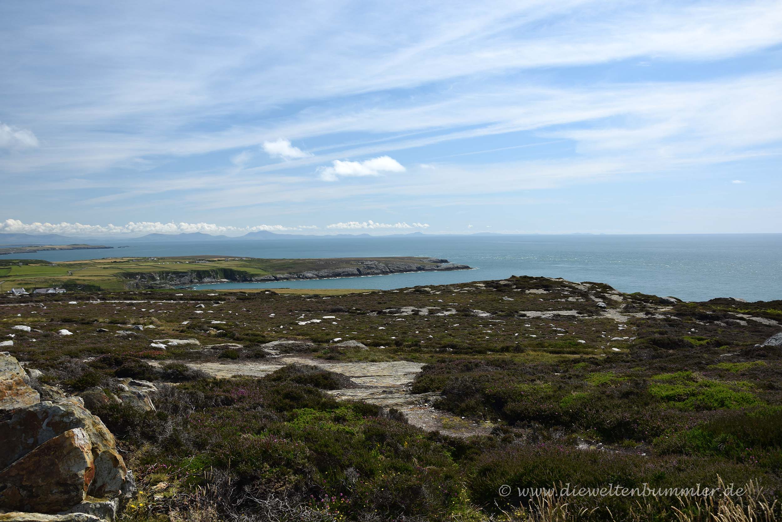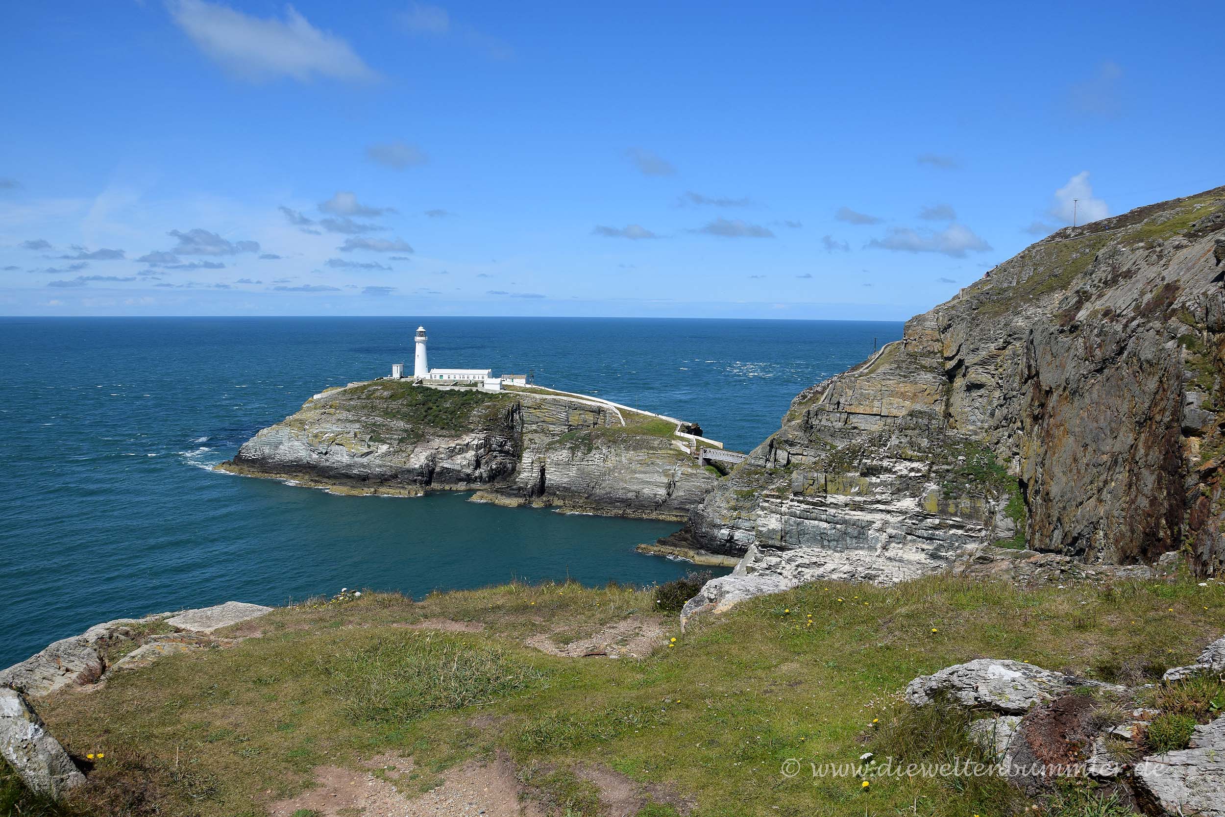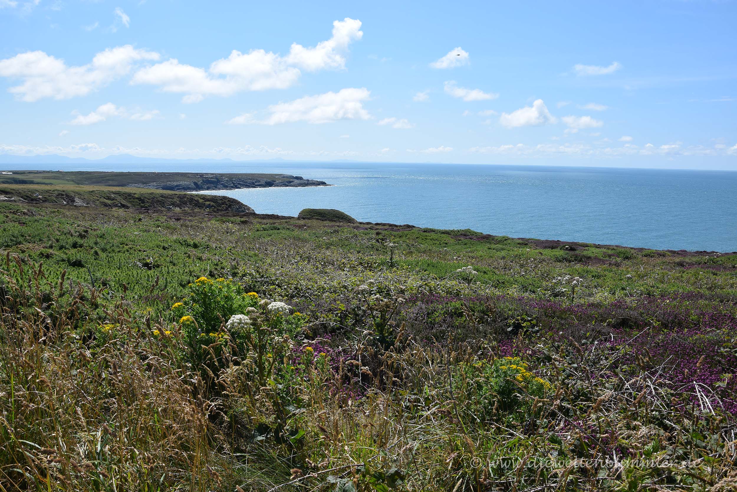 Auf dem kurzen Weg durch die Heidelandschaft oberhalb einer Steilküste gelangten wir zum westlichsten Punkt der Insel Anglesey. Dort hat man die Möglichkeit, über zahllose Treppen hinab zu einer kleinen Brücke zu steigen. Über die Brücke erreicht man das kleine Eiland Holy Island, die als Vogelinsel bekannt ist und den bereits erwähnten Leuchtturm beherbergt. Der Eintritt ist kostenpflichtig, aber wir waren nun einmal hier und wollten uns das nicht unbedingt entgehen lassen. Wir fragten jemanden der hier ansässigen Naturschutzwarte, ob denn Papageitaucher zu sehen seien, doch die Aussichten hierfür waren nicht besonders gut, da wir in der Jahreszeit schon ein wenig zu spät dran seien. Aber dennoch war der Ausblick von der Insel auf die schroffe Felsküste wirklich schön. Im Hintergrund konnte man die Berge vom Snowdonia-Nationalpark sehen.