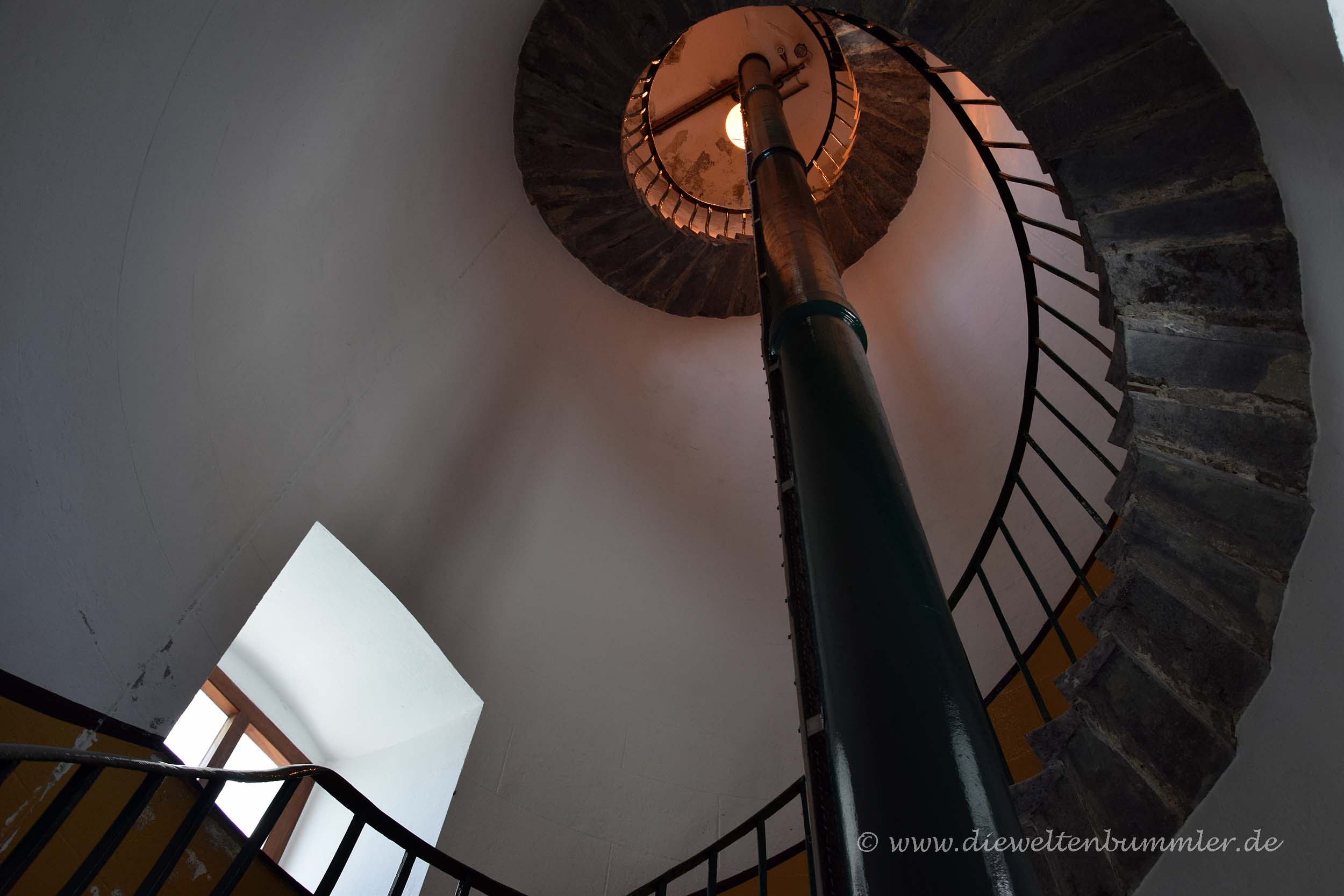 In den Nebengebäuden des Leuchtturms war eine kleine Ausstellung untergebracht, die wir uns nicht nur anschauten, sondern in der wir auch warteten, bis wir den Leuchtturm besteigen konnten. Das ist nämlich nur in Begleitung möglich, sprich im Rahmen einer kleinen Führung. Als eine Besichtigungsgruppe herunter kam, konnten wir direkt mit einigen anderen Besuchern hinauf bis zum Leuchtfeuer. Nur nach draußen durfte man leider nicht. Dafür wurden wir jedoch oben von einer weiteren Mitarbeiterin erwartet, die uns einiges über die Geschichte des Leuchtturms und über die hier vorkommende Tierwelt erzählte. Außerdem zeigte sie uns am Horizont die Küste von Irland, die wir gerade eben so erkennen konnten und die Isle of Man, die nördlich von uns auch als schmaler Streifen über der Wasserlinie zu sehen war. Damit hatten wir also zum ersten Mal die Isle of Man gesehen und freuten uns schon darauf, dass wir schon am Abend des folgenden Tages auf der Insel sein sollten. Dass wir auch die Küste von Irland sahen und zudem im irischen Mobilfunknetz eingeloggt waren, nahmen wir einfach zur Kenntnis. Wir waren ja erst zwei Jahre zuvor mit dem Wohnmobil durch Irland gefahren, war also nichts Besonderes.
