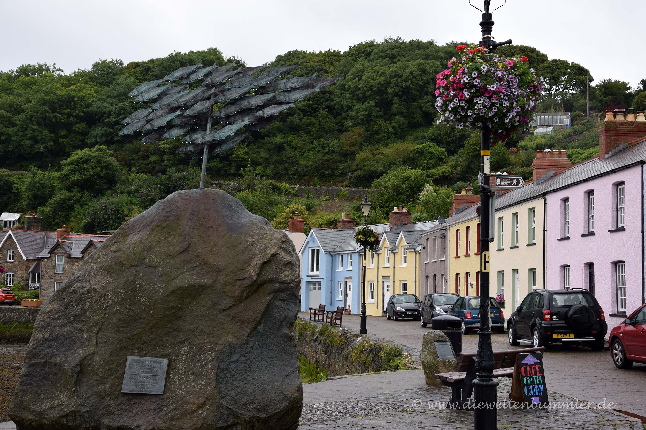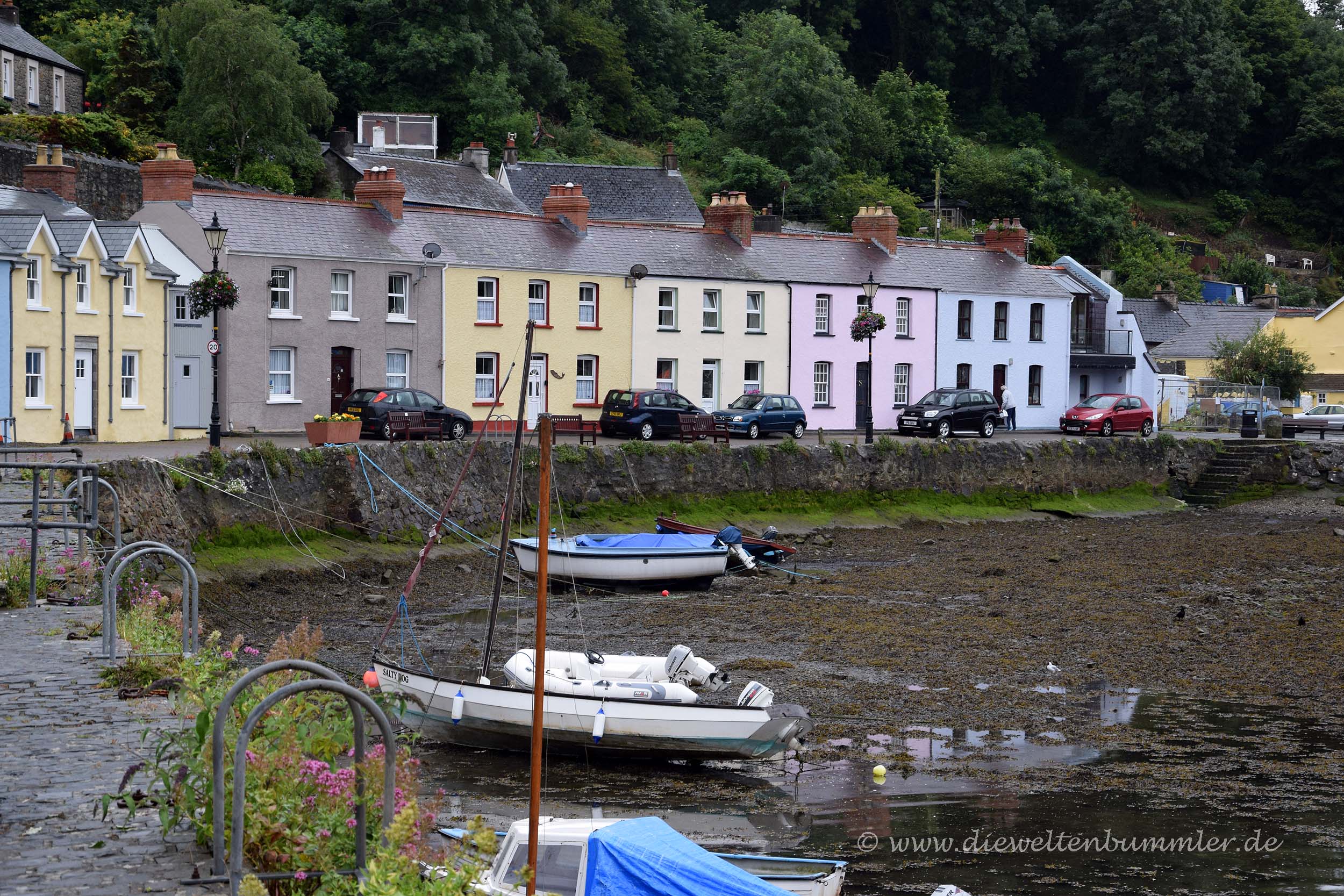 Weniger gepasst hatte dann das Wetter am Tag darauf. Wenn man morgens schon beim Wachwerden das Tröpfeln auf das Wohnmobildach hört und die Augen noch nicht öffnen muss, dann weiß man schon, was einen an so einem Tag erwartet. Es war sehr schade, da wir uns die Küste im Pembrokeshire Nationalpark natürlich gerne etwas genauer angesehen hätten. Und die Möglichkeit zu bleiben, um den Regen auszusitzen hatten wir leider aus Zeitgründen nicht. Dennoch versuchten wir natürlich das Beste daraus zu machen. Wir folgten der Küstenlinie so gut es ging und machten immer wieder mal Abstecher, so wie zum Beispiel im kleinen Örtchen Fishguard, wo wir eine kurze Regenpause ausnutzten, um am noch kleineren Hafen entlang zu schlendern.