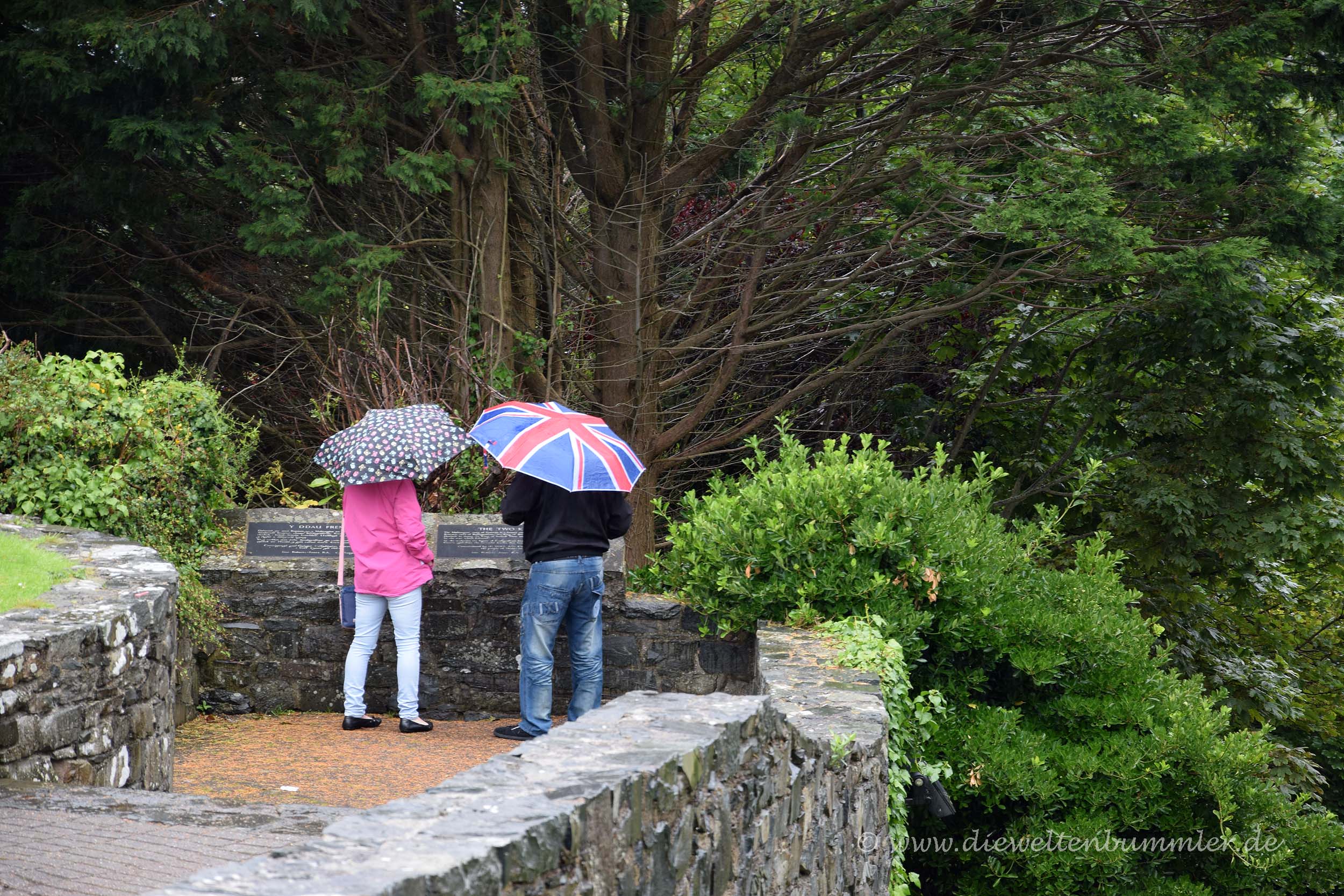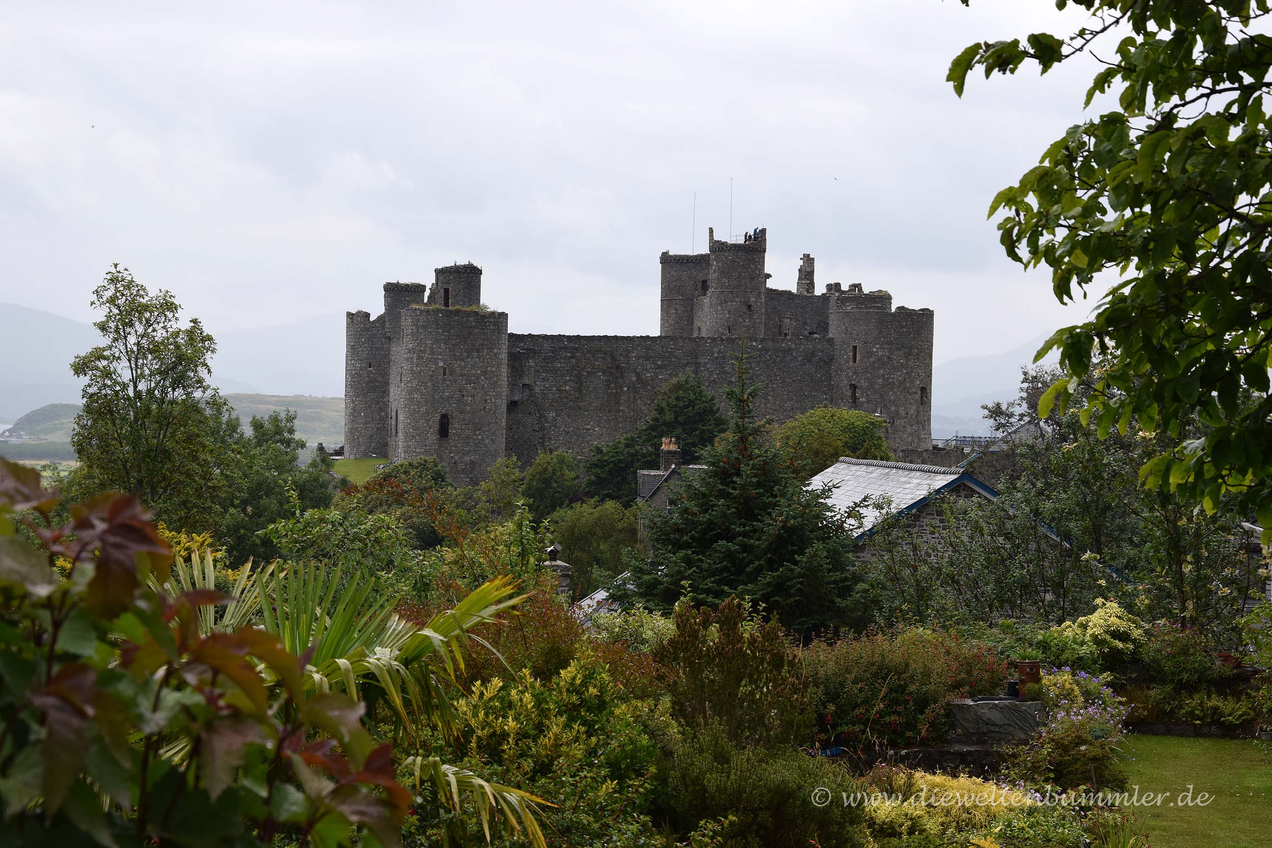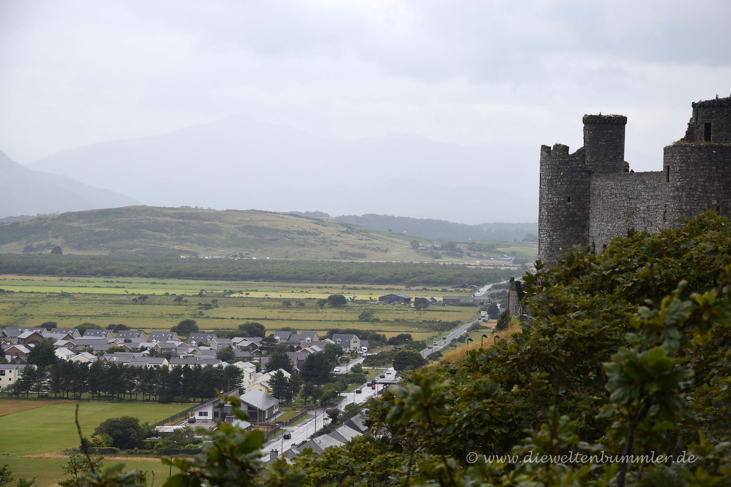 So zahlten wir also vier Pfund in der Gewissheit, dass wir eigentlich nur einmal kurz durch den kleinen Ort laufen würden, Harlech Castle zumindest einmal von außen begutachten und dann zurückkämen. Harlech Castle und die Altstadt liegen schon oberhalb der Hauptstraße, die unten an der Küste direkt auf die Berge vom Snowdonia-Nationalpark zuläuft. So gibt die Burg ein richtig schönes Bild ab, aber bei dem regnerischen Wetter kann sich auch die schönste Burg so sehr bemühen, ein tolles Fotomotiv zu sein. Und weil das Wetter halt so schauderhaft war, gaben wir wenig später den Tag auch komplett auf. Es brachte einfach nichts und es macht natürlich auch keinen Sinn, an zahlreichen potenziellen Sehenswürdigkeiten vorbei zu fahren.