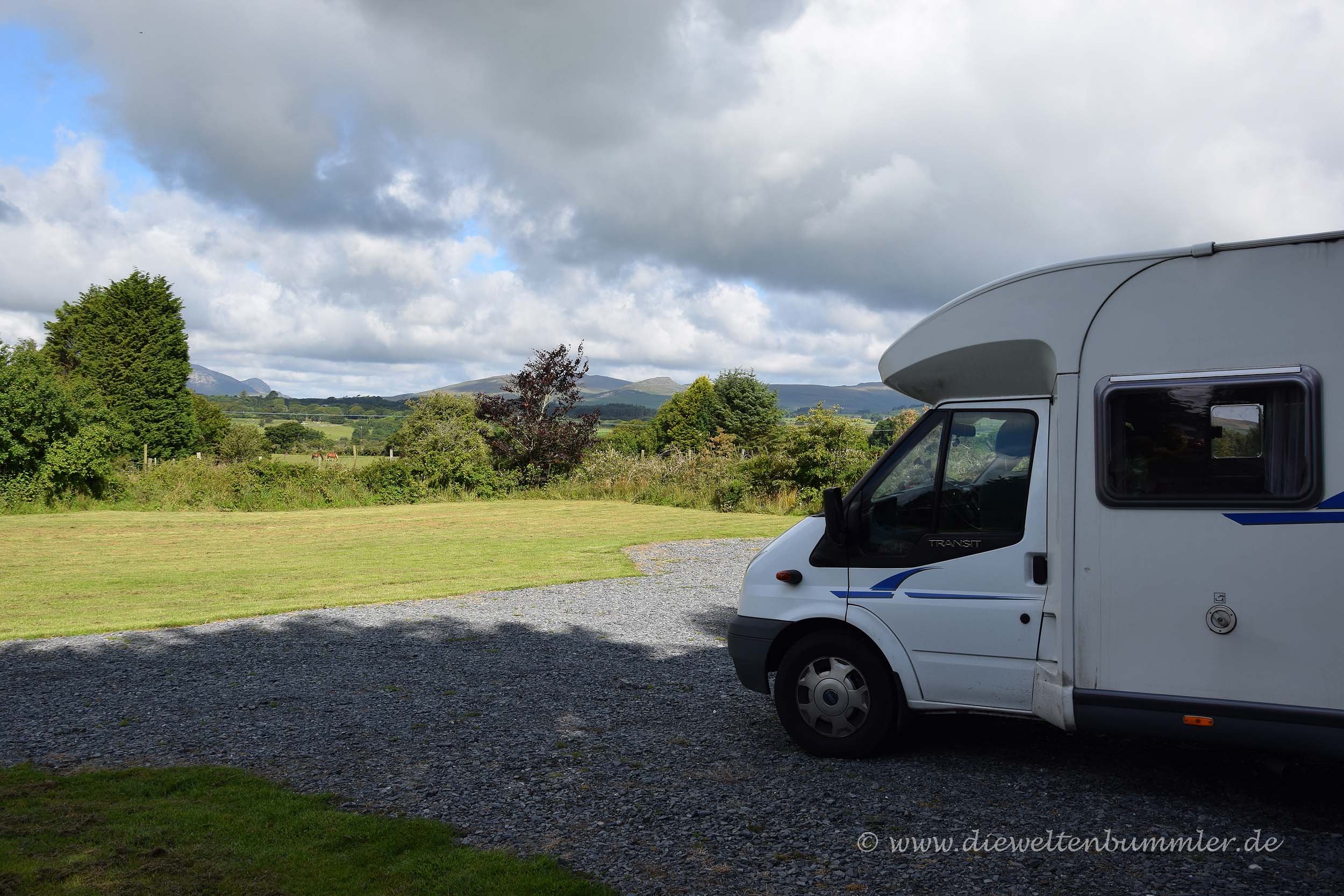 Na meinetwegen. Wir fuhren eben weiter und entschieden uns dann doch für einen kleinen, privaten Platz. Beim Lesen der Einrichtung des Platzes dachte ich mir noch nichts dabei und auch als wir dem Platz näher kamen, hatte ich nicht das Gefühl, etwas wiedererkennen zu müssen. Doch als wir kurz vor dem Grundstück waren, kam mir so einiges bekannt vor und ich fuhr zielsicher auf den Bauernhof und die dortige Wiese, die zur Verfügung gestellt wird. Moni erkannte den Platz nicht auf Anhieb wieder, was mich wiederum verwunderte. Aber wir hatten zwei Jahre zuvor ebenfalls auf diesem Grundstück übernachtet – und zwar an dem Tag, als wir den Snowdon-Gipfel besuchten. Nun standen wir wieder hier, das war Zufall. Wir waren die einzigen Gäste und hatten so den gesamten Platz für uns alleine, was irgendwie schön war. Besonders, weil gegen Abend der Regen aufhörte. Und nicht nur das, auch die Wolkendecke löste sich langsam auf, sodass wir sogar noch einen netten Sonnenuntergang beobachten konnten, während wir natürlich wieder mit einem Brettspiel beschäftigt waren.