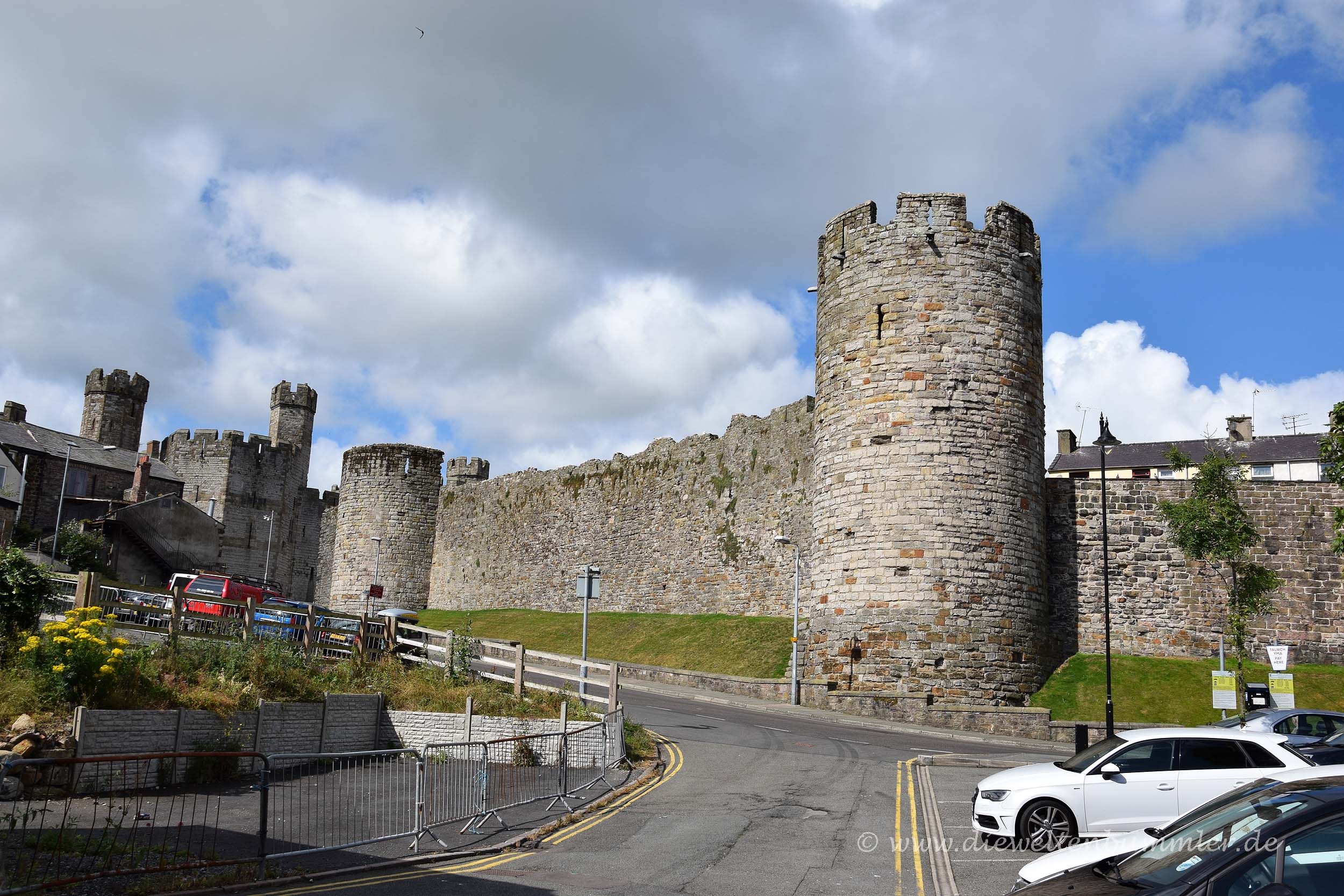Was das Wetter am Vorabend versprach, hielt es am zweiten Samstag unserer Reise auch ein. Es sollte ein wunderbarer Tag mit herrlichem Wetter werden. Wir begannen unsere heutige Besichtigungstour mit einer Fahrt nach Caernarfon, wo sich das zweit der vier Unesco-Schlösser in Wales befindet. Zu meiner Freude konnte man nicht nur ziemlich praktisch parken, sondern auch so, dass ich ein mögliches Titelbild für den zukünftigen Reiseführer machen konnte. Es gibt da nämlich einige Anforderungen, die besonders in Großbritannien nicht ganz so leicht zu erfüllen sind. Neben einem schönen Wetter und den idealen Lichtbedingungen sollte nämlich auch ein Wohnmobil von vorne zu erkennen sein, während im Hintergrund eine typische Sehenswürdigkeit zu sehen ist. Nur ist die Kombination natürlich nicht ganz so einfach. Abgesehen von den Wetterbedingungen, auf die ich natürlich keinen Einfluss habe, ist es oftmals gar nicht so leicht, direkt vor einer Sehenswürdigkeit zu parken.