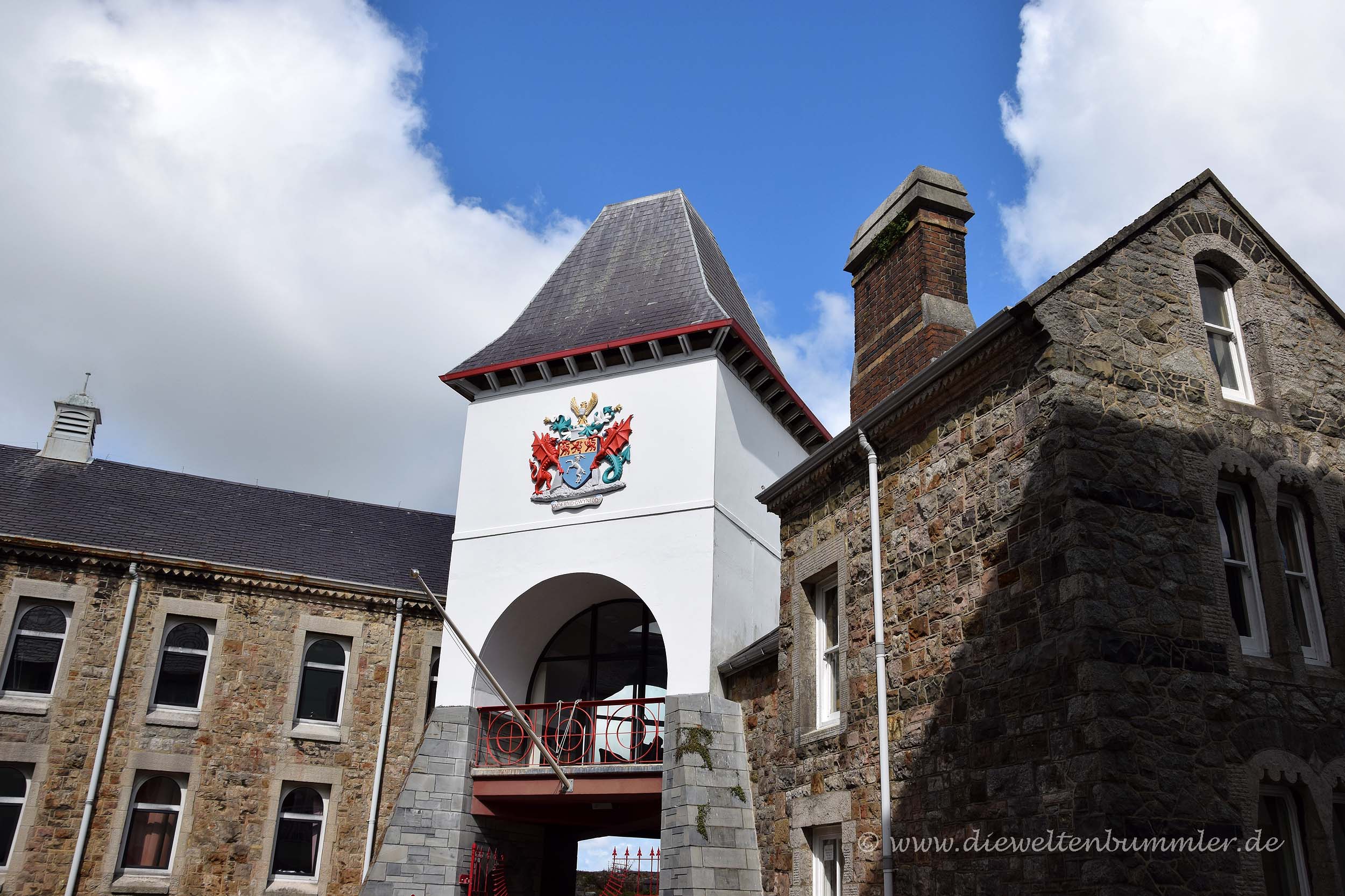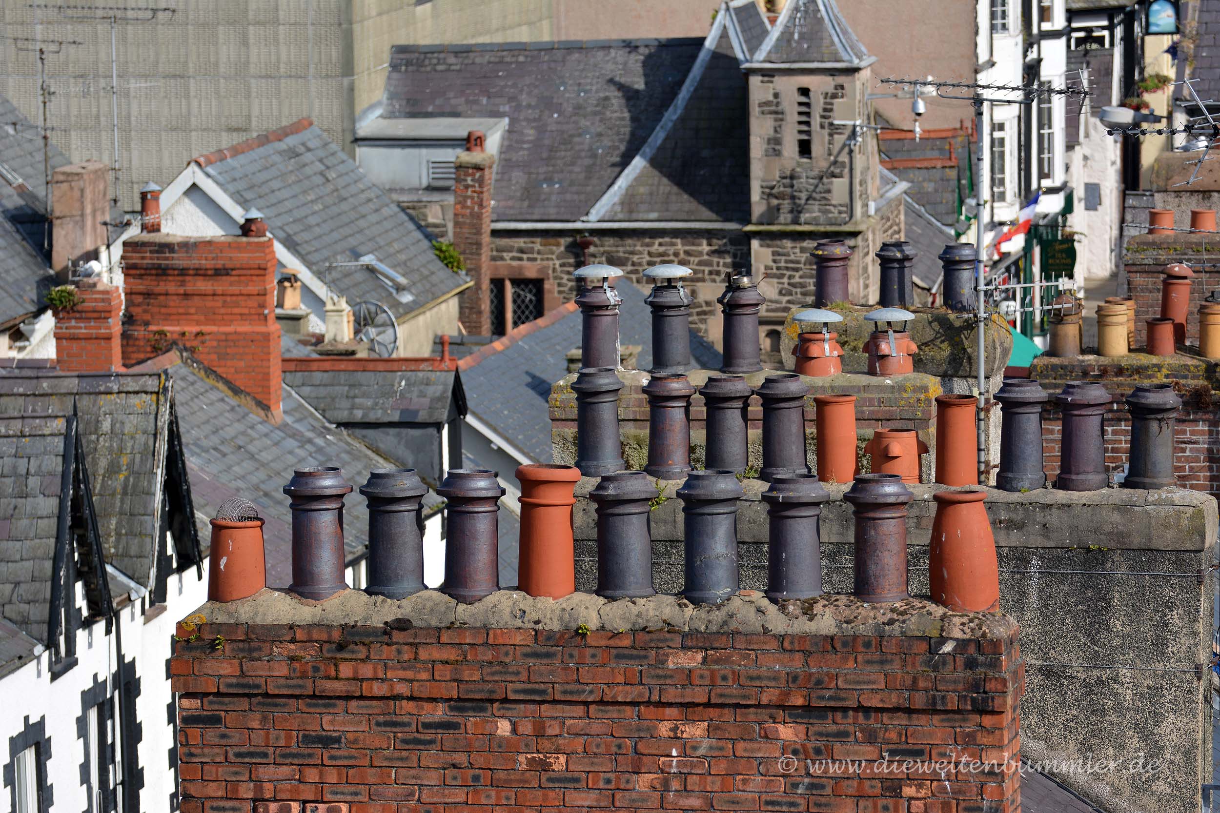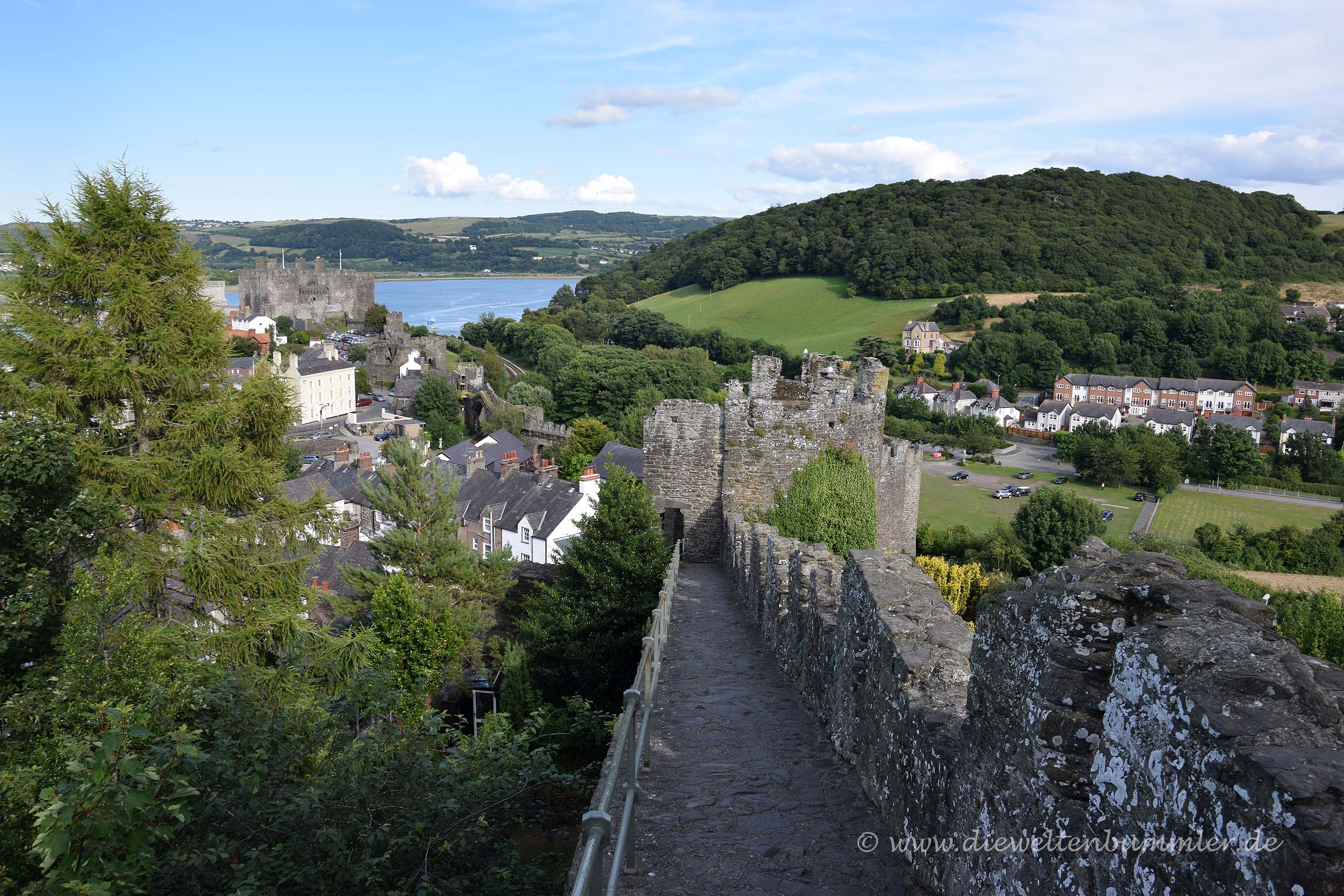 Nach der Hausbesichtigung, die, wenig überraschend, recht kurz ausfiel, begaben wir uns noch zur gut erhaltenen Stadtmauer, die an der Hafenpromenade beginnt und einmal rund um Conwy bis zur Burg verläuft. An einem Stück ist sie zwar unvollständig, aber das machte nichts aus, denn die meiste Zeit kann man schön entspannt über den Dächern von Conwy spazieren gehen und neugierig in die die kleinen Gärten der Wohnhäuser lugen.