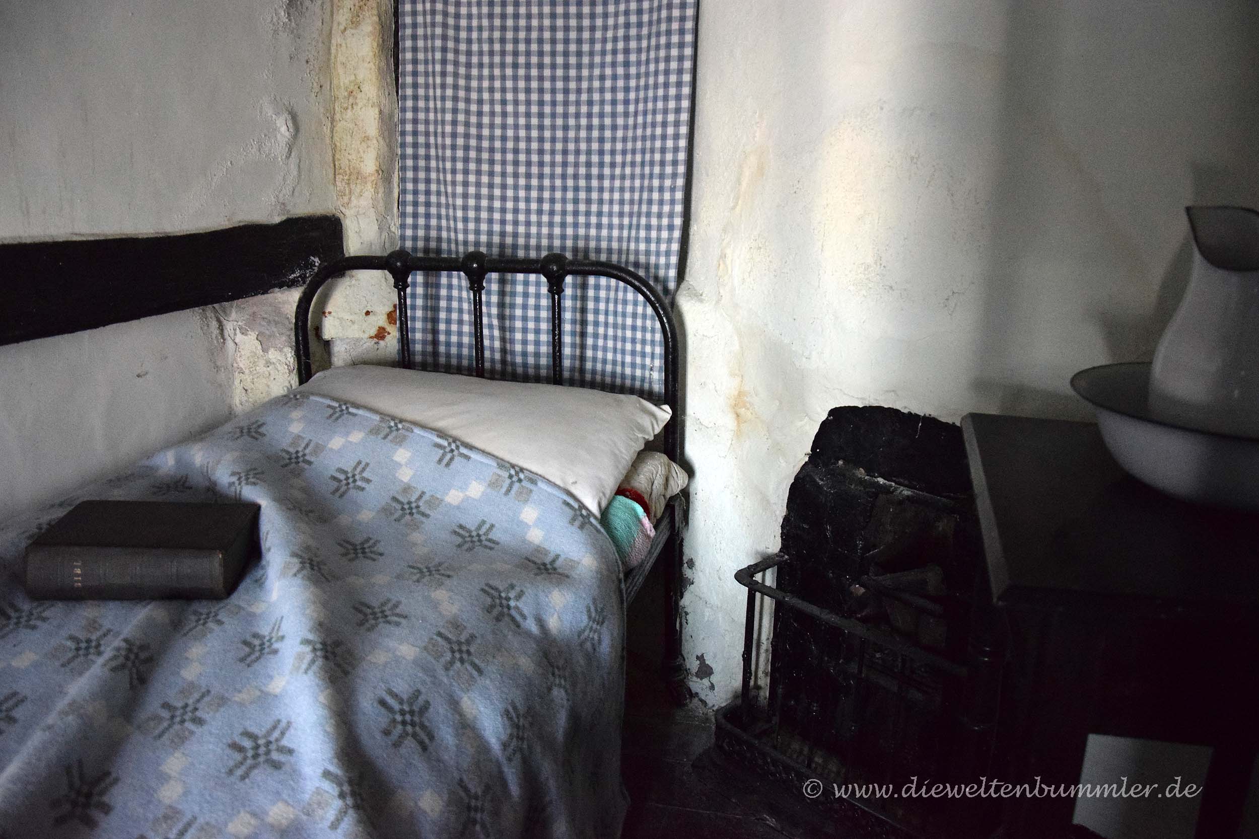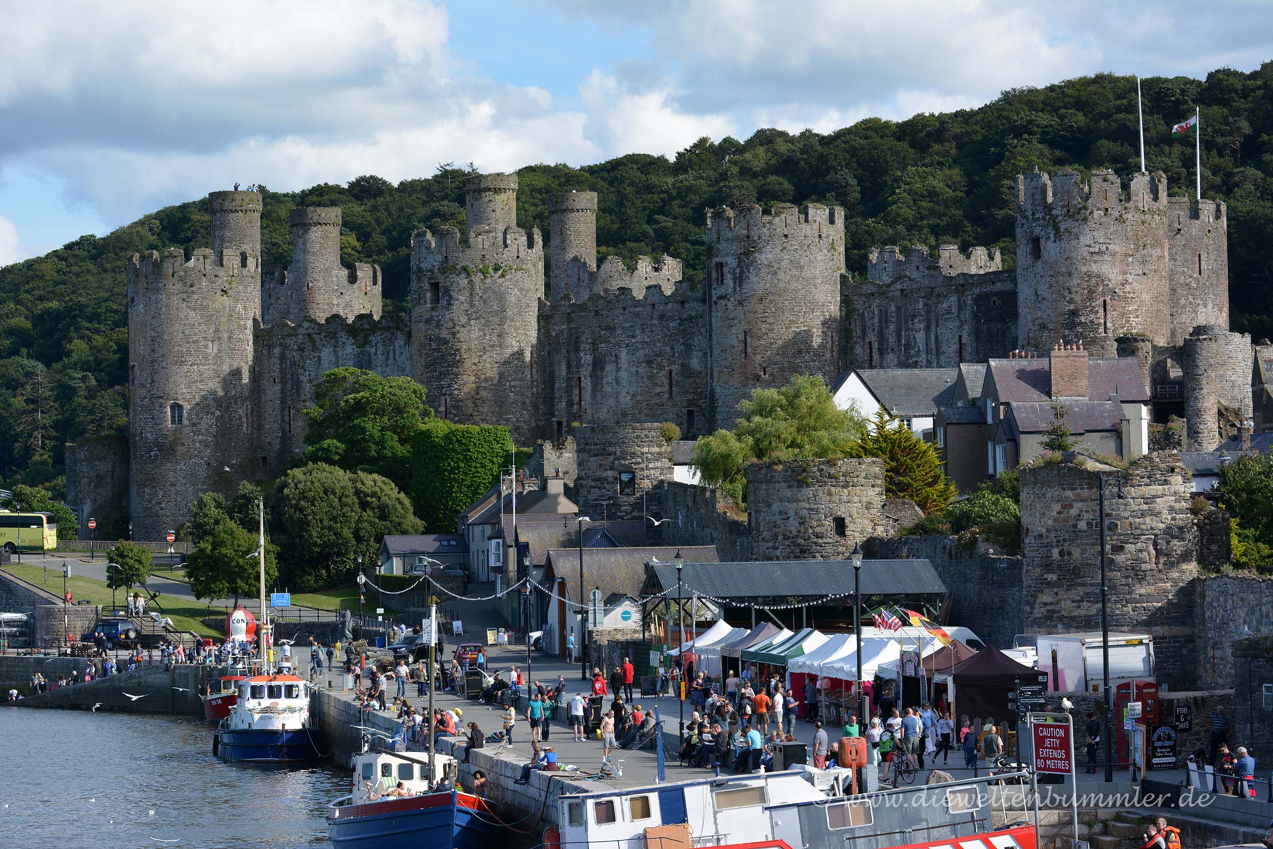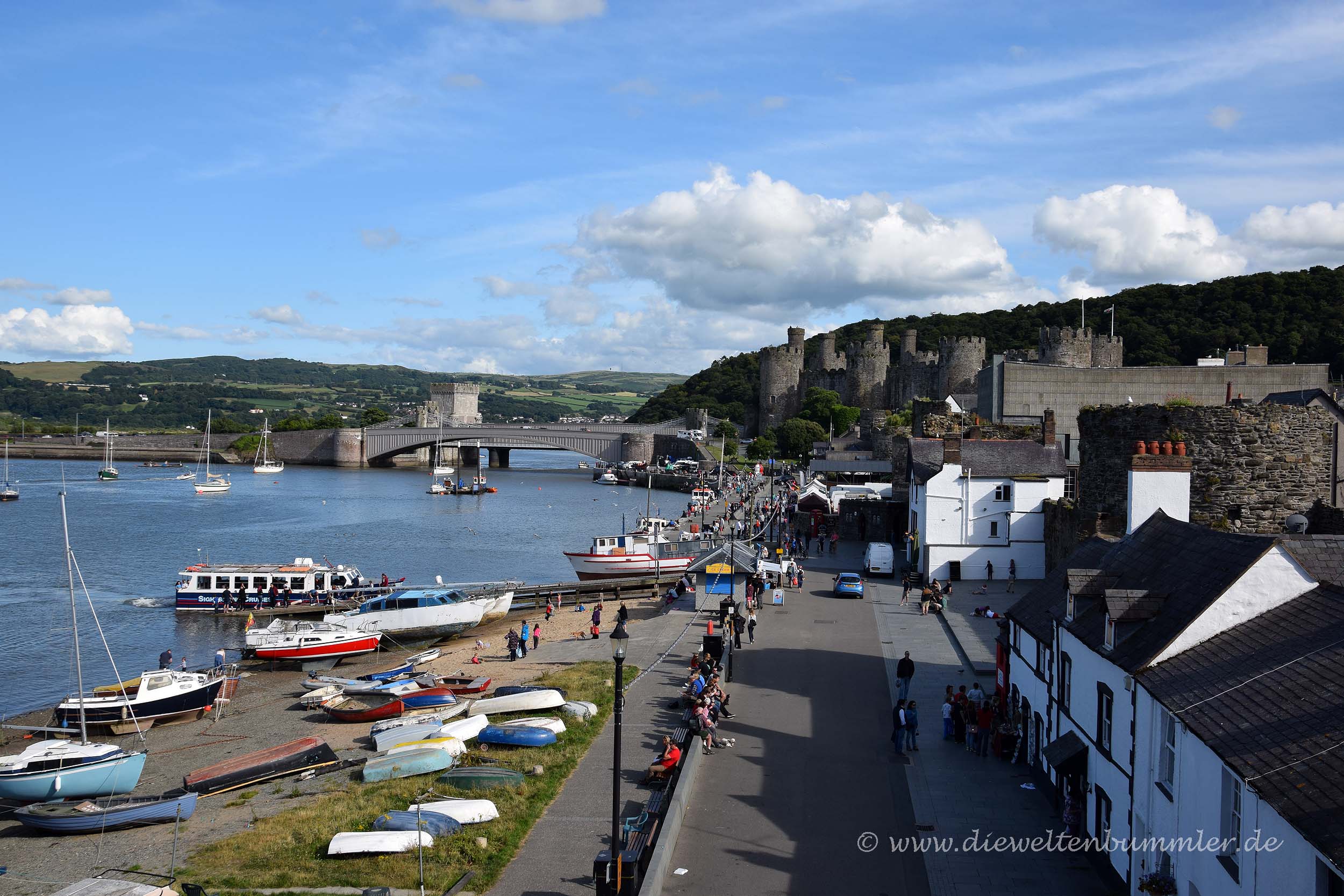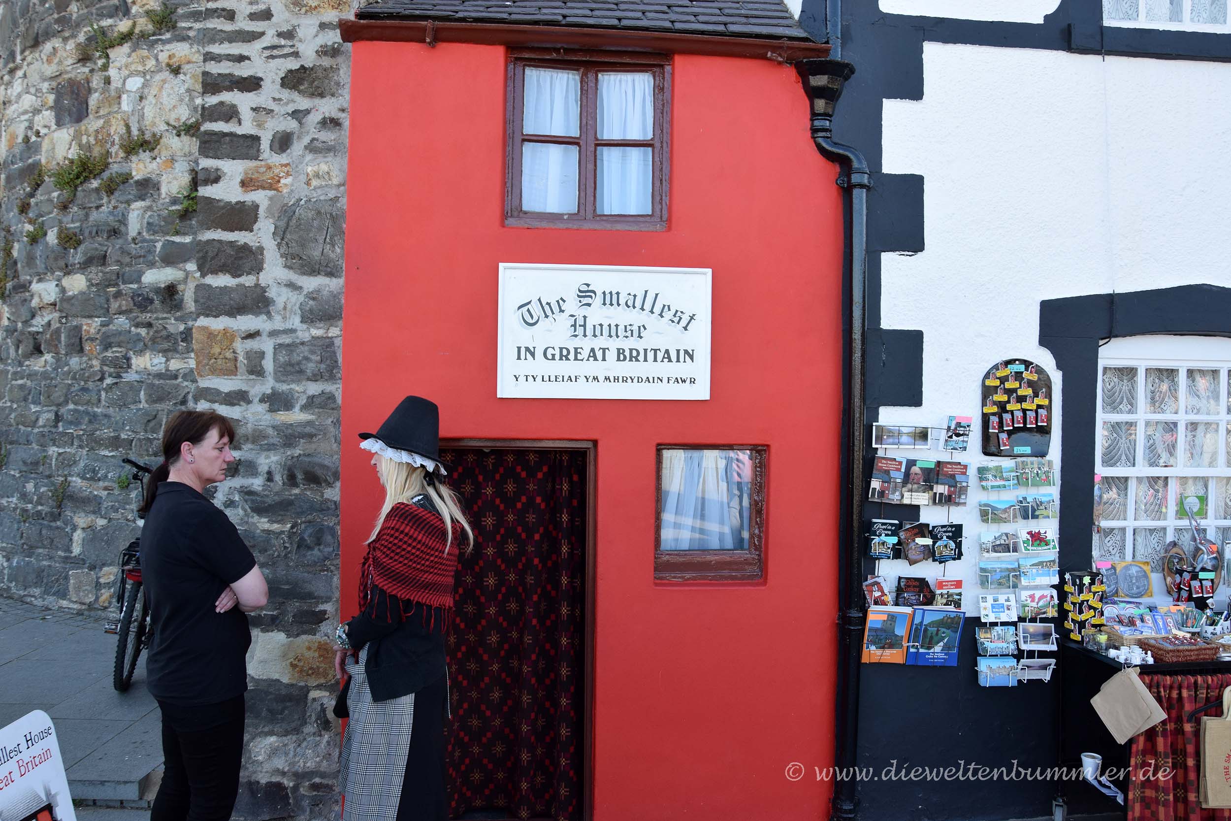 Wir fuhren nur ein relativ kurzes Stück durch Wales, bis wir unser nächstes Zwischenziel erreichten. Die Ortschaft Conwy hat nicht nur eine nette Innenstadt, sondern beherbergt zudem das vierte und letzte der vier genannten Castles. Wir parkten auf dem Wohnmobilstellplatz von Conwy, bei dem die Bezeichnung Stellplatz ein wenig übertrieben ist. Aber immerhin kann man hier parken, das ist ja schon mal etwas. Durch eine Unterführung gelangten wir in die Altstadt, die im Wesentlichen aus der Hafenpromenade besteht. Doch diese Promenade gibt zusammen mit Conwy Castle ein wirklich schönes Bild ab und außerdem befindet sich dort das kleinste Haus Großbritanniens. Im Gegensatz zum Schloss, wo der Eintritt nicht ganz so günstig ausfällt, wollten wir das kleinste Haus jedoch gerne besichtigen. Der Eintritt kostet einen Pfund, den man bei der Dame vor dem Haus bezahlt. Innendrin wäre kein Platz für eine Kasse. So muss man als Besucher auch noch Schlange stehen, um in das Haus zu gelangen, denn es werden maximal zwei Personen gleichzeitig hineingelassen. Das reicht aber auch, denn selbst dann wird es in dem kleinen Wohnraum schon sehr eng.
