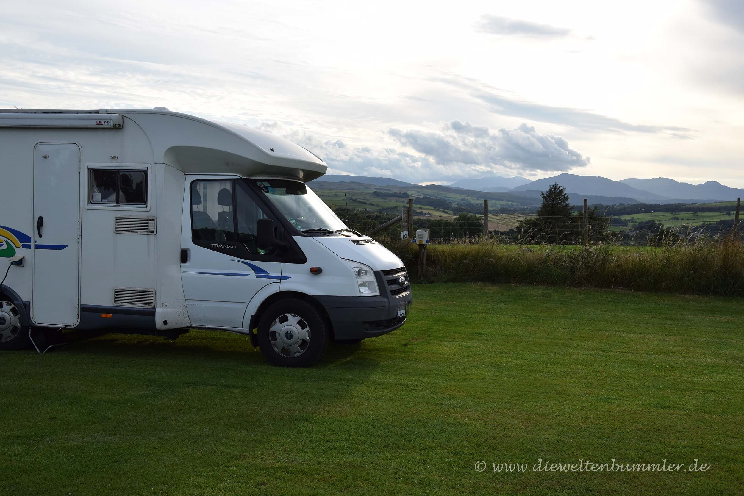 Eine Übernachtung auf dem sogenannten Wohnmobilstellplatz schlossen wir nach der Stadtbesichtigung aus und eigentlich wollten wir noch nach Llandudno. Doch das wäre mit unserem Zeitplan alles ein wenig kompliziert geworden, zumal Llandudno mal wieder so ein Ort ist, der nicht als wohnmobilfreundlich bezeichnet werden kann. Daher entschieden wir uns, wieder landeinwärts und dabei durch das Tal des River Conwy zu fahren. Es sollte sich herausstellen, dass das Tal wirklich sehr schön ist, was man aber auch schon an Hand der großen Anzahl von Campingplätzen vermuten könnte. Diese sagten uns aber aus den verschiedensten Gründen nicht zu oder die Einfahrten kamen zu plötzlich, sodass wir dann den nächsten Campingplatz ansteuern wollten. Nur irgendwann waren wir aus dem Tal heraus gefahren und hatten immer noch keinen Übernachtungsplatz gefunden. Außerdem waren wir auf der Suche nach einem kleinen Privatplatz, den wir bereits in unser Navi eingaben. Als wir uns den Zielkoordinaten näherten konnten wir kaum glauben, dass es dort noch einen Platz geben sollte, bis linker Hand plötzlich eine Art Campingplatz auftauchte.
