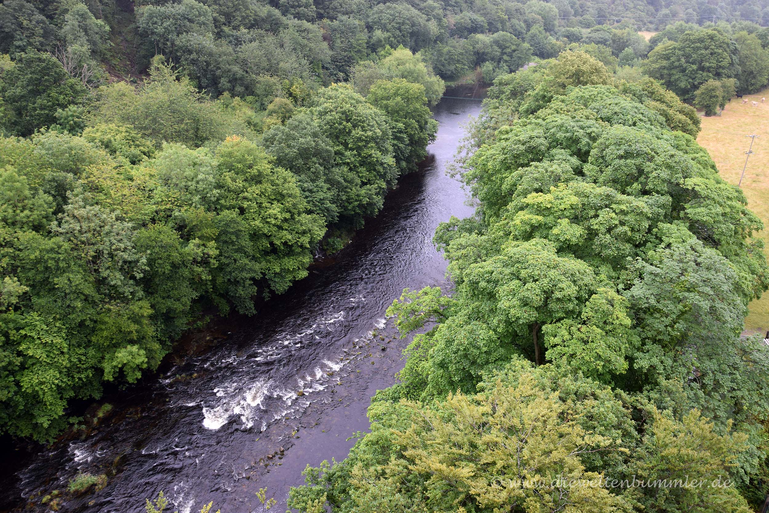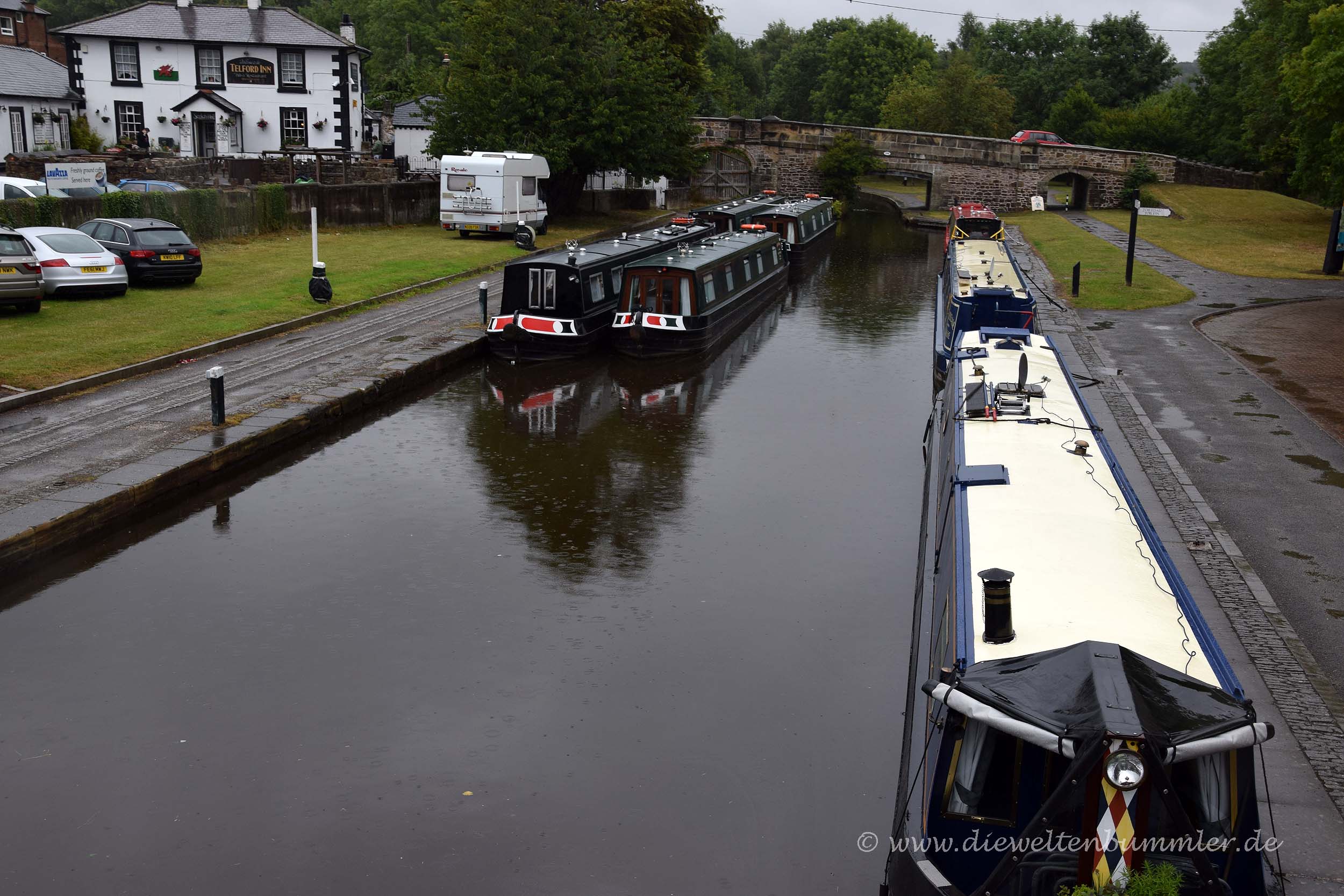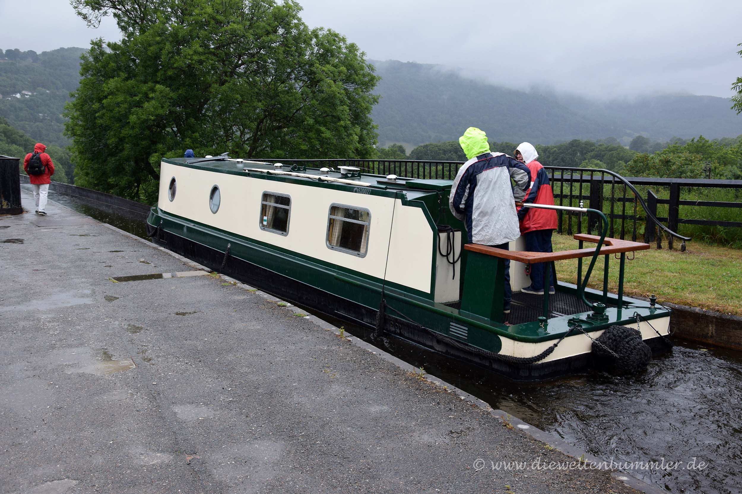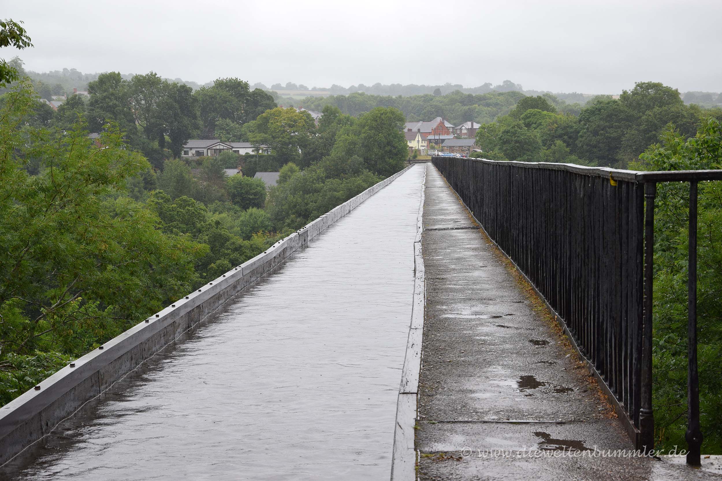 Dass wir am Vorabend die Sonne ein letztes Mal für längere Zeit sehen würden, kam natürlich nicht überraschend, war aber trotzdem blöd. Bei strömenden Regen rollten wir unsere Kabeltrommel auf und machten uns abfahrbereit. Wir folgten der Landstraße durch Wales und fuhren an Llangollen vorbei, wo wir kurz darauf unser Wohnmobil auf dem Parkplatz des nächsten Weltkulturerbes abstellten. Die Rede ist vom Pontcysyllte-Aquädukt, das sich über den Fluss Dee spannt. Das Besondere an der Brücke ist, dass man sie einerseits auf einem schmalen Weg zu Fuß überqueren kann, aber andererseits auch einen Trog besitzt, indem die typischen schmalen Narrowboote verkehren.