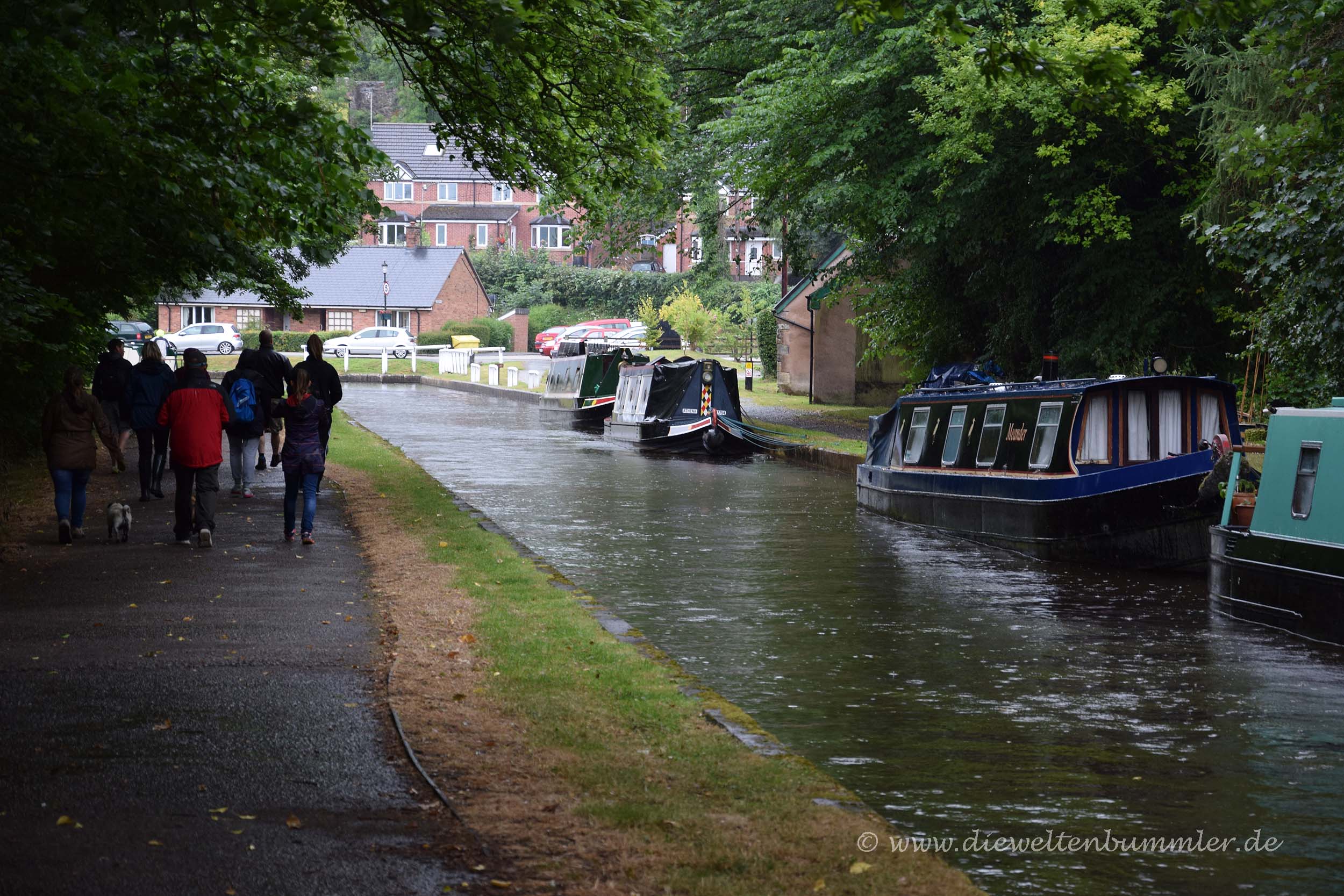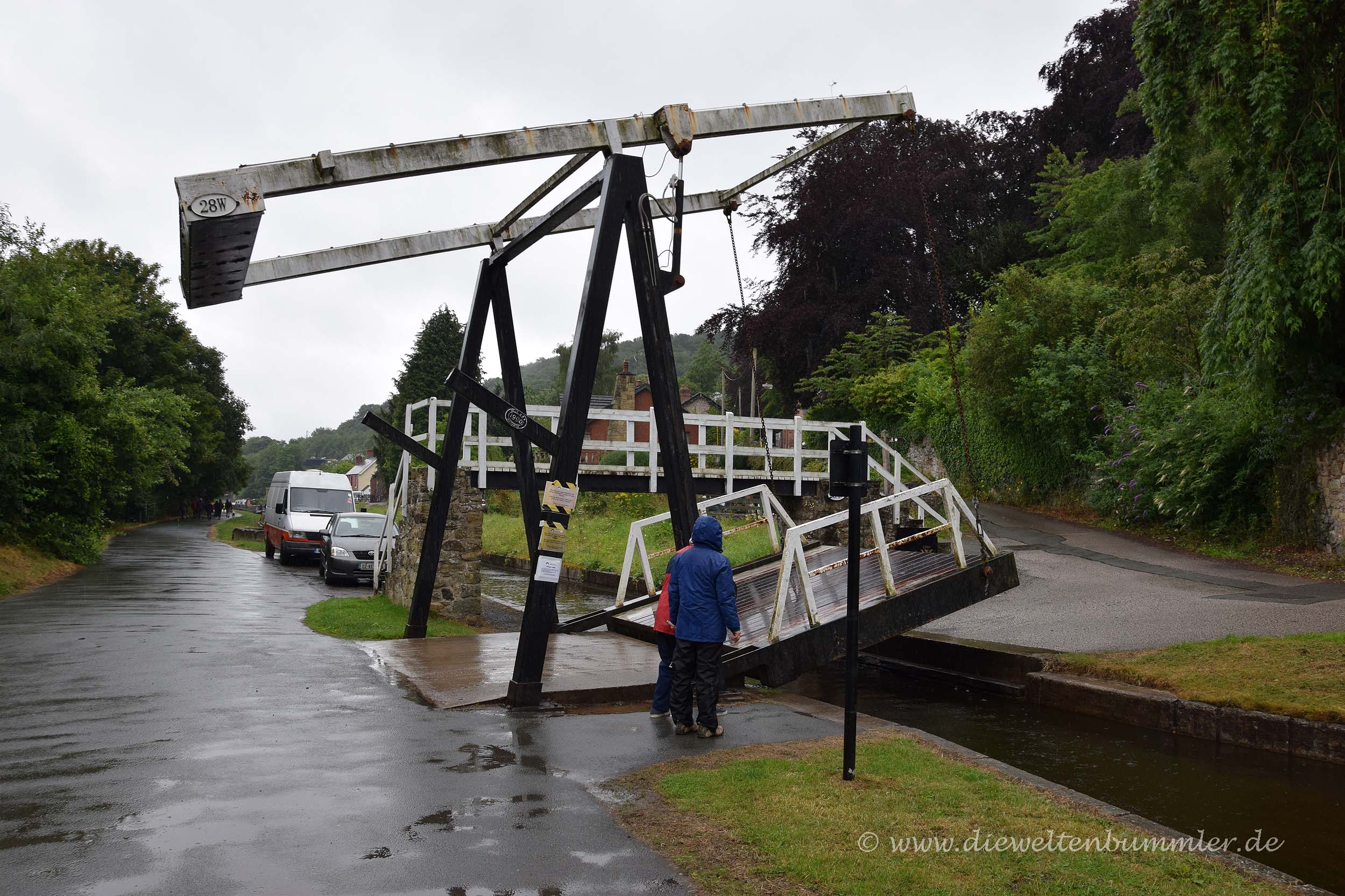 So spaziert man also über die Brücke und kann gleichzeitig einen kurzen Plausch mit den Hobby-Kapitänen in den Narrow-Booten führen, wenn diese gerade langsam an einem vorbeifahren. Obwohl es die gesamte Zeit regnete und die Wolken sehr tief hingen, gefiel es uns hier so gut, dass wir nicht nur die Brücke besichtigten bzw. überquerten, sondern noch ein Stück weiter gingen. Wir wollten einfach wissen, was hinter einer Kurve kommt und wohin die schmalen Boote verschwinden. Der Llangollen-Kanal, der mittels des Pontcysyllte-Aquädukts über den Fluss Dee geführt wird, macht nämlich eine Kurve, hinter der wir beobachten konnten, wie eine Person aus den Schiffchen aussteigen muss, um mit der Hand eine kleine Hebebrücke hochzukurbeln, damit die Boote weiter auf dem schmalen Kanal fahren können.