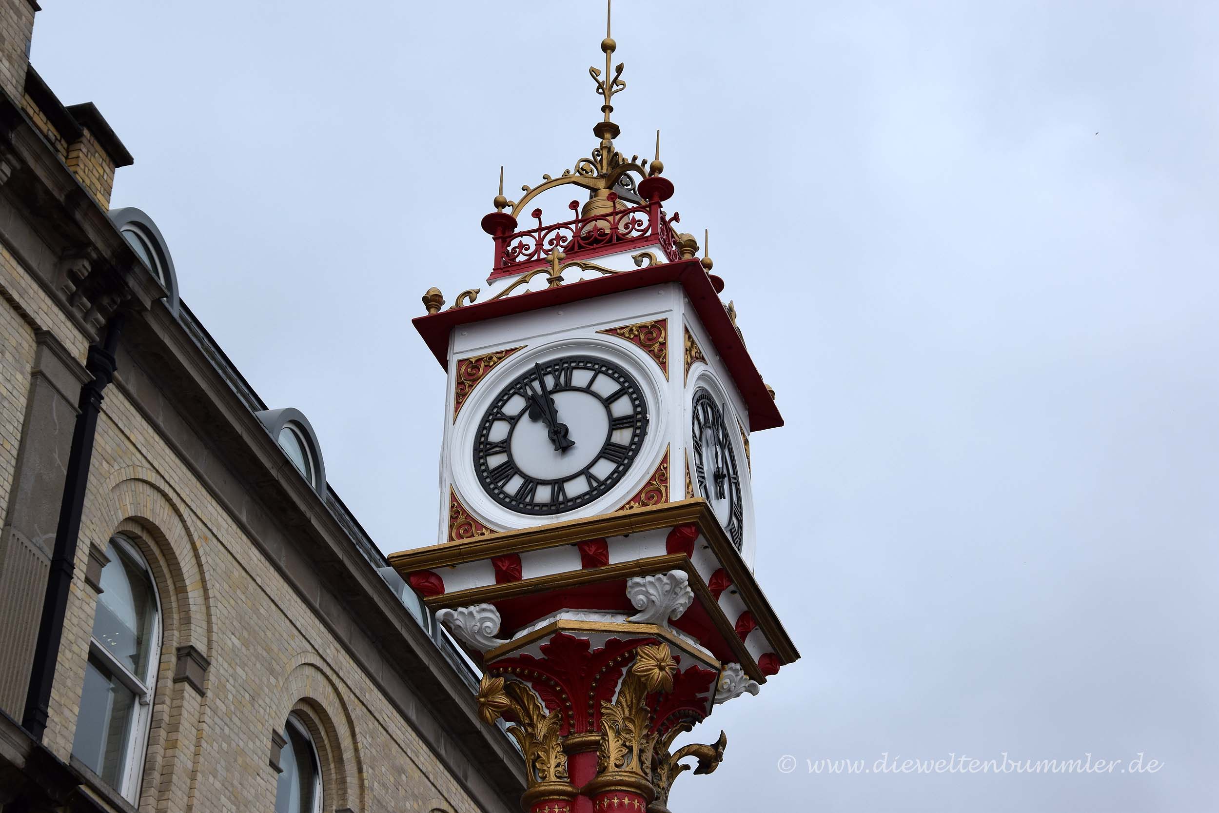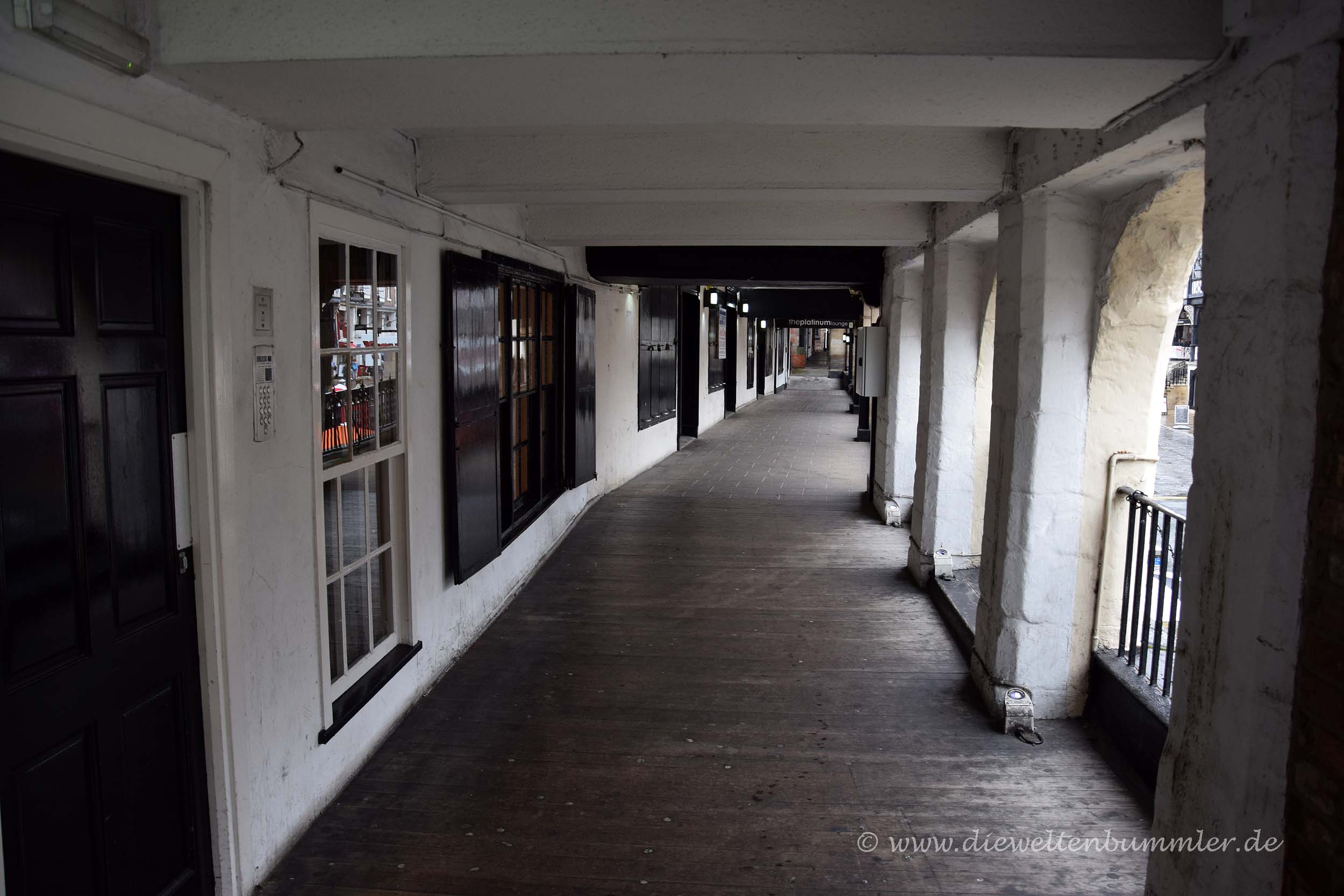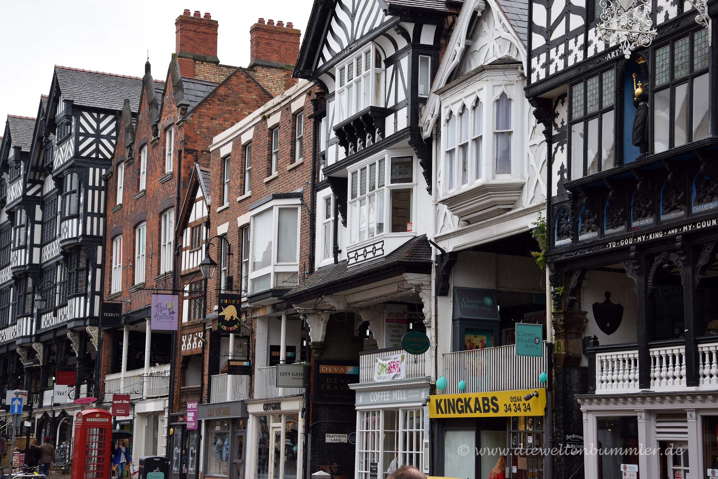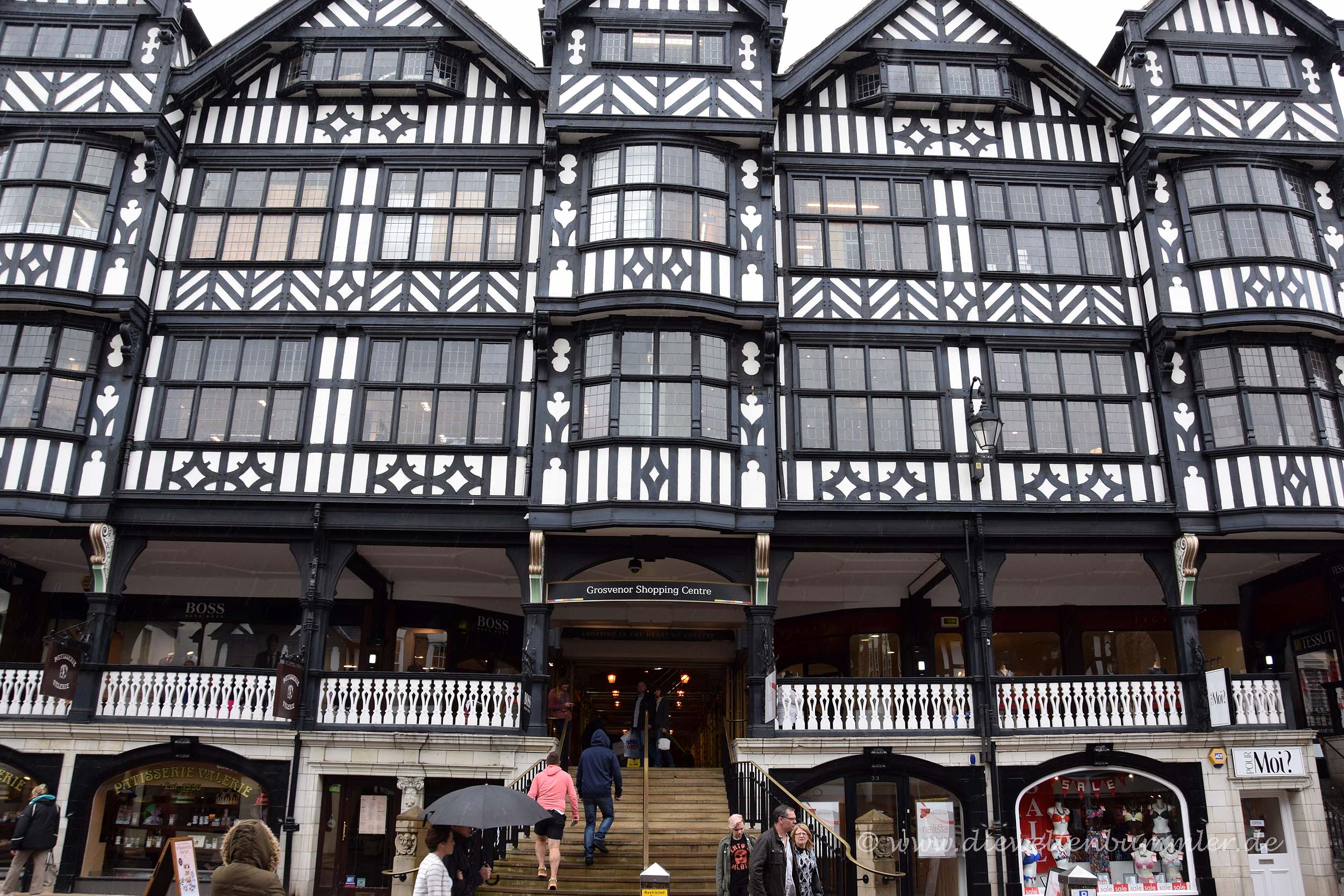 In Chester hatten wir eigentlich nicht allzu viel vor, außer, dass wir ein wenig durch die Altstadt schlendern wollte. Diese besticht mit einigen Fachwerkhäusern und wirkt dadurch deutlich schöner als so manch andere britische Innenstadt. Etwas Besonderes sind aber die sogenannten Rows. Hierbei handelt es sich um Kolonnaden in den ersten Etagen der hiesigen Geschäftshäuser. Sie befinden sich oberhalb der Ladenlokale im Erdgeschoss und bieten so die Möglichkeit, auf zwei Etagen Schaufenster zu besichtigen bzw. einkaufen zu gehen. Da die Rows logischerweise überdacht sind, waren diese bei dem Regen ganz gut besucht.
