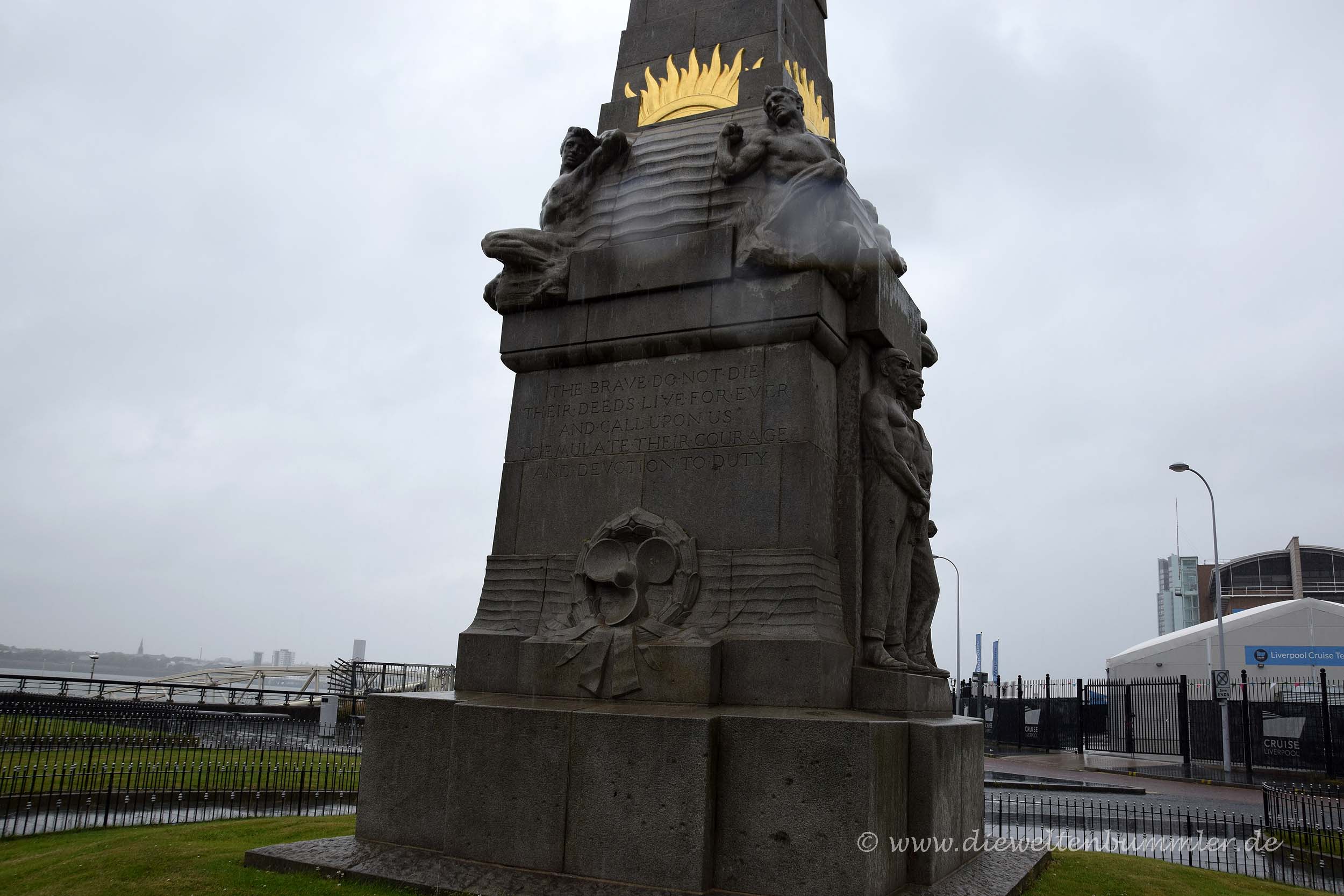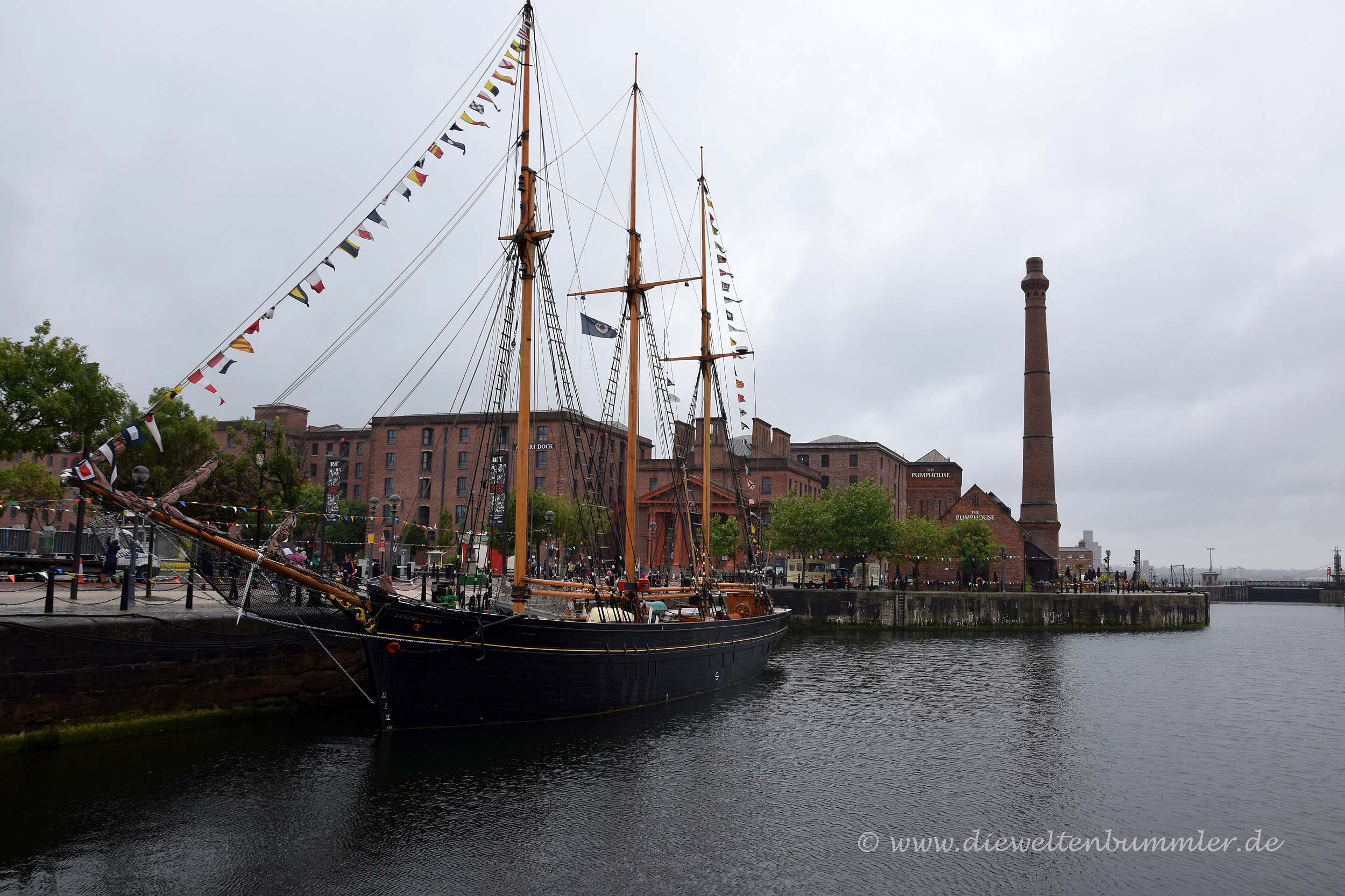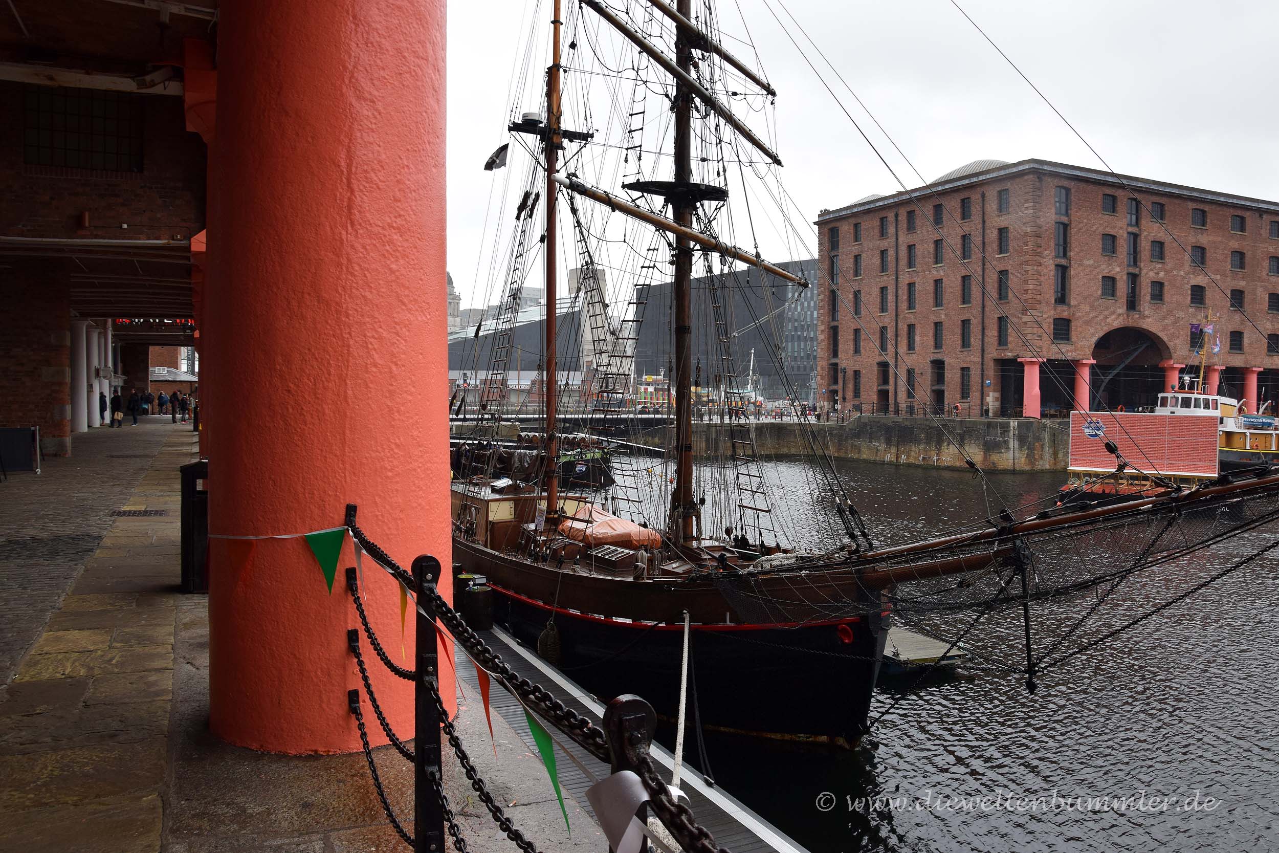 Als wir ihn erreichten, wollte Moni erst am Wohnmobil bleiben, denn die Gegend so nicht besonders sicher aus. Aber es war noch so viel Zeit bis zu unserer Abfahrt und außerdem bräuchte ich ja auch noch ein wenig Bildmaterial von Liverpool. So zogen wir gemeinsam los und schlenderten durch das Hafenviertel von Liverpool, das eine Mischung aus verfallen und renoviert abgibt. Den verfallenen Teil ließen wir schnell hinter uns und wurden auf ein Denkmal zu unserer Linken aufmerksam, auf dem die argentinische Flagge zu sehen war. Das machte uns natürlich neugierig. Es erinnerte an das Schiff Mimos, das hier an dieser Stelle im Jahr 1865 ablegte, um 162 Auswanderer aus Wales nach Argentinien brachte, wo diese eine neue Siedlung gründete. Das sprach uns erst recht an, denn wir wussten genau, welche Siedlung gemeint war, da wir einige Jahre zuvor eben dort unterwegs waren, als wir durch Südamerika reisten.