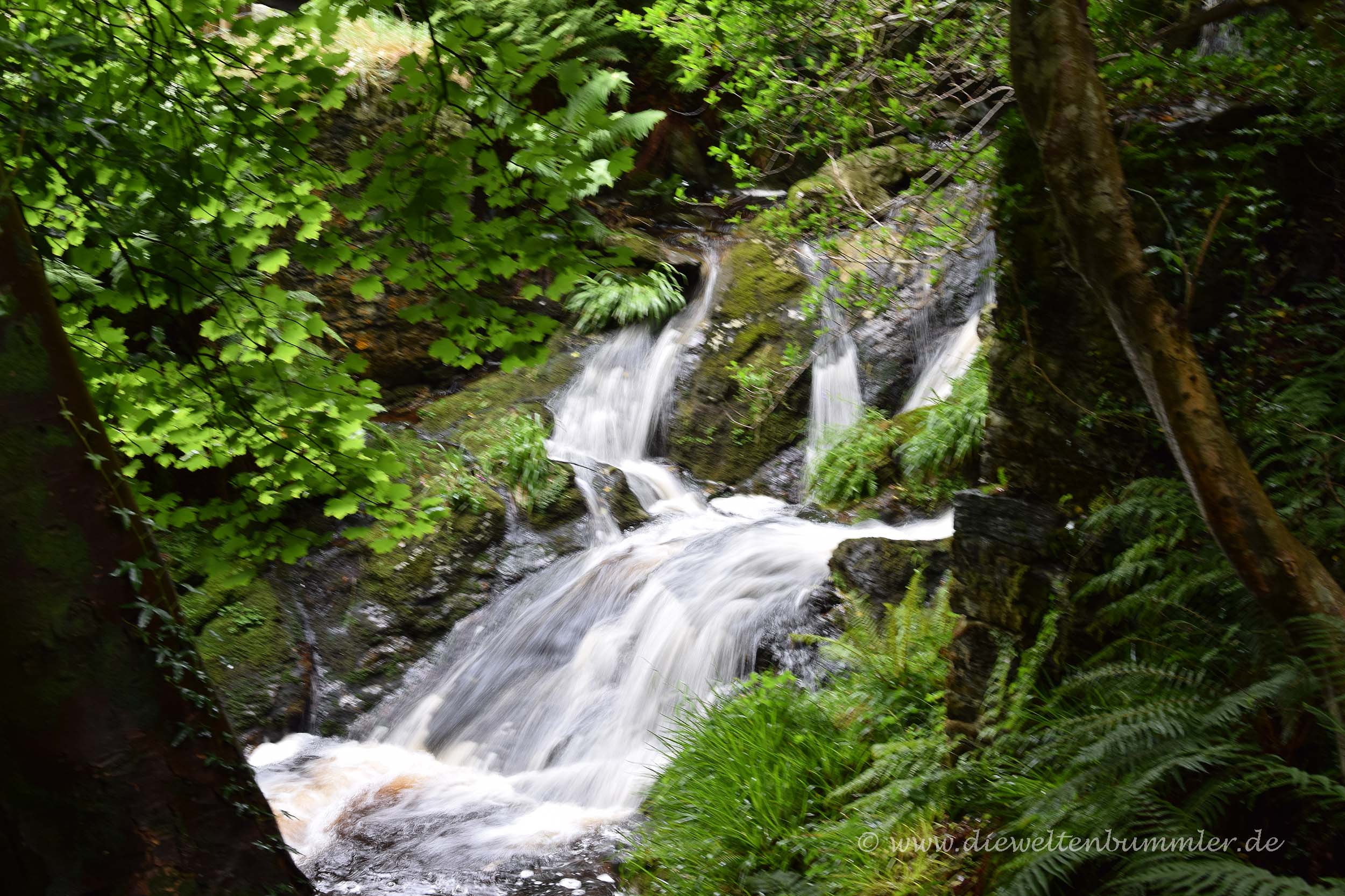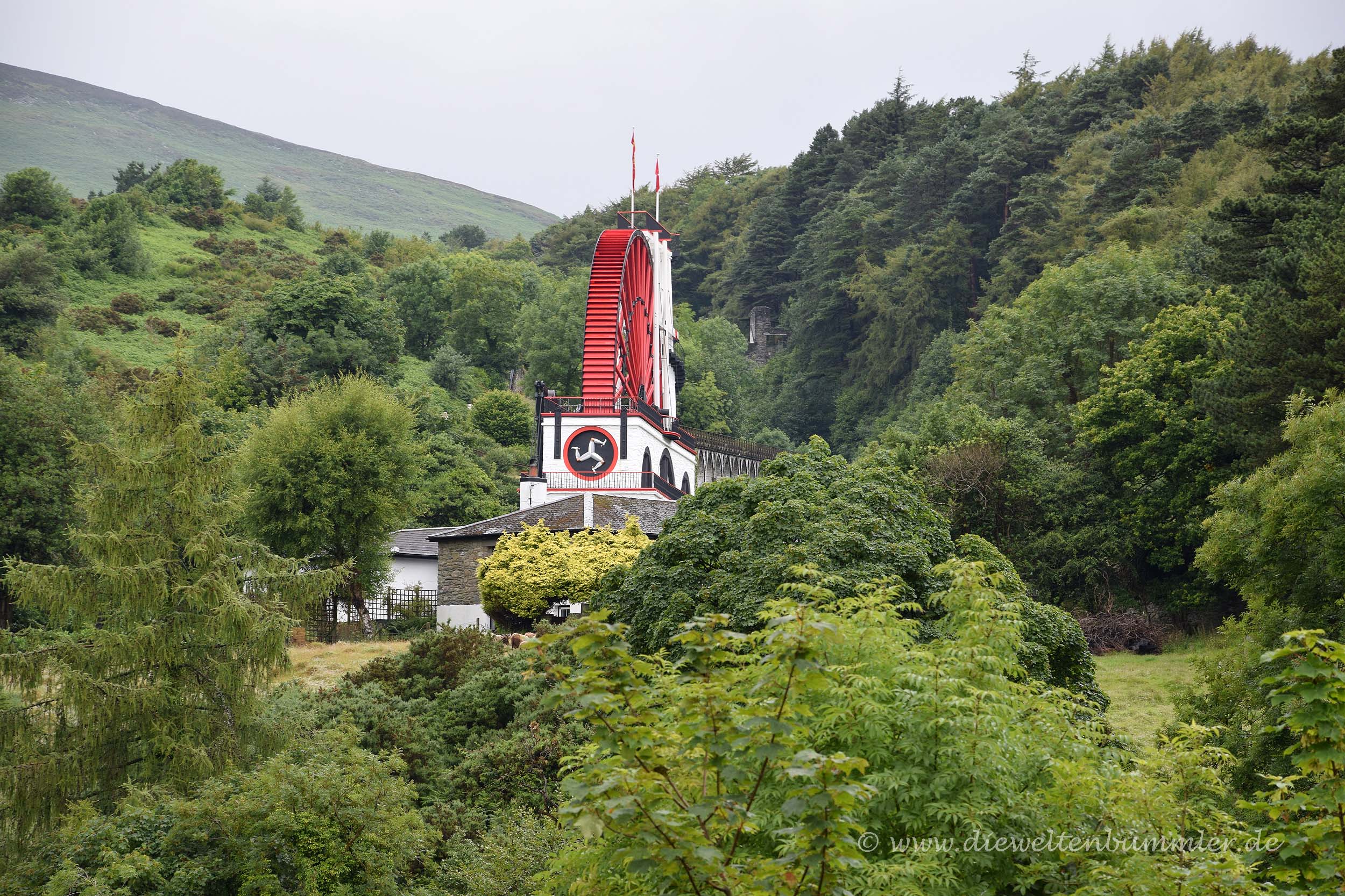 Leider spielte das Wetter nicht ganz mit. Man kann zwar nicht behaupten, dass es regnete, sondern eher nur von einem gelegentlichen Tröpfeln sprechen, doch die graue Wolkendecke hing so oder so tief. In Laxey wurde uns auch sogleich gewahr, dass auch hier auf der Insel enge Straßen existieren können. Allerdings hielten diese sich noch in Grenzen, als wir gleich im Ort die erste Sehenswürdigkeit besichtigten. Über einen kurzen Fußweg an einem sehr kleinen Wasserfall vorbei, gelangten wir zum Laxey Wheel, bei dem es sich um das größte Wasserrad der Welt handelt. Und in der Tat, groß war es.