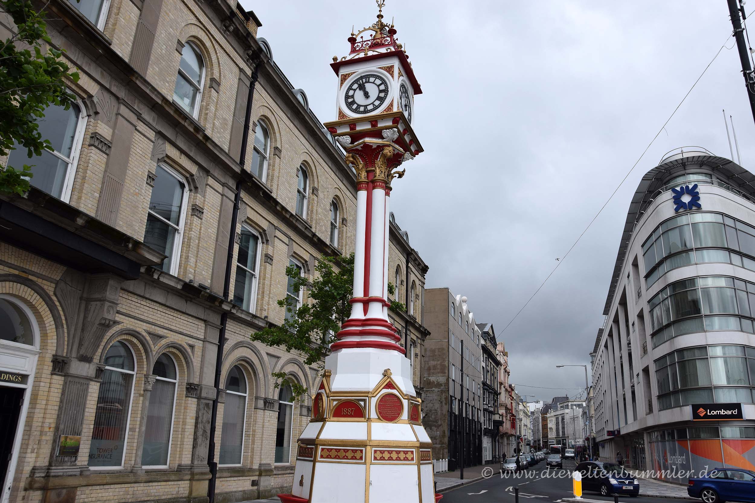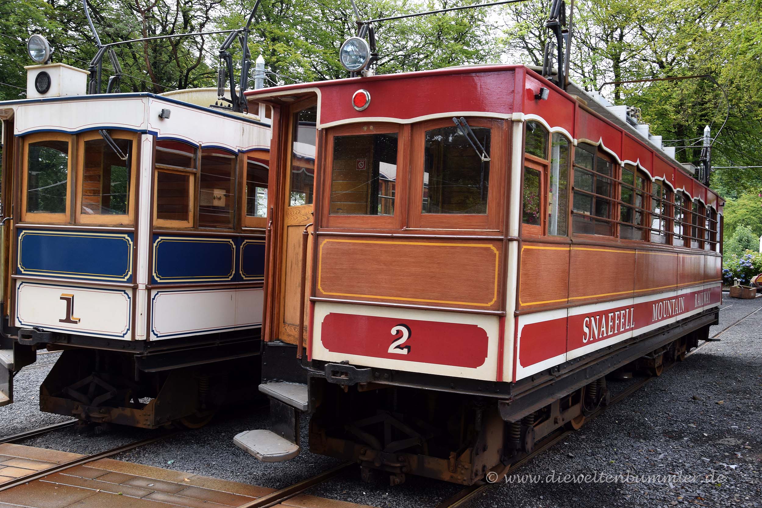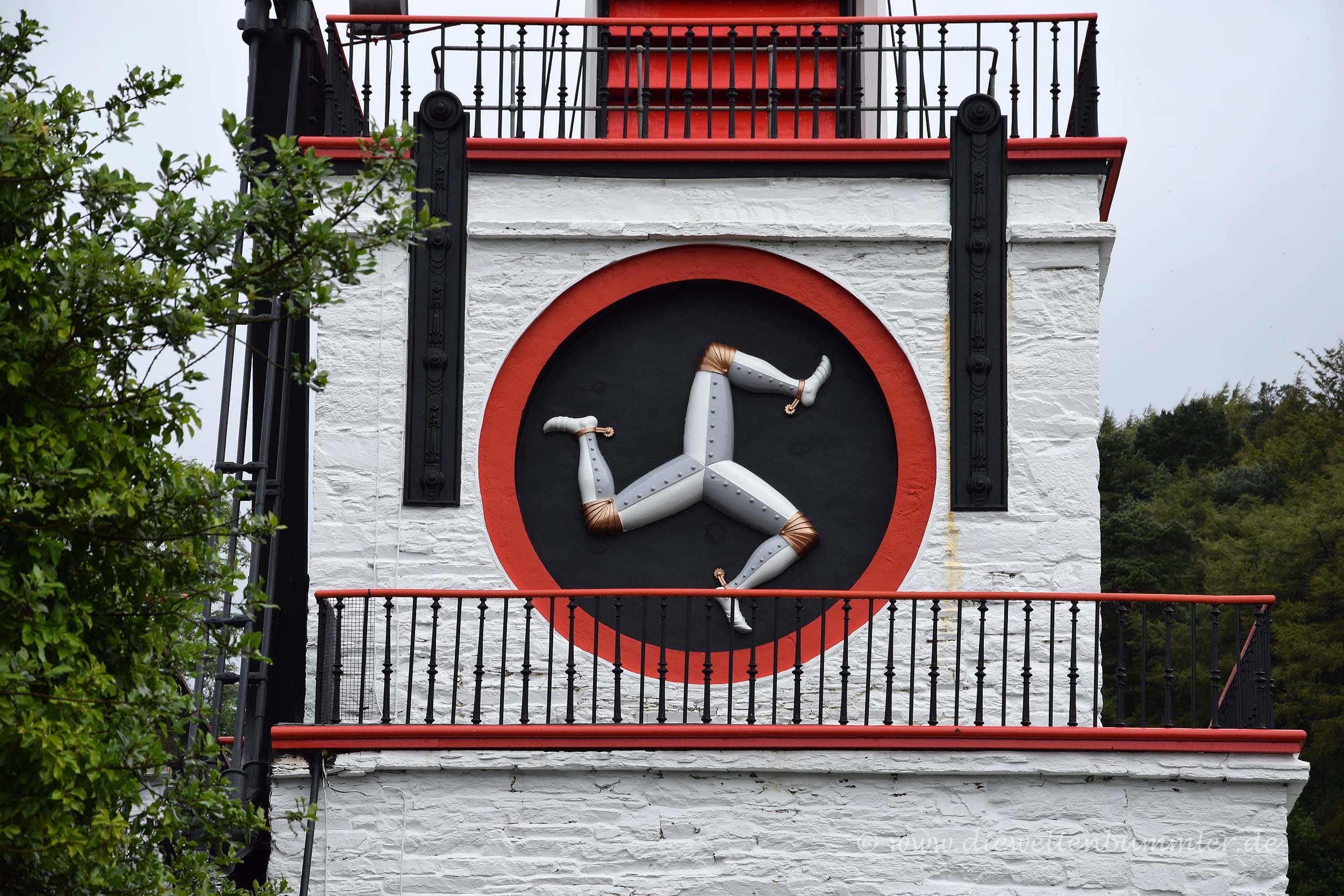 Das weiß-rote Rad und das zugehörige Gebäude schienen aus einem Wald hervor zu lugen und bestimmten die Landschaft oberhalb von Laxey. Besonders auffällig war dabei das Wappen der Isle of Man, das aus drei Beinen besteht, die zusammen eine Triskele bilden. Wie wir im Laufe unseres Aufenthaltes feststellten, war die Triskele in zahlreichen Variationen fast überall auf der Insel zu sehen. Nicht weit vom Wasserrad entfernt, was in dem kleinen Ort Laxey natürlich nicht schwer ist, warfen wir noch einen Blick auf Snaefell Mountain Railway. Mit dieser Bahn kann man auf den höchsten Gipfel der Insel, dem Snaefell fahren. Angesichts der Wetterlage verschoben wir das jedoch auf später, da wir natürlich auch auf eine schöne Aussicht hofften.