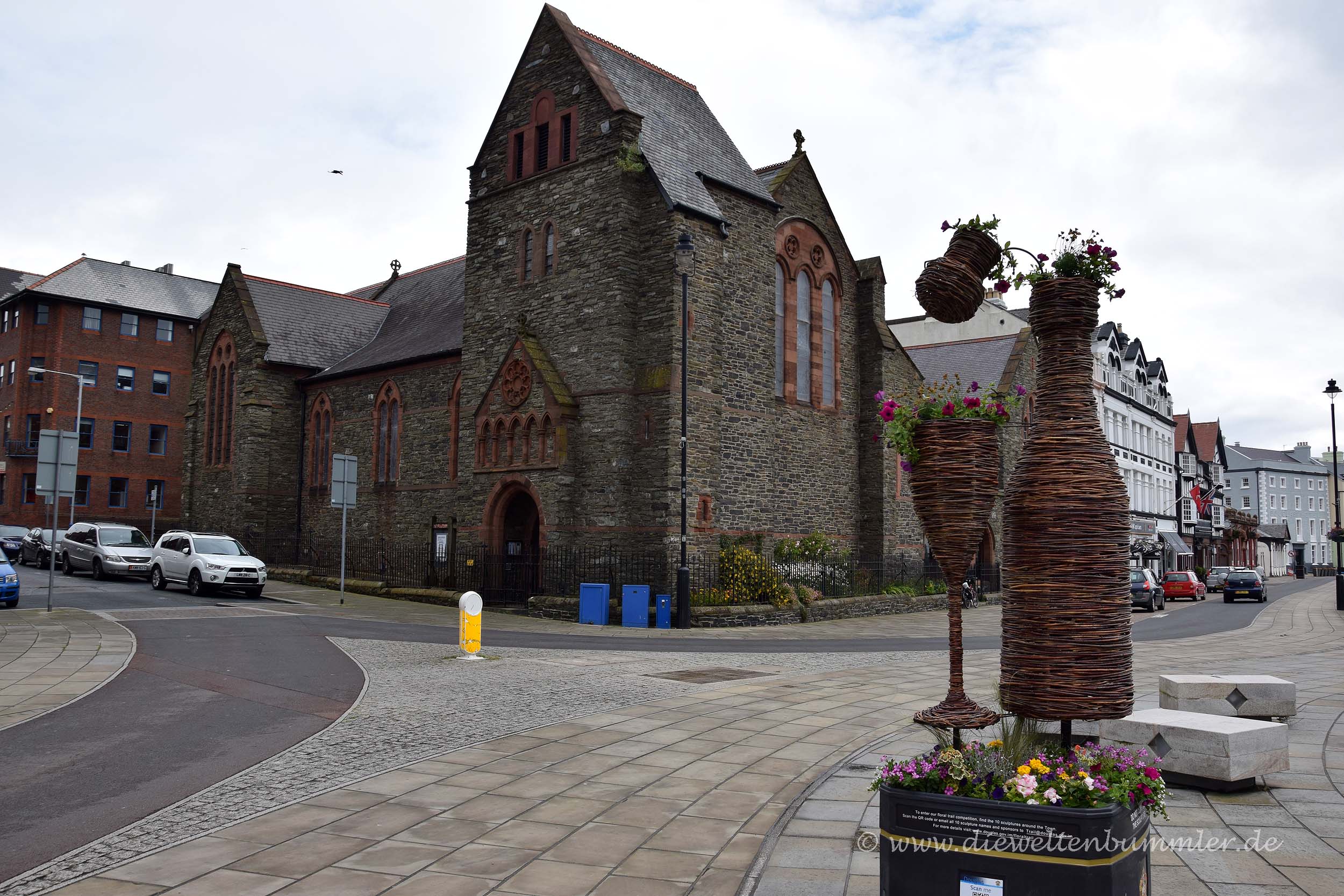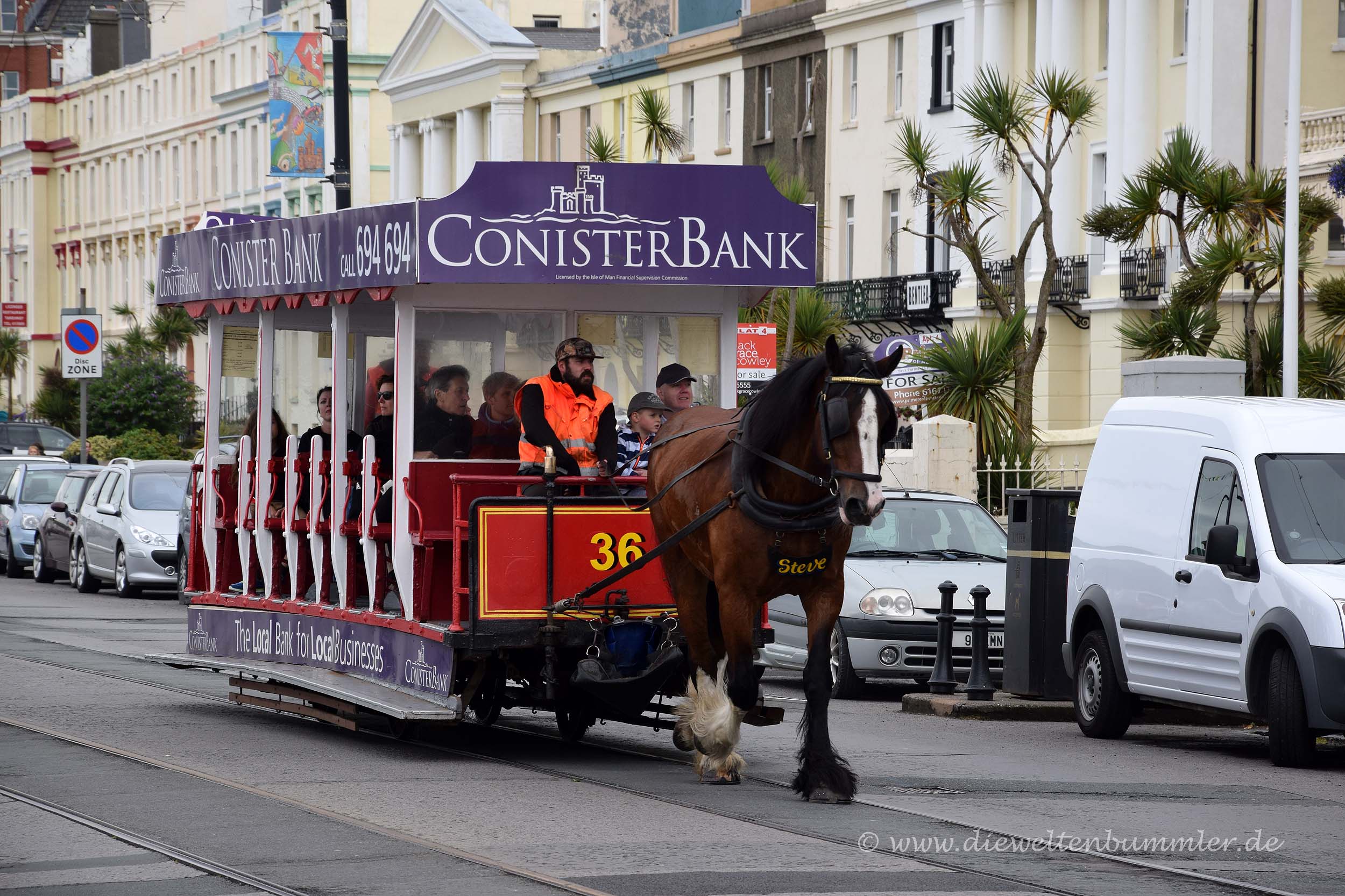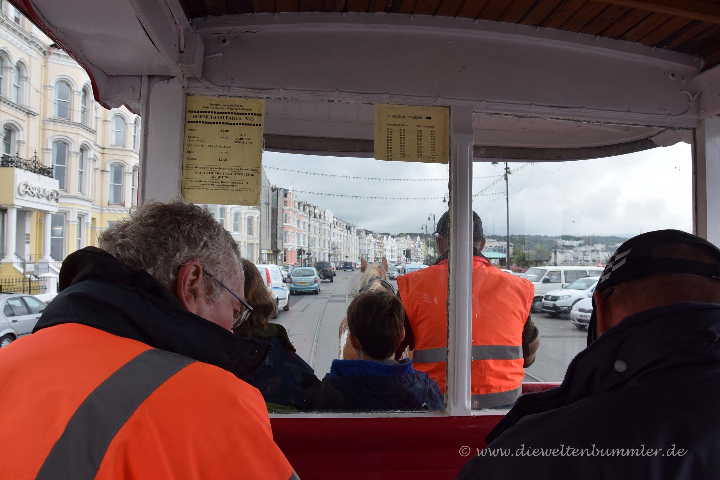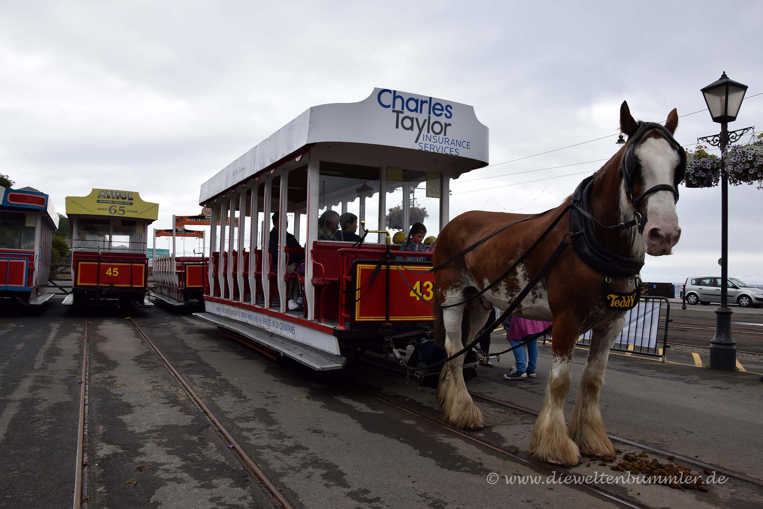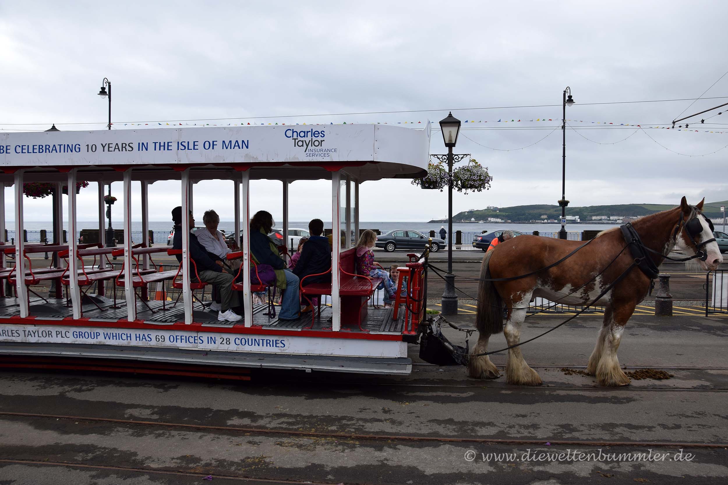Daher beschlossen wir zunächst, einen Blick in die Hauptstadt zu werfen, die wir ja bei unserer Ankunft am Vorabend nur halbwegs im Dunkel gesehen und schnell durchquert hatten. Schon während unserer Fahrt auf der Promenade kam uns das Wahrzeichen von Douglas entgegen. Dabei handelt sich um eine Pferdestraßenbahn, die tagsüber an der Promenade pendelt. Wir machten schon während dieser Begegnung direkt Fotos aus dem fahrenden Wohnmobil von dem Gefährt, das das Pferd hinter sich herzog. Dass wir die Pferdestraßenbahn später noch oft genug sehen würden, war uns zu diesem Zeitpunkt noch nicht klar.