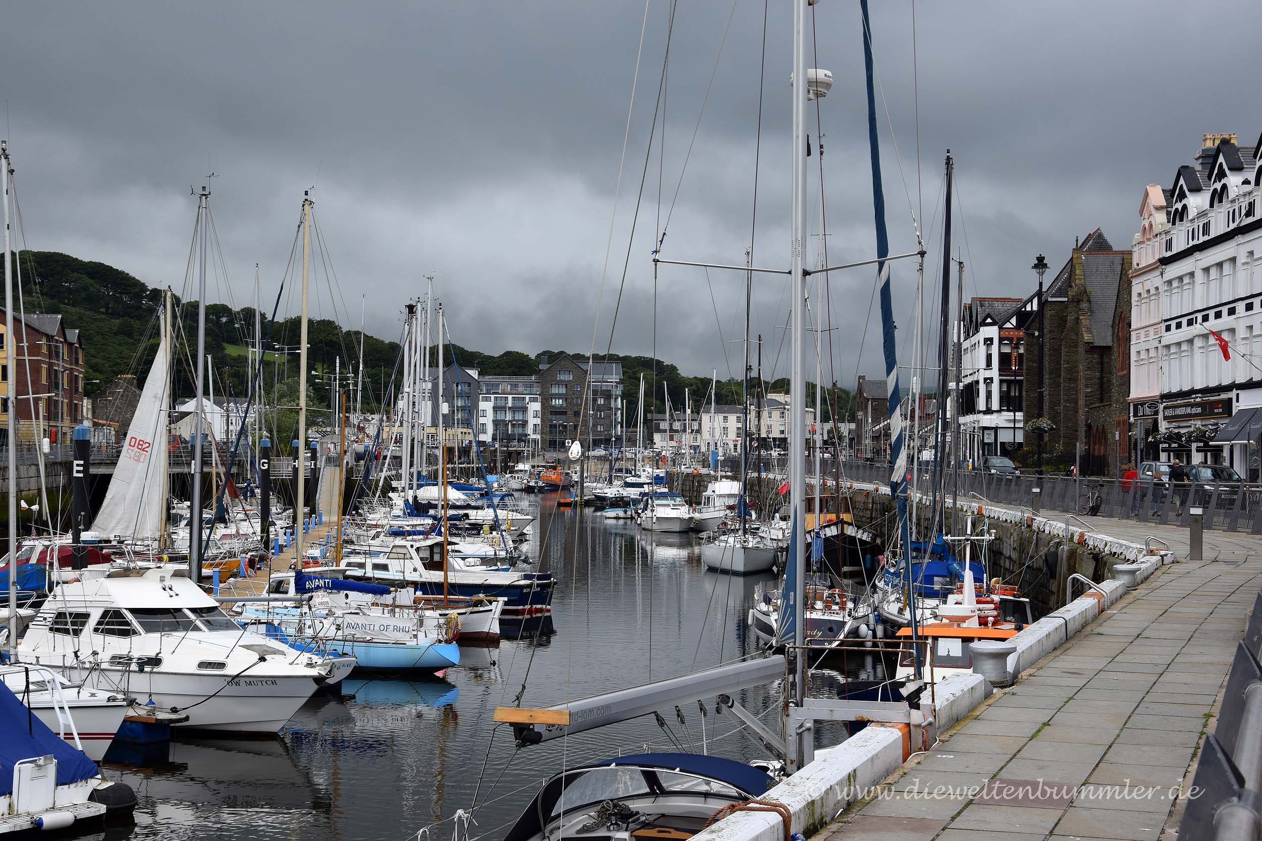 Das Wetter war leider immer noch schlecht, als wir über die Irische See zur Isle of Man fuhren und außerdem fuhren wir in die Dunkelheit hinein. Zu allem Überfluss saßen wir falsch. Wir hatten nämlich ausgerechnet den Bereich des Schiffs ausgewählt, wo laute Musik plärrte und die anderen Fahrgäste laut schreiend zusammensaßen. Das fiel uns aber irgendwie viel zu spät auf bzw. merkten wir erst, dass es ruhigere Bereiche im Schiff gab, als wir es bei der Ankunft auf der Isle of Man verließen. Bis dahin war uns beiden aber ein wenig schlecht geworden. Die unruhige Atmosphäre um uns herum, das schaukelnde Schiff und die Dunkelheit machten die Fahrt nicht gerade zu einem Vergnügen und selbst ich war anschließend froh, endlich die Lichter der Hauptstadt Douglas zu sehen.