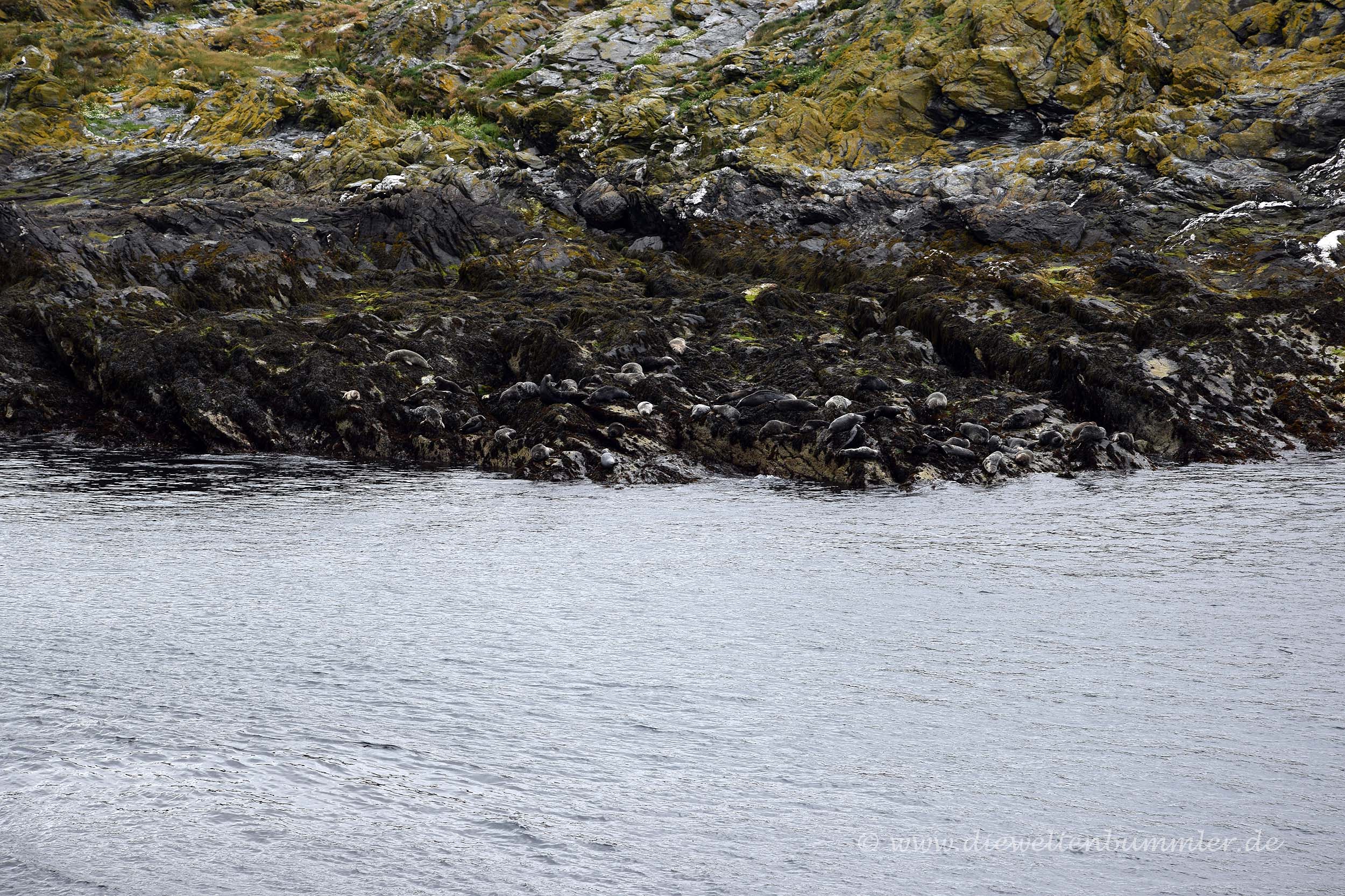 Anschließend verließen wir Douglas und steuerten den westlichsten Zipfel der Insel an. Dieser befindet sich zugleich auch sehr weit im Süden und liegt am Calf Sound, einer kleinen Meerenge zwischen der Isle of Man und der kleinen Insel Calf of Man. In dieser Meerenge wiederum kann man einen Blick auf die noch kleinere Insel Kitterland werfen. Kitterland besteht aus nicht mehr als ein paar Felsbrocken und erst beim genauen Hinsehen erkannten wir, dass sich einige der Felsbrocken bewegten. Das waren nämlich nicht alles nur Steine, sondern auch Seehunde als Teil einer Kolonie, die es sich auf Kitterland bequem gemacht hatten und scheinbar die relativ nahen Menschen auf der anderen Seite des Wassers zu beobachten schienen.
