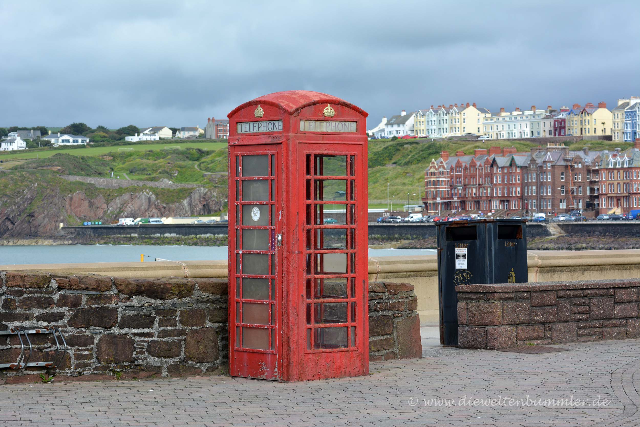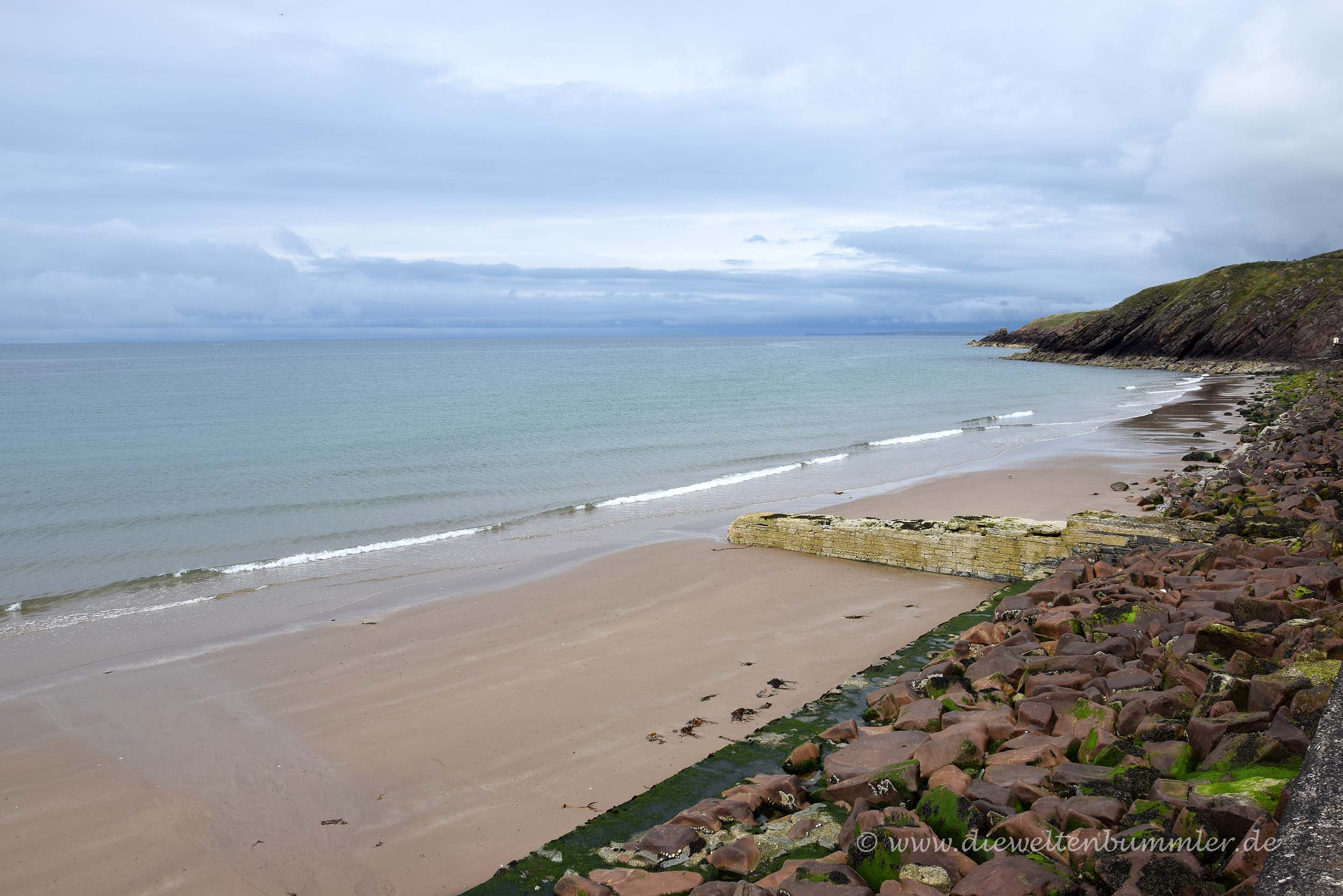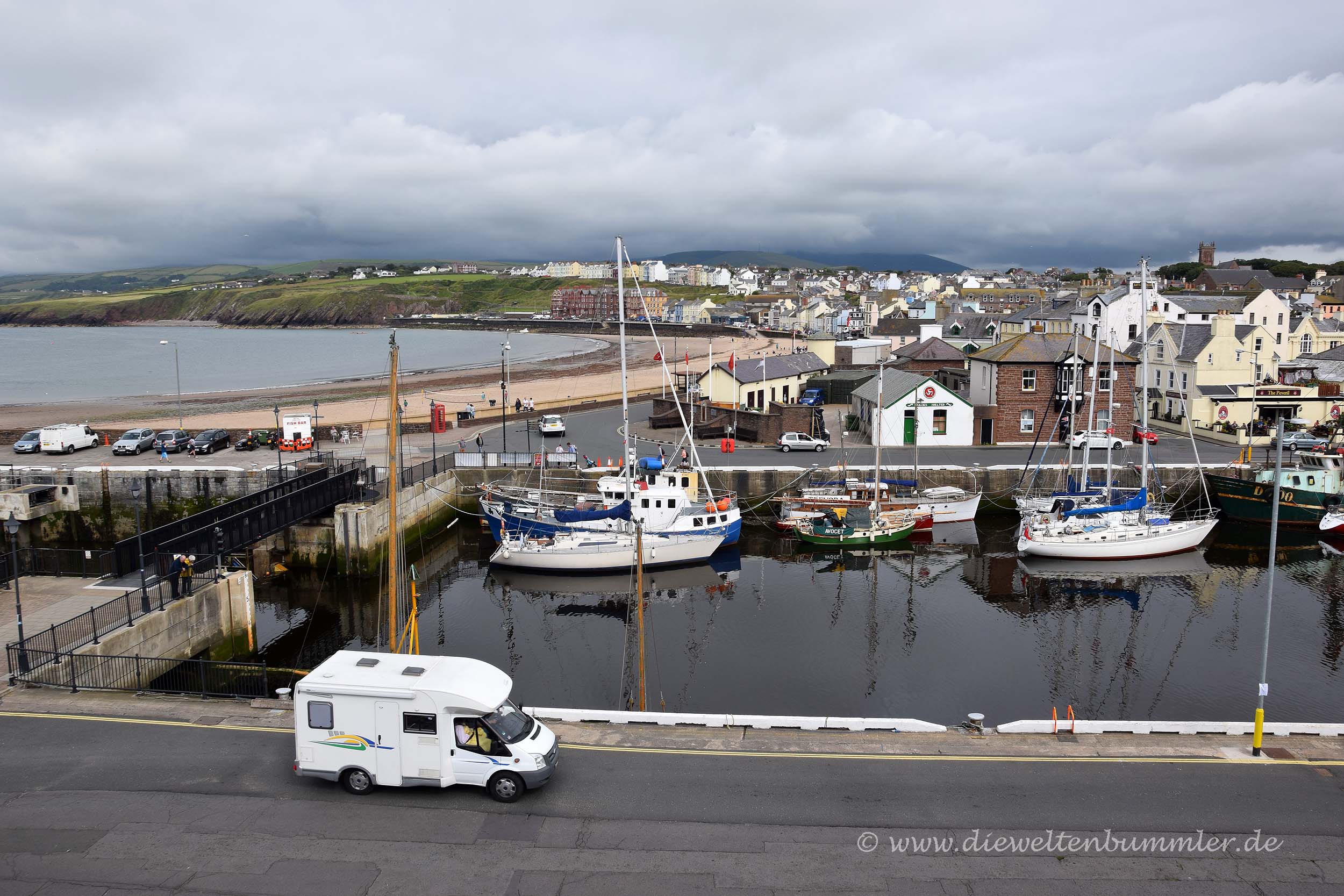 Als wir morgens wach wurden, waren wir auf dem Museumsparkplatz zum Glück noch alleine. Damit das auch so bleiben würde, setzten wir uns gleich nach dem Aufstehen hinter das Steuer und fuhren auf einen öffentlichen Parkplatz, um den Tag in Ruhe anzugehen. Dieser Parkplatz befand sich in der Bucht von Laxey, einem kleinen Ort nördlich der Hauptstadt Douglas.