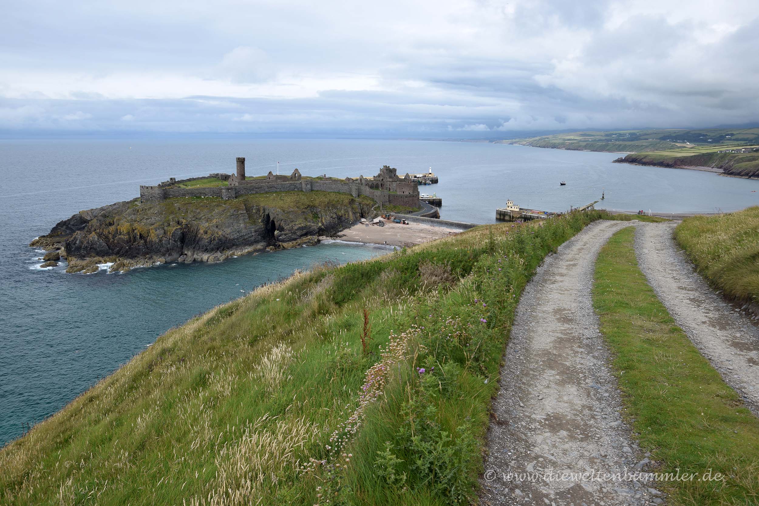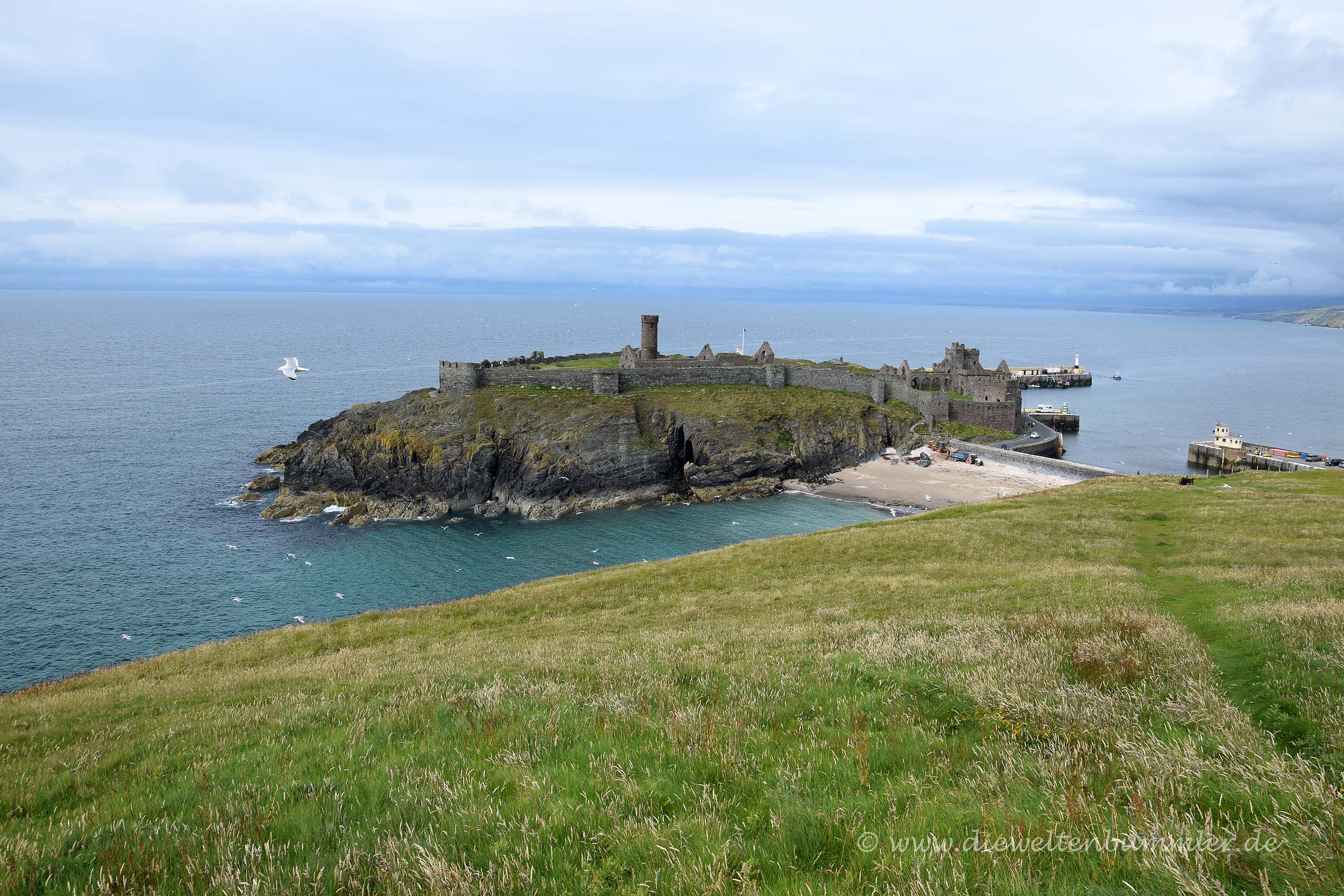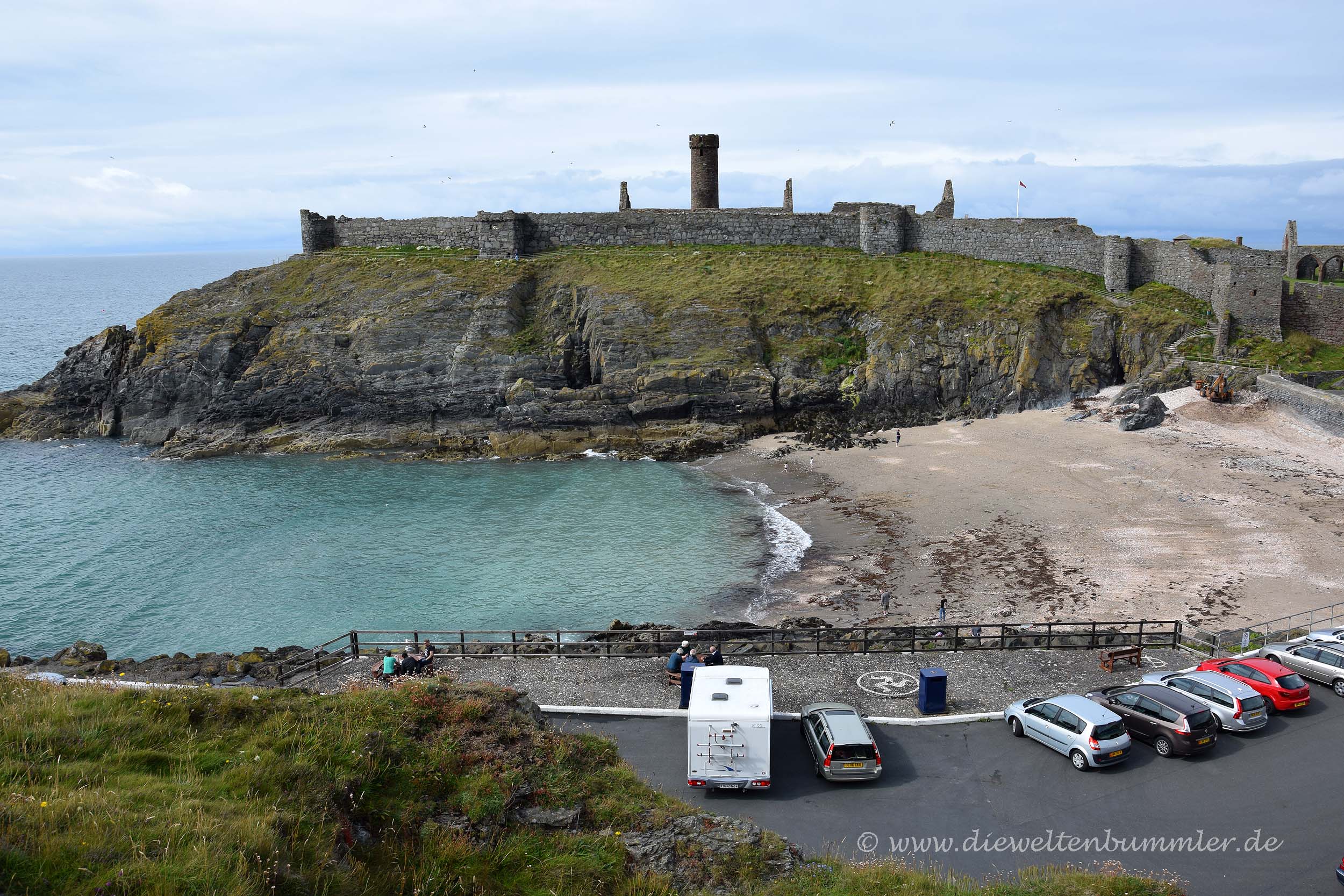 Natürlich machten wir auch am Calf of Sound ein Pingu-Foto bevor wir weiterzogen. Unser Weg führte uns nordwärts, wo wir zwischendurch immer mal wieder anhielten und die wunderbare Küstenlandschaft betrachteten. In der Kleinstadt Peel kamen wir dann länger zum Stehen, denn dort parkten wir am Ende des Strandes und spazierten an diesem entlang zum Peel Castle. Dieses erhebt sich auf der kleinen St. Patricks-Insel, die über einen Damm mit dem Rest der Isle of Man verbunden ist. Etwas oberhalb der Festung hat man einen wunderbaren Blick auf die Burg und auf die Stadt Peel, doch wir wanderten an der Festungsmauer auch einmal um die Burg herum.