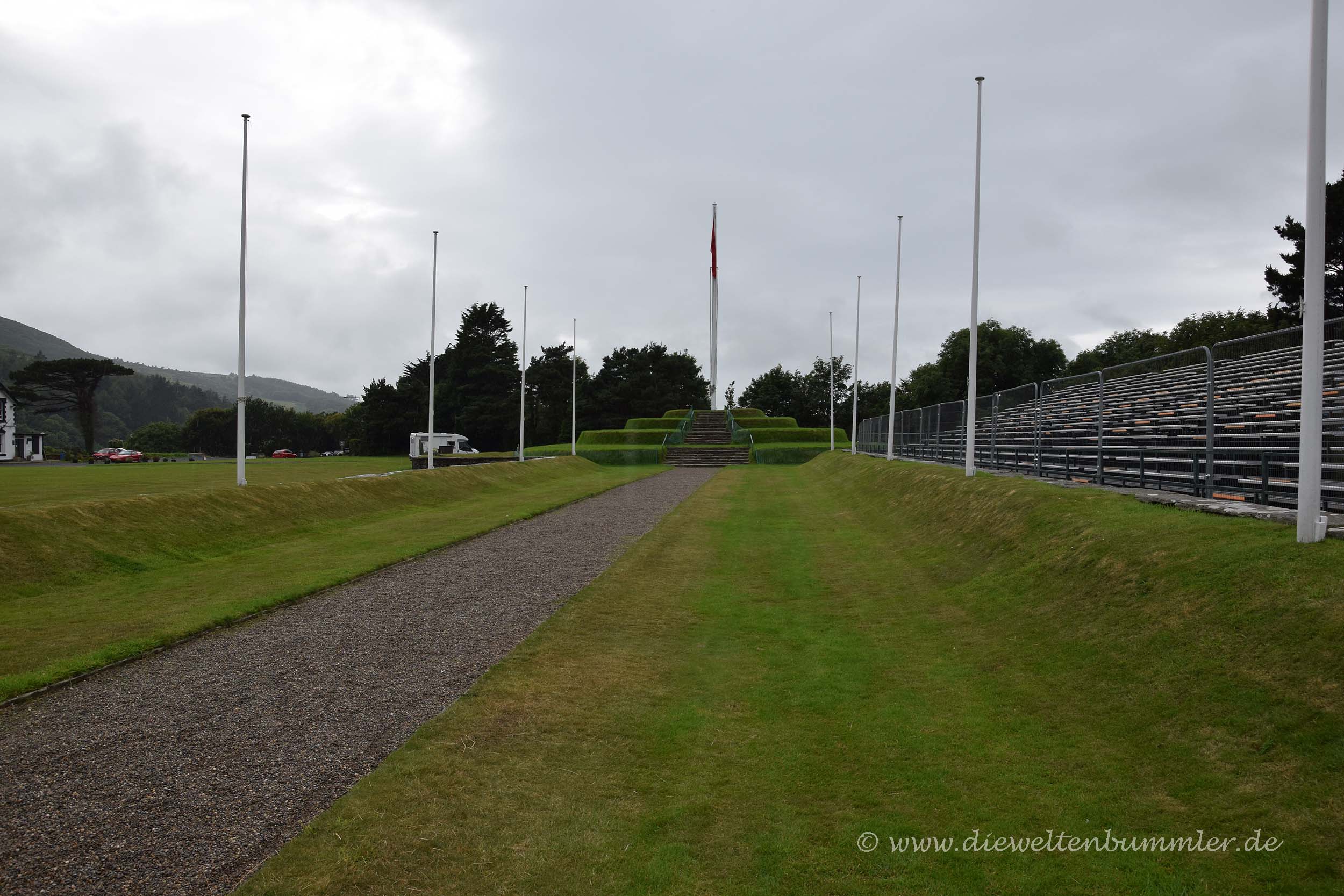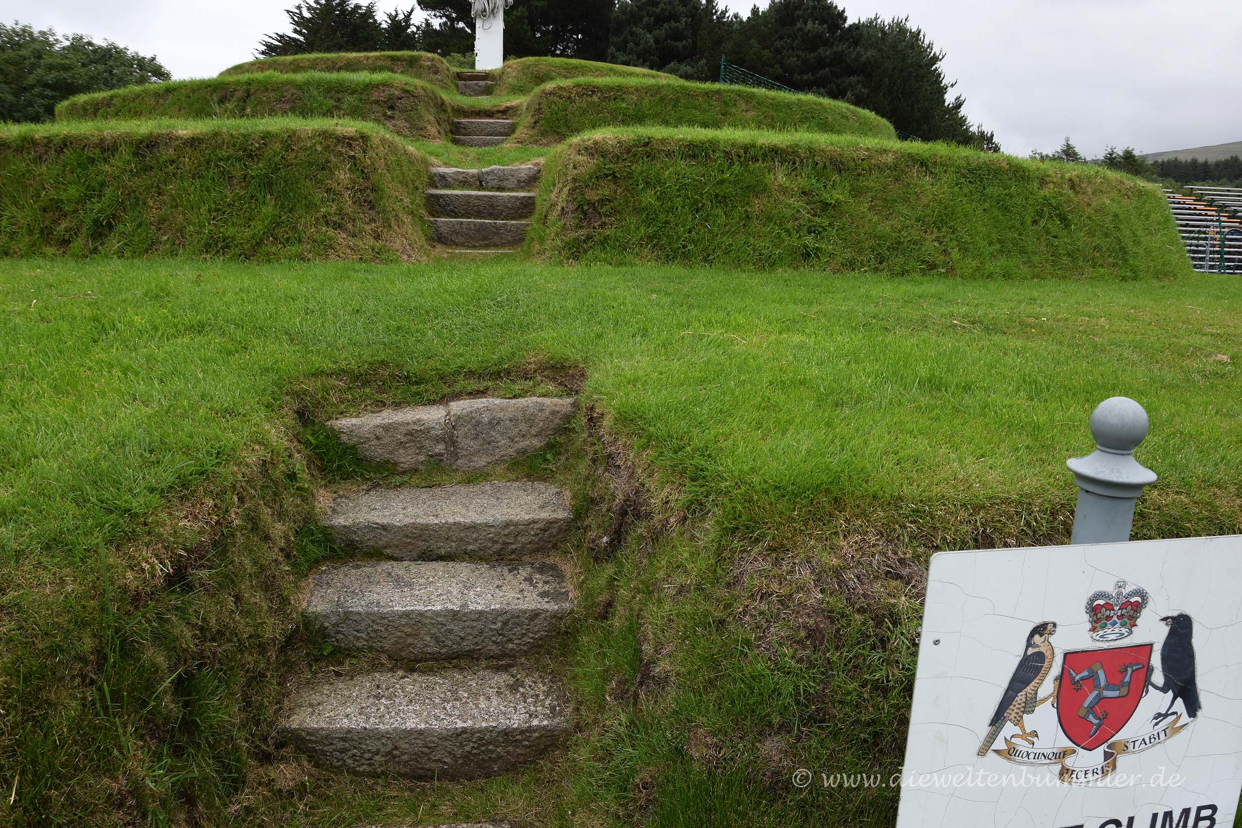 Nicht ganz so weit von Peel entfernt, befindet sich der Tynwald und der Tynwald Hill, auf dem einmal im Jahr das Parlament der Insel zusammen kommt und tagt. Für die Manx, also den Bewohnern der Isle of Man, ist der Tynwald Hill ein bedeutender Ort. Wir wollten auch einen kurzen Blick auf den Hügel werfen, doch fanden ihn nicht auf Anhieb, weil eine Baustelle unsere Strecke versperrte. Doch nach einigem Hin und Her gelangten wir doch noch zu dem Hügel, wobei wir feststellten, dass er sich gleich neben der Baustelle befand. Wir hätten also gleich am Anfang mal genauer schauen sollten, doch wenn wir ehrlich sind, ist der Hügel so klein und unauffällig, dass man ihn schon mal übersehen kann, erst recht, wenn man nicht genau weiß, wonach man da eigentlich sucht.