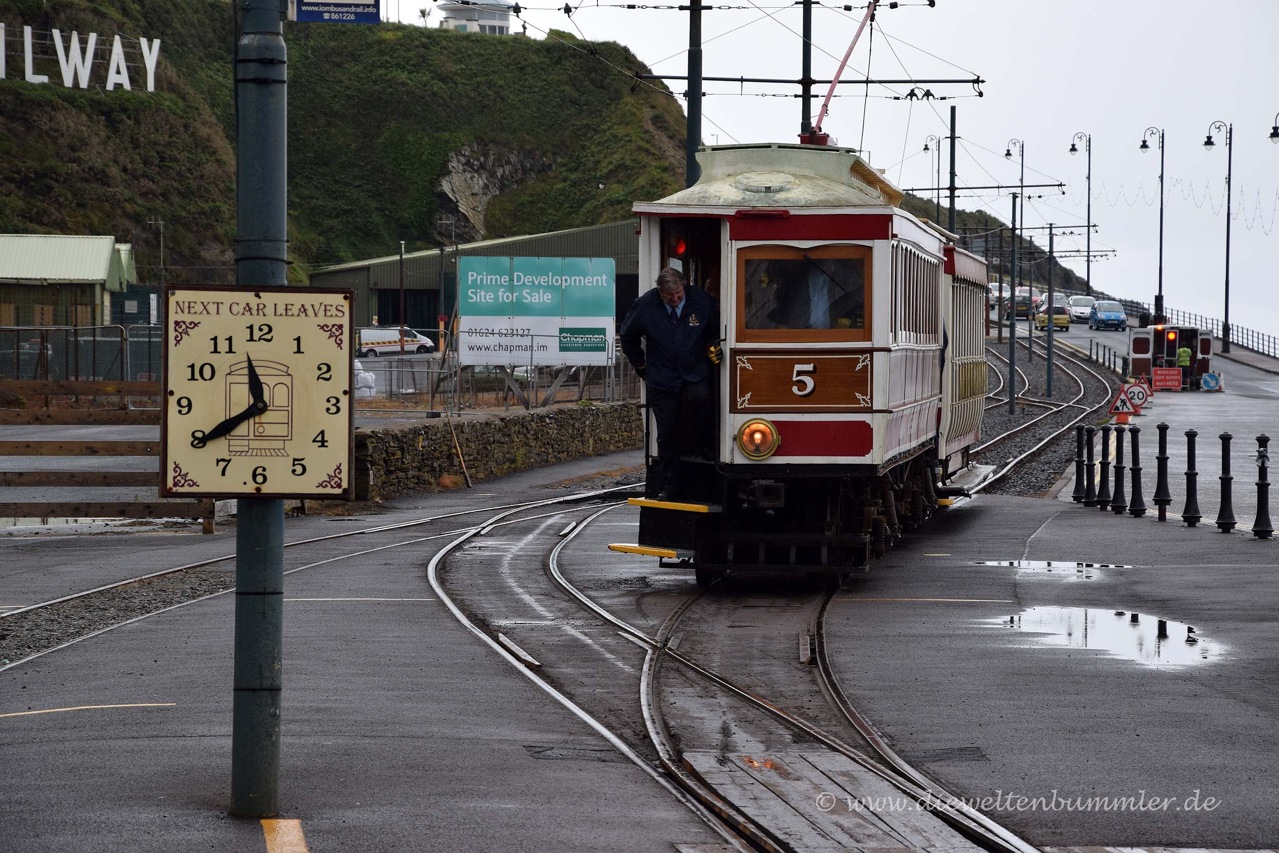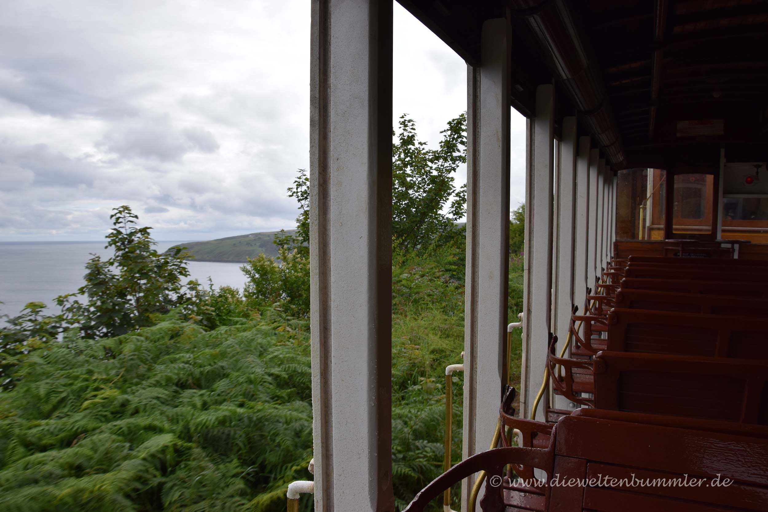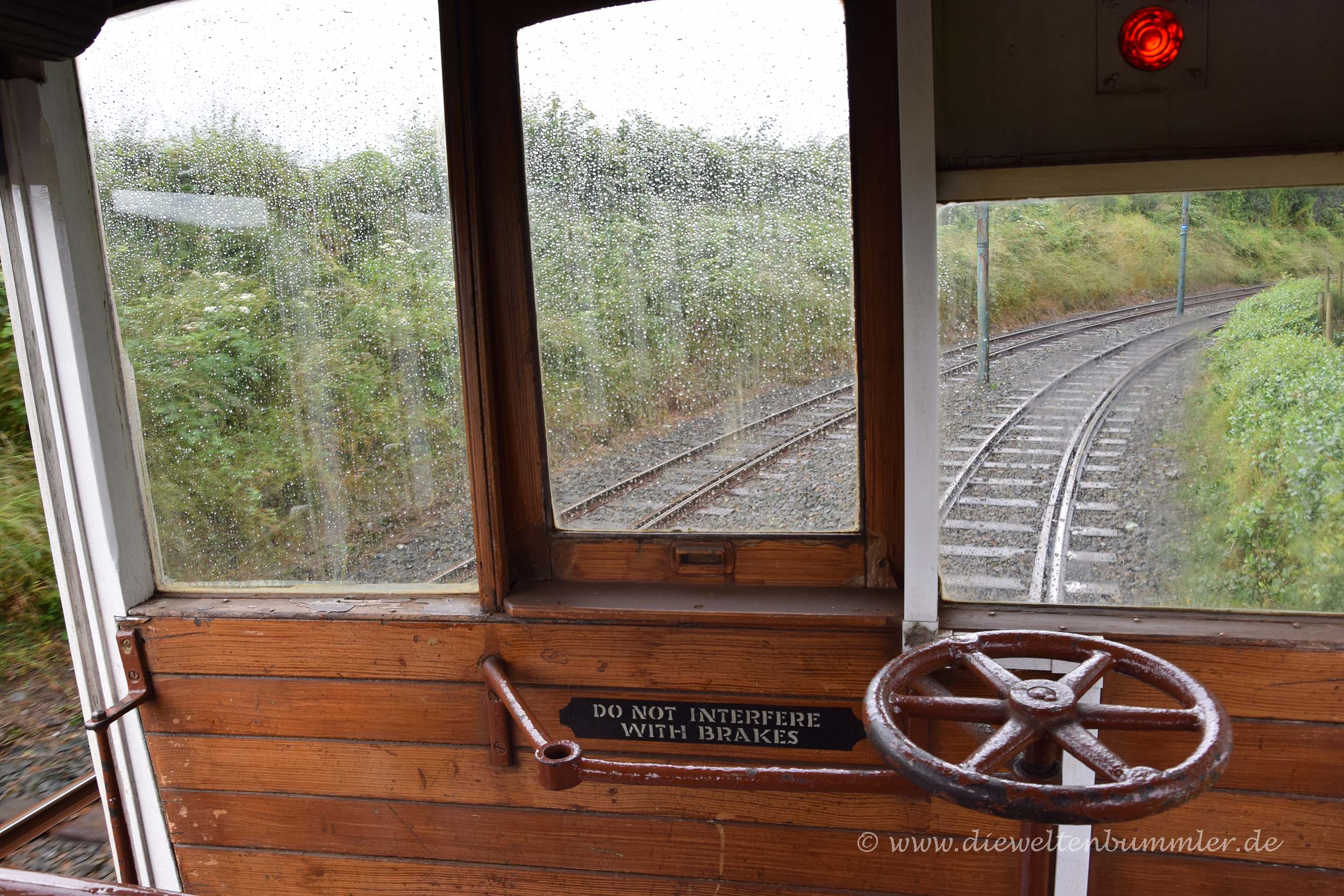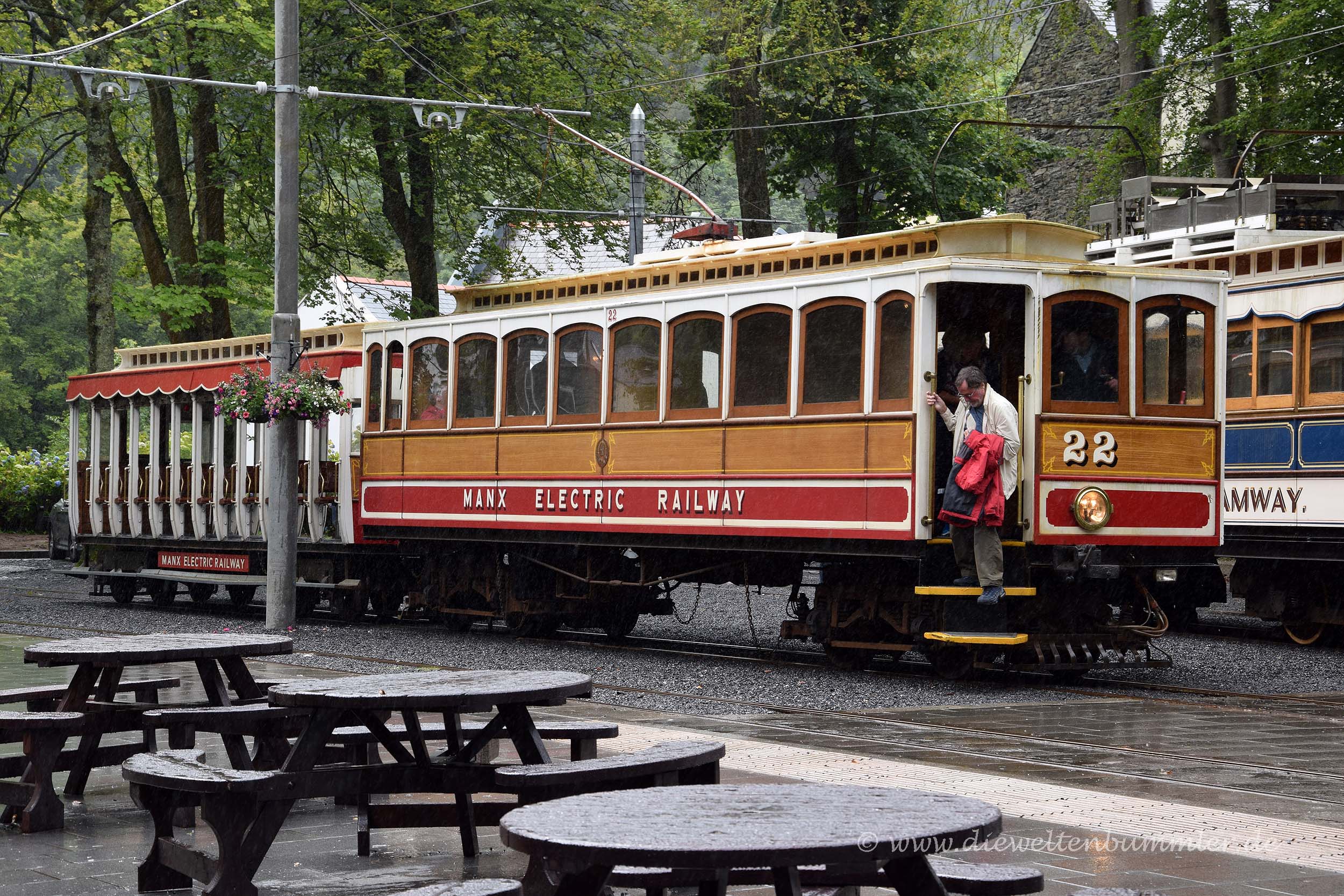 Wir hielten uns ein wenig länger am Point of Ayre auf und frühstückten erstmal. Danach fuhren wir, wie schon am vorherigen Morgen die Strecke bei Laxey nach Süden und stoppten in Douglas. Wir parkten am nördlichen Ende der Promenade, dort wo wir tags zuvor die Pferdestraßenbahn verließen, und kauften uns Tickets für das nächste öffentliche Verkehrsmittel, für die Manx Electric Railway. Mit dieser historischen Überlandstraßenbahn, die mit Holzbänken und Holzverkleidung daher kommt, fuhren wir einen Teil der Strecke wieder zurück nach Norden, genauer gesagt nach Laxey. Denn dort befindet sich wiederum auch die Talstation für die Snaefell Mountain Railway. Trotz des schlechten Wetters wollten wir auf den höchsten Gipfel der Isle of Man fahren.