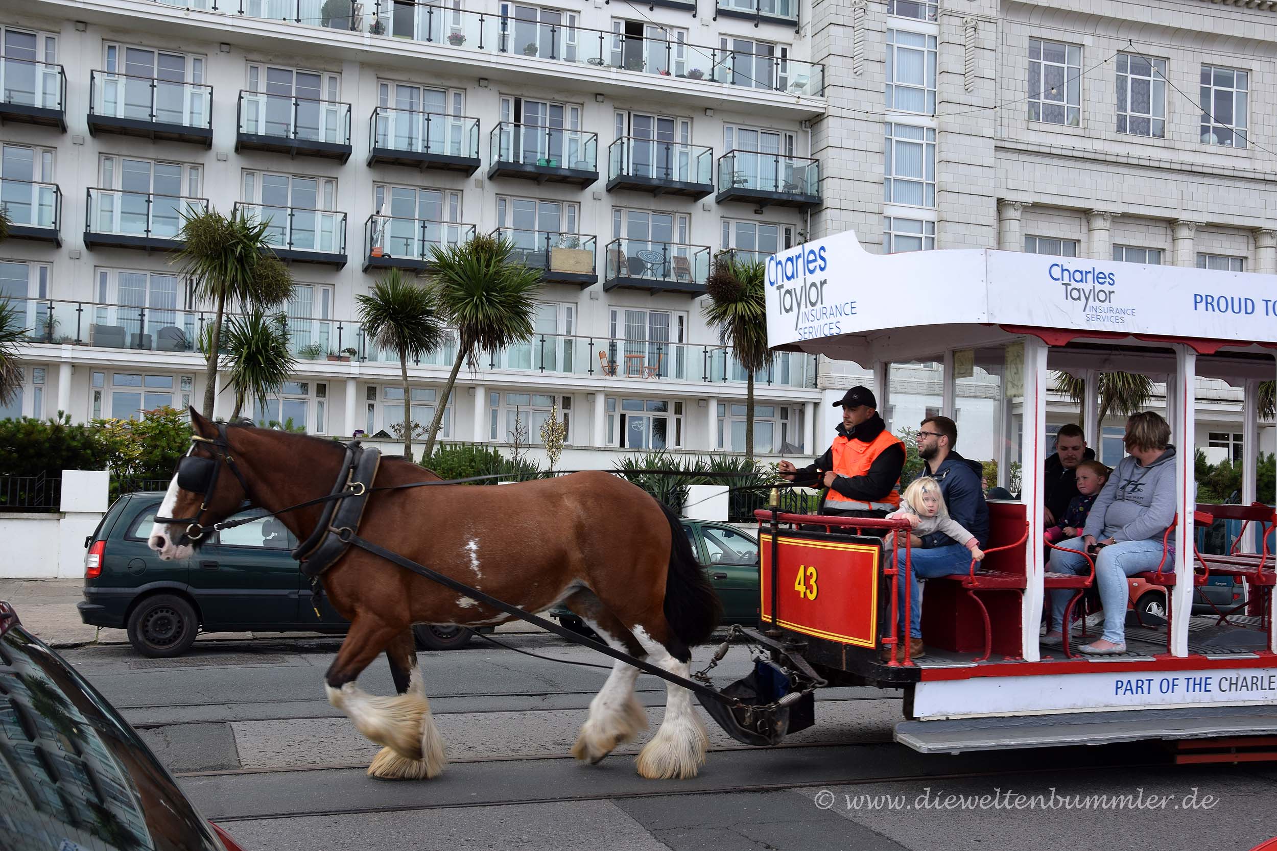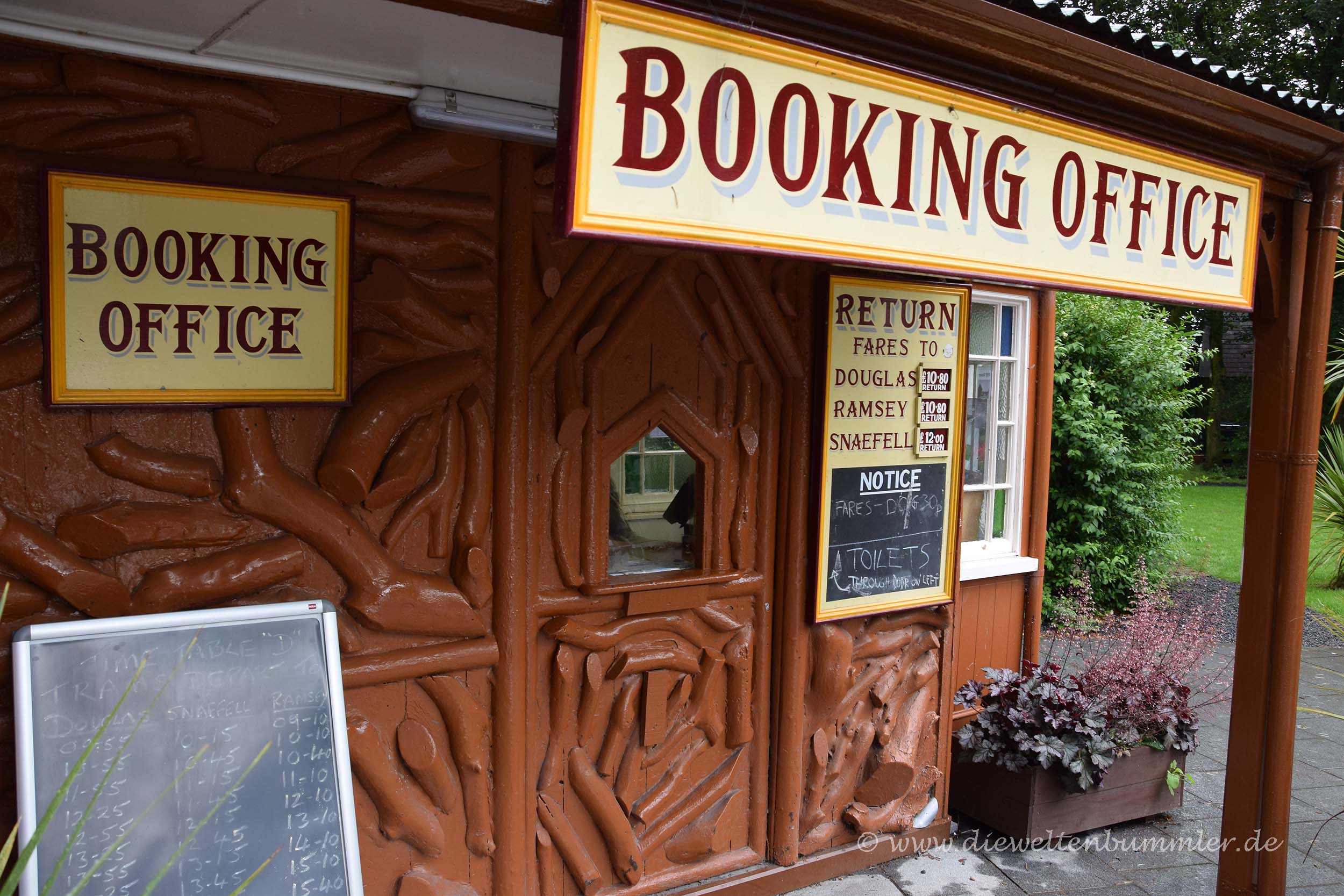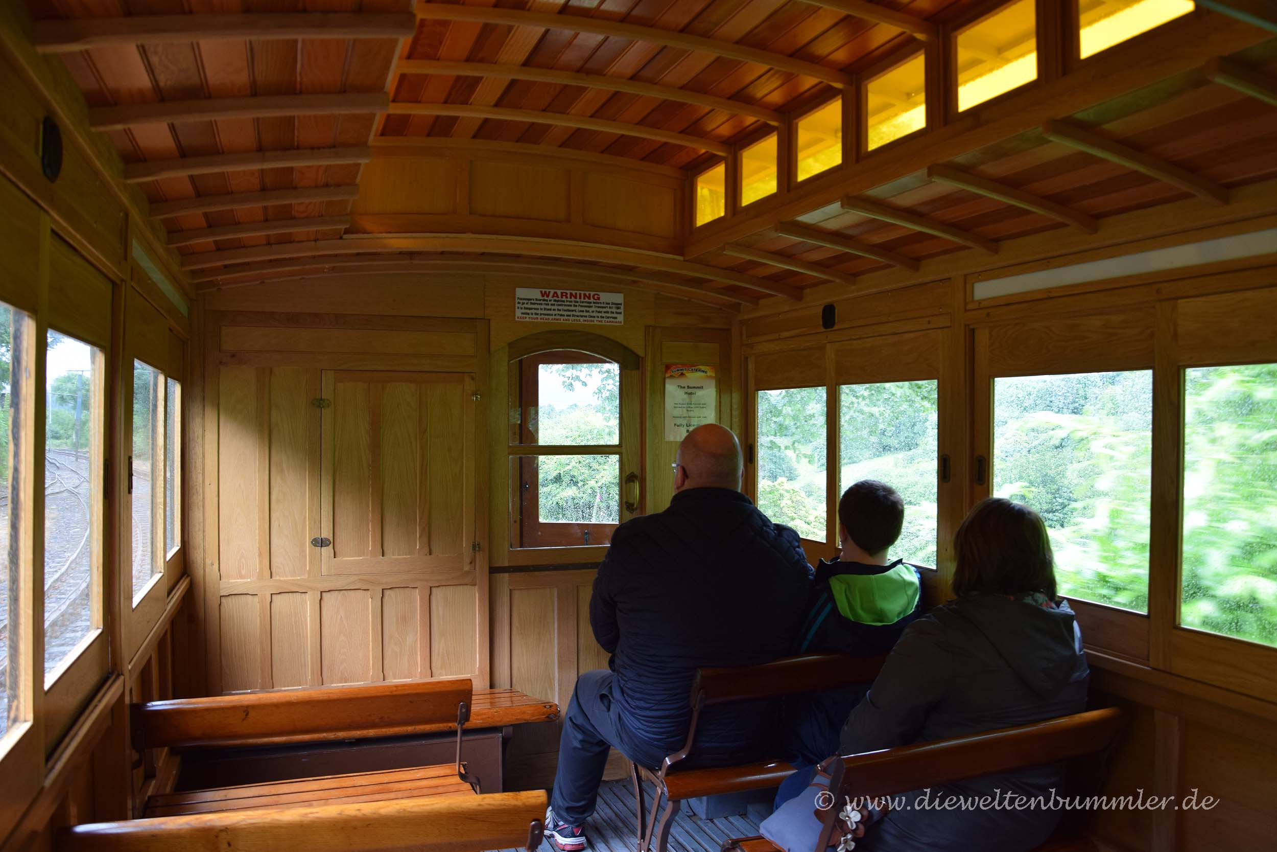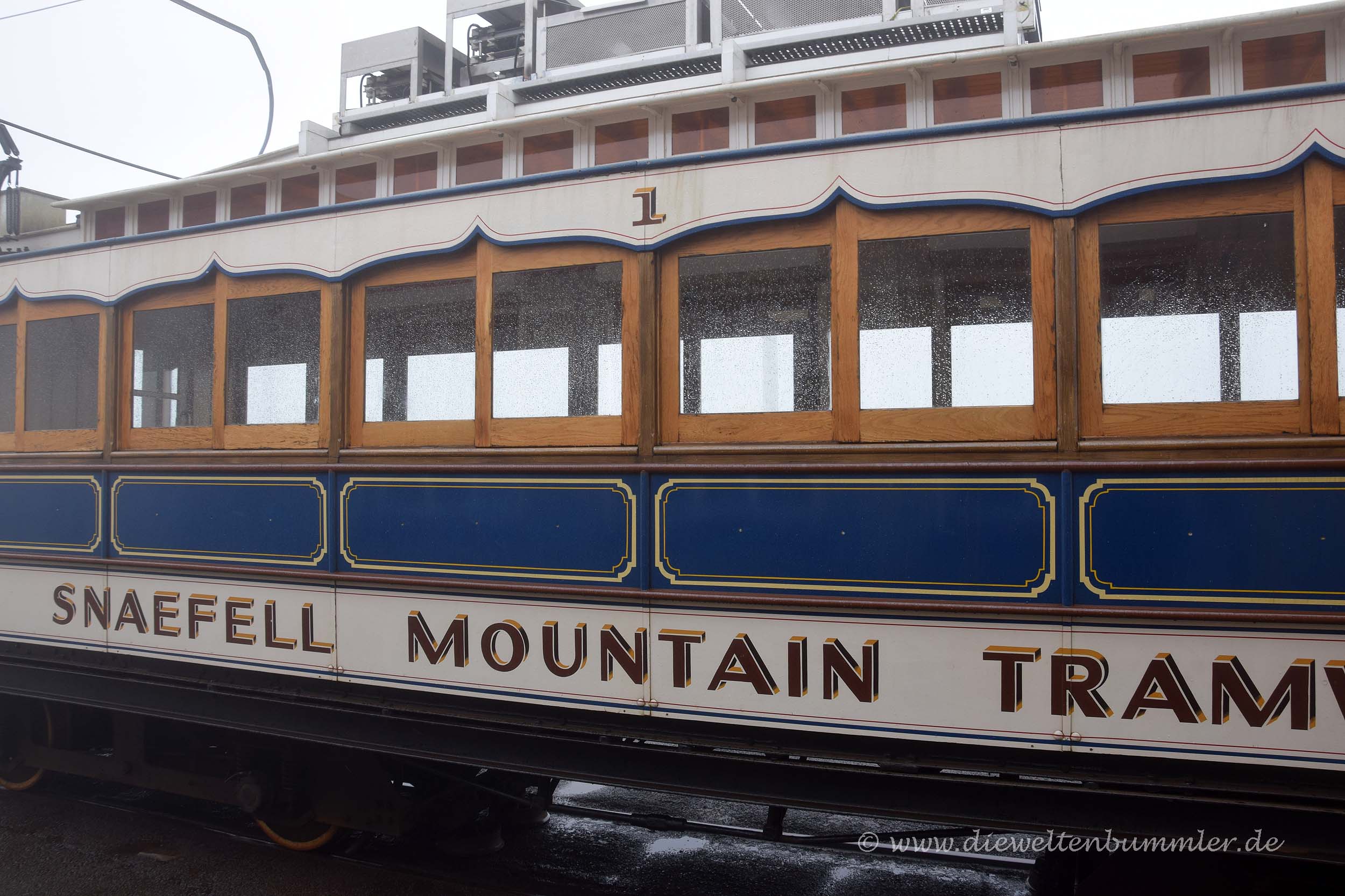 Wir hielten uns ein wenig länger am Point of Ayre auf und frühstückten erstmal. Danach fuhren wir, wie schon am vorherigen Morgen die Strecke bei Laxey nach Süden und stoppten in Douglas. Wir parkten am nördlichen Ende der Promenade, dort wo wir tags zuvor die Pferdestraßenbahn verließen, und kauften uns Tickets für das nächste öffentliche Verkehrsmittel, für die Manx Electric Railway. Mit dieser historischen Überlandstraßenbahn, die mit Holzbänken und Holzverkleidung daher kommt, fuhren wir einen Teil der Strecke wieder zurück nach Norden, genauer gesagt nach Laxey. Denn dort befindet sich wiederum auch die Talstation für die Snaefell Mountain Railway. Trotz des schlechten Wetters wollten wir auf den höchsten Gipfel der Isle of Man fahren.