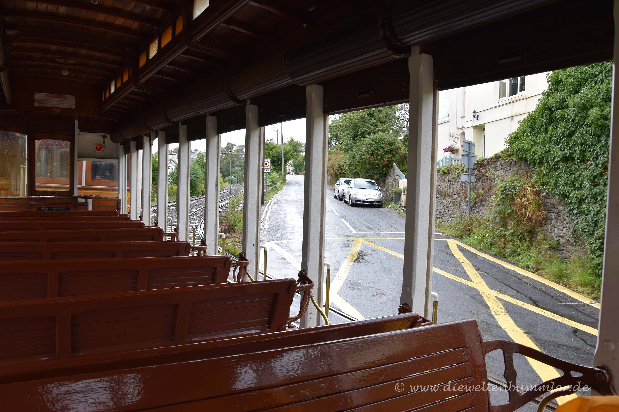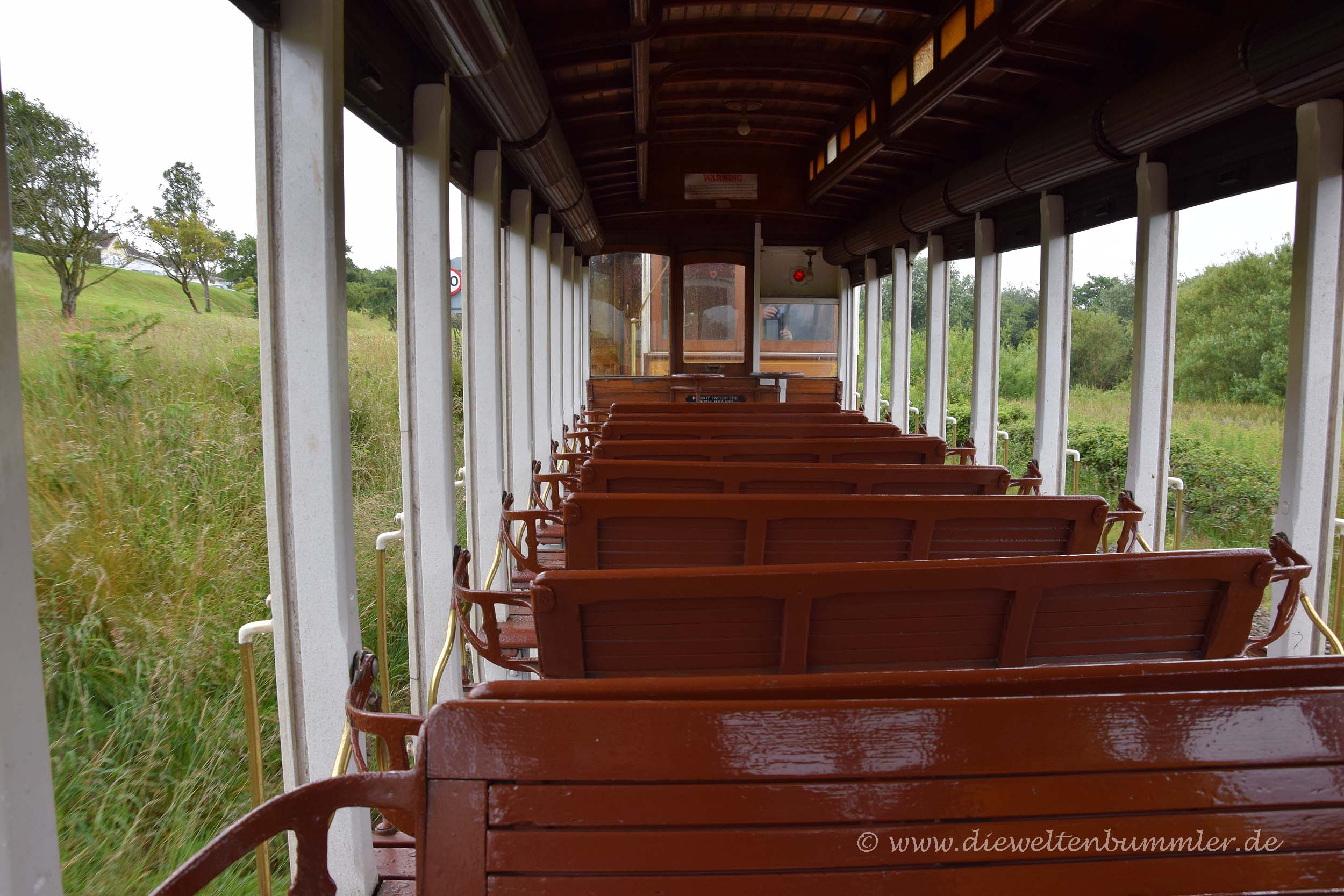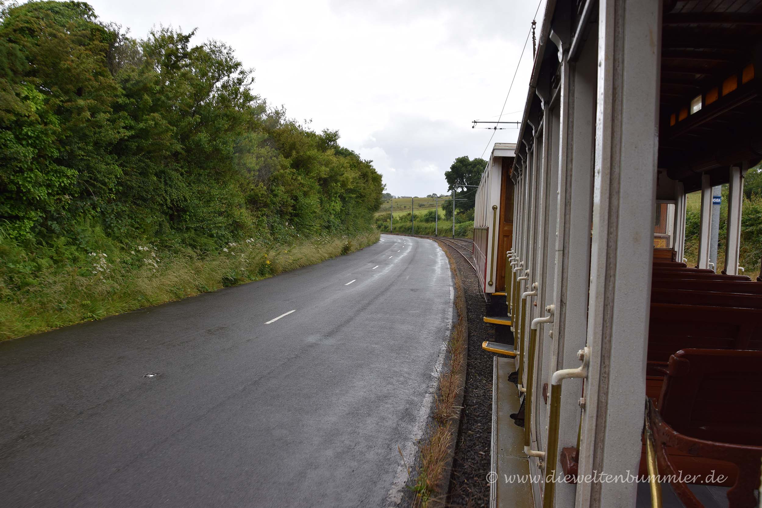 Rumpelnd kamen wir wieder am Laxey Wheel vorbei und erreichten wenig später die Talstation, wo unser Ausflug auf den Snaefell leider schon wieder zu Ende ging. Dort stiegen wir wieder in die Manx Electric Railway um und hatten die Auswahl zwischen einem geschlossenen Waggon und einem offenen Wagen, wo es nur ein Dach über den Sitzen gab. Wir entschieden uns trotz der Kälte und des Regens für Letzteres. Wann hat man schon mal die Gelegenheit, mit so einem offenen Wagen Straßenbahn zu fahren? Außerdem hatten wir den Holzwaggon ja bereits auf der Hinfahrt kennengelernt. Es war nicht überraschend, dass wir die einzigen Fahrgäste in diesem Wagen waren, aber umso größeren Spaß hatten wir, als unser offener Waggon durch die Küstenlandschaft gezogen wurde.