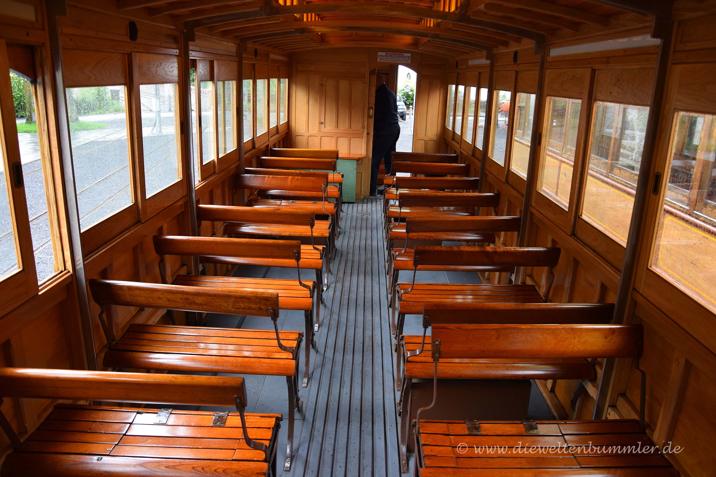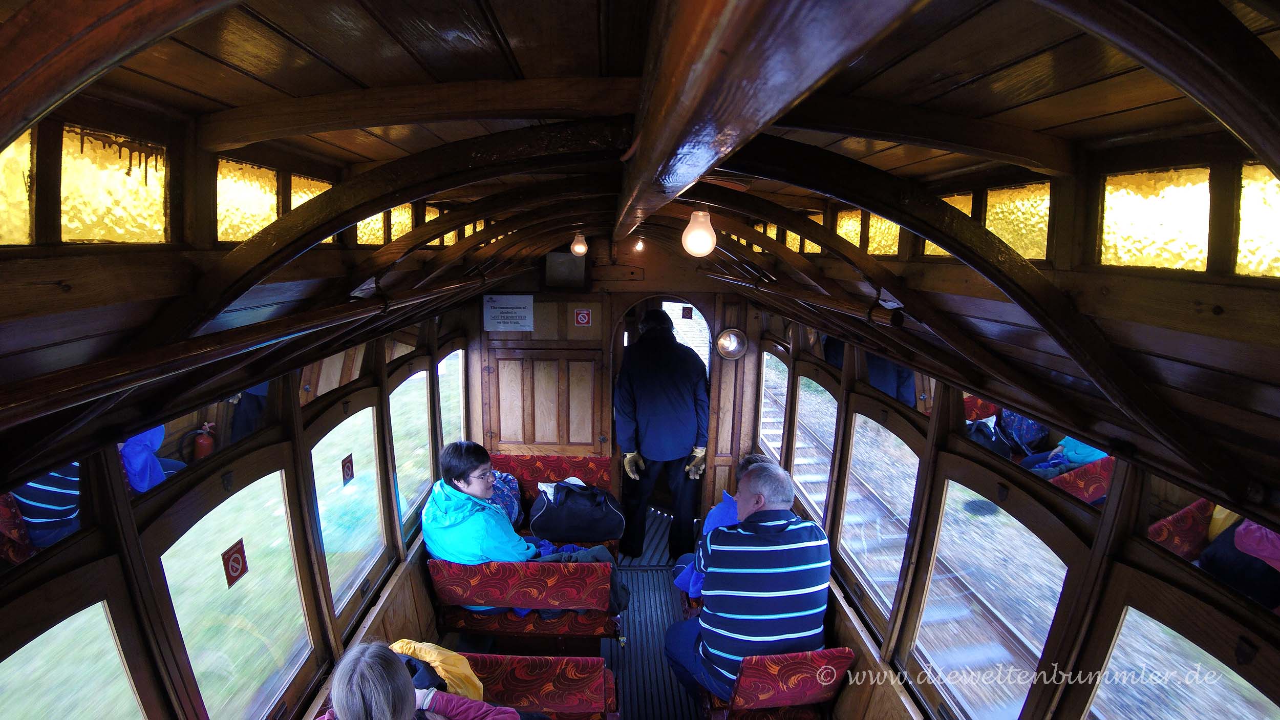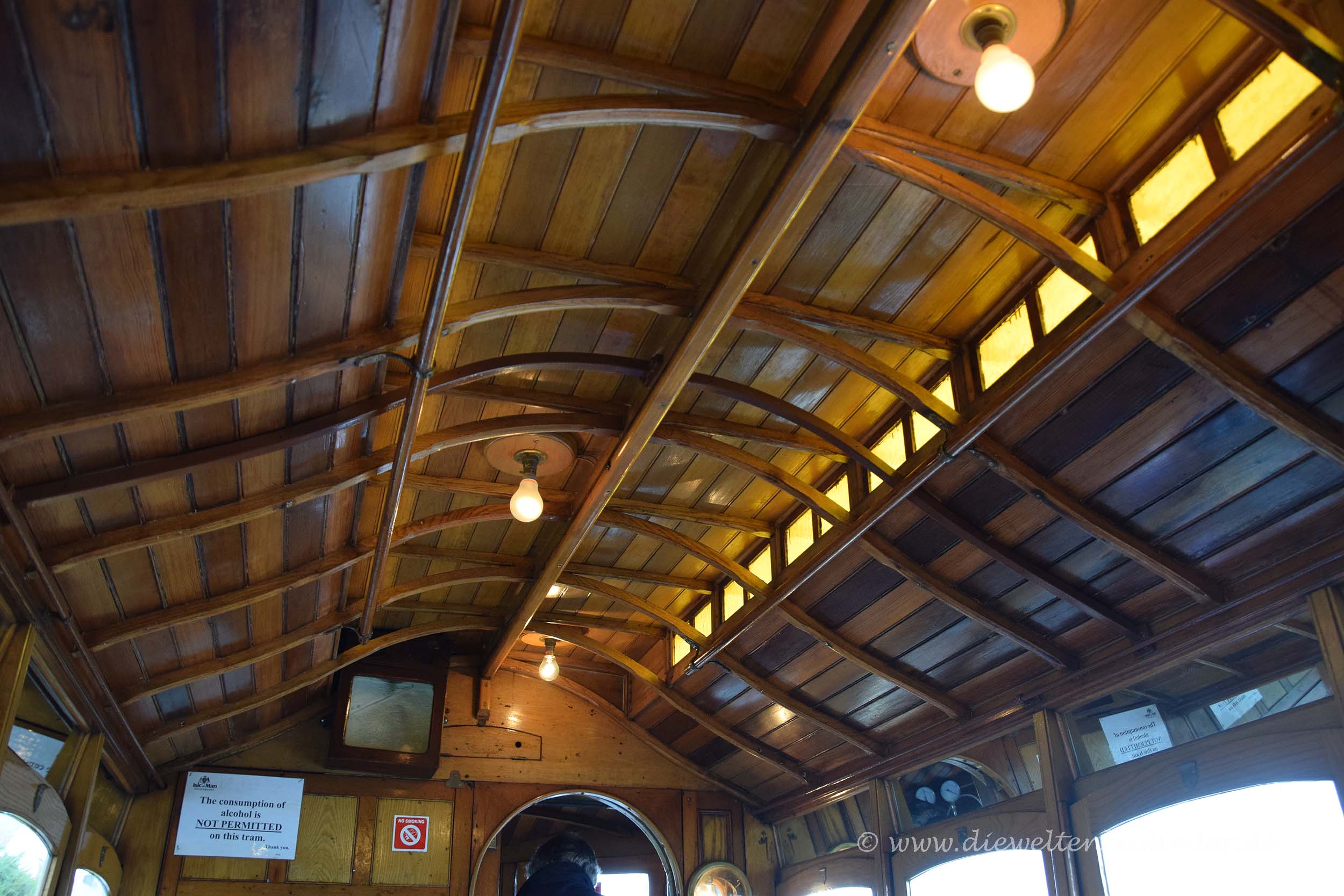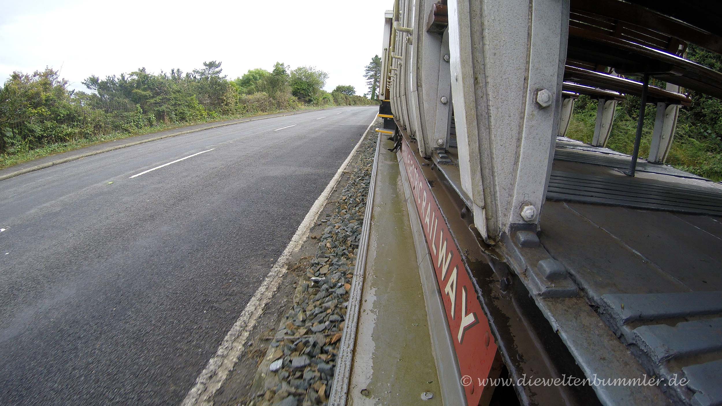 Rumpelnd kamen wir wieder am Laxey Wheel vorbei und erreichten wenig später die Talstation, wo unser Ausflug auf den Snaefell leider schon wieder zu Ende ging. Dort stiegen wir wieder in die Manx Electric Railway um und hatten die Auswahl zwischen einem geschlossenen Waggon und einem offenen Wagen, wo es nur ein Dach über den Sitzen gab. Wir entschieden uns trotz der Kälte und des Regens für Letzteres. Wann hat man schon mal die Gelegenheit, mit so einem offenen Wagen Straßenbahn zu fahren? Außerdem hatten wir den Holzwaggon ja bereits auf der Hinfahrt kennengelernt. Es war nicht überraschend, dass wir die einzigen Fahrgäste in diesem Wagen waren, aber umso größeren Spaß hatten wir, als unser offener Waggon durch die Küstenlandschaft gezogen wurde.