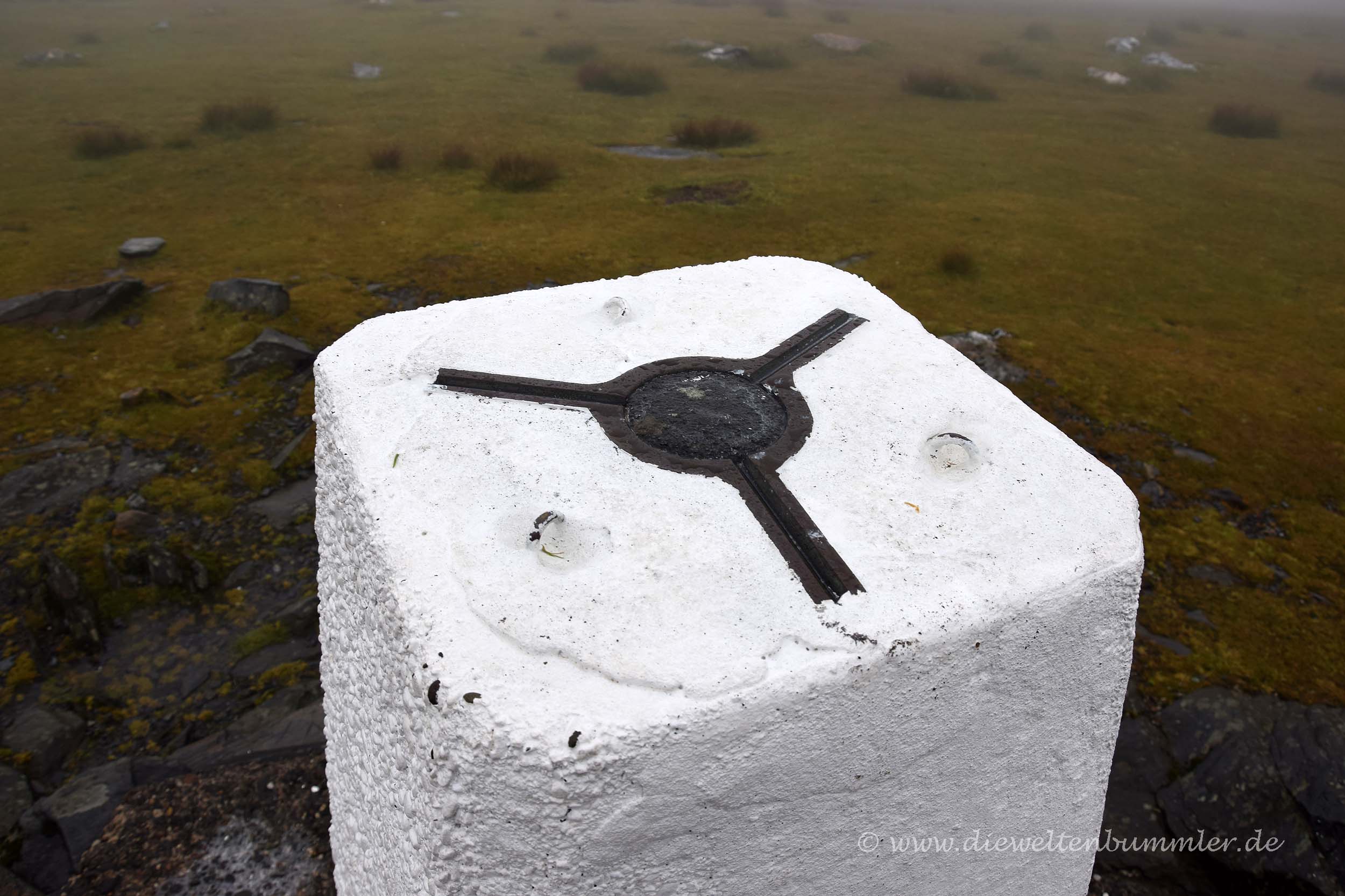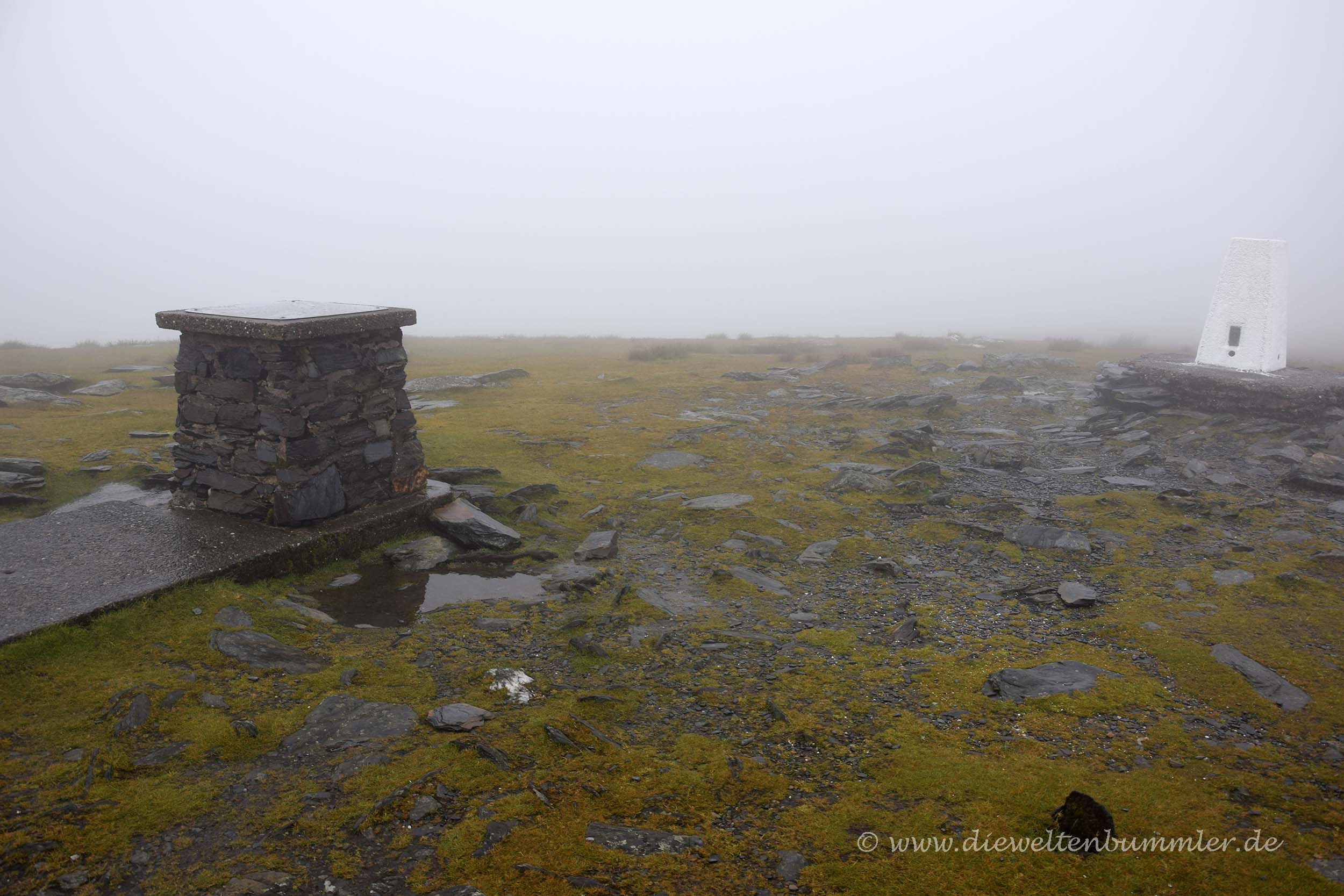 Doch diesen wollten wir wenigstens mal gesehen haben. Also stapften wir durch den Nebel und hielten bei dem Regen an der Gipfelmarkierung für ein Pingu-Foto an. Kurioserweise waren wir dabei die einzigen der Passagiere, die wirklich bis zum höchsten Punkt gingen. Alle anderen blieben in der Bergstation und tranken dort einen Kaffee. Das fand ich irritierend, denn ich stellte mir die Frage, warum man dann bergauf hierher fährt. Ungefähr eine halbe Stunde hatten wir Aufenthalt, bevor die Snaefell Mountain Railway wieder mit uns hinab fuhr. Schade, dass das Wetter es in diesem Moment nicht besser mit uns meinte, denn gerne hätten wir natürlich die Aussicht genossen und nicht weniger schön wäre es natürlich gewesen, zu Fuß hinauf zu wandern oder wenigstens wieder hinab. Aber es hat nicht sollen sein.