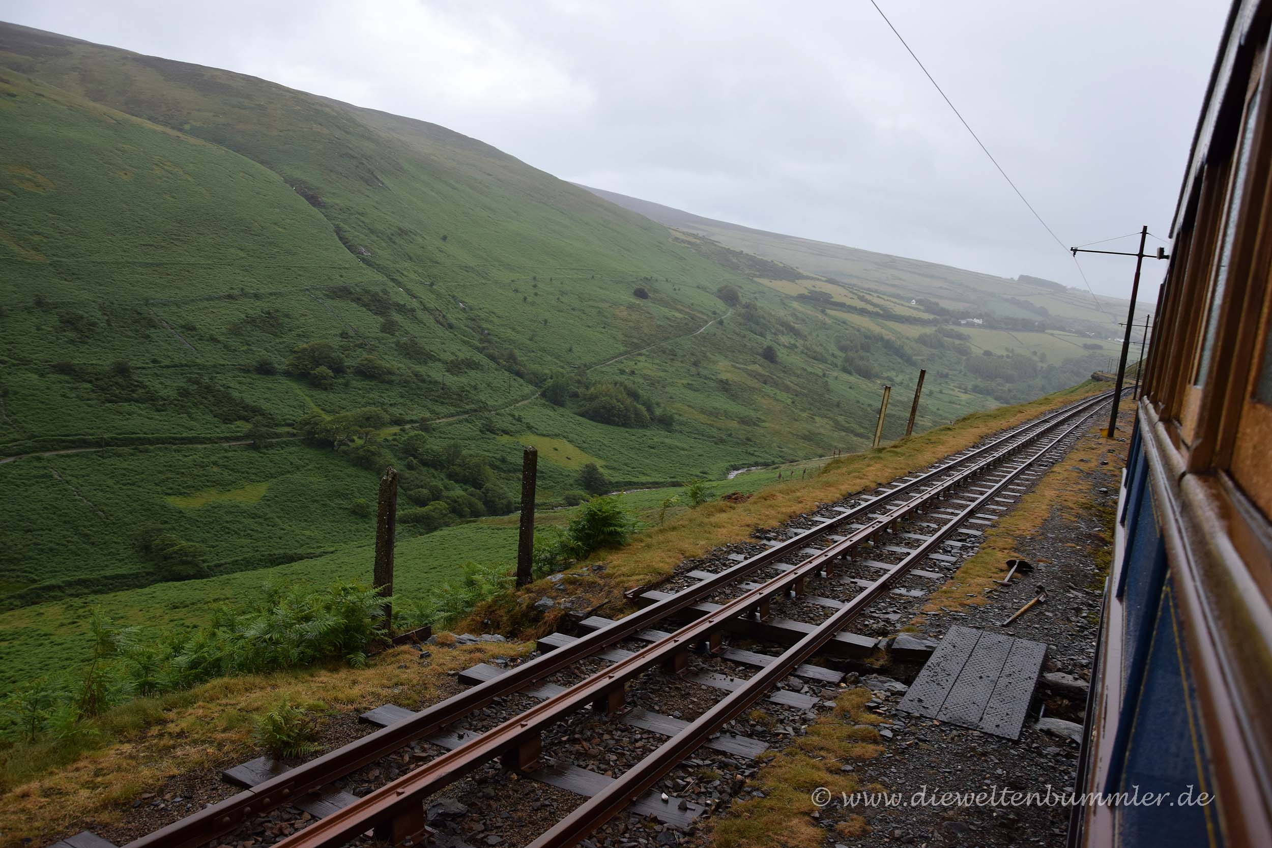 Der ganz ursprüngliche Plan war eigentlich, dass wir zu Fuß den Berg erklimmen, so hoch ist er ja nun nicht. Aber zumindest dazu hatten wir bei dem schlechten Wetter keine Lust. Warum also nicht mit einer rumpelnden Bahn bergauf fahren und einfach mal die Fahrt genießen? Zumindest unterwegs konnten wir ein wenig die Aussicht genießen und sahen auch wieder das markante Laxey Wheel, doch als wir oben ankamen, steckten wir in einer dichten Wolke. An Fernsicht war keinesfalls zu denken. Ganz im Gegenteil, wir konnten von der Bergstation aus noch nicht einmal den nahegelegenen Gipfel erkennen, der gerade mal 100 Meter entfernt ist.