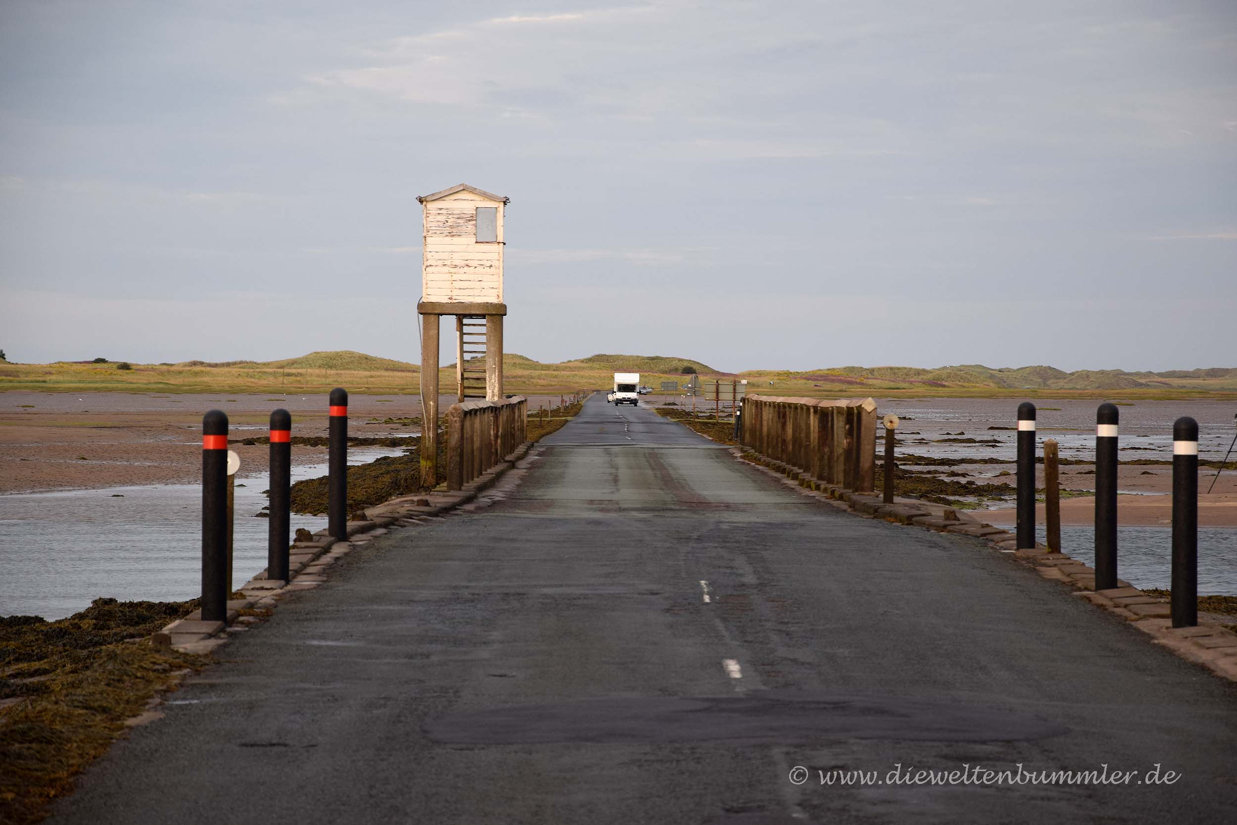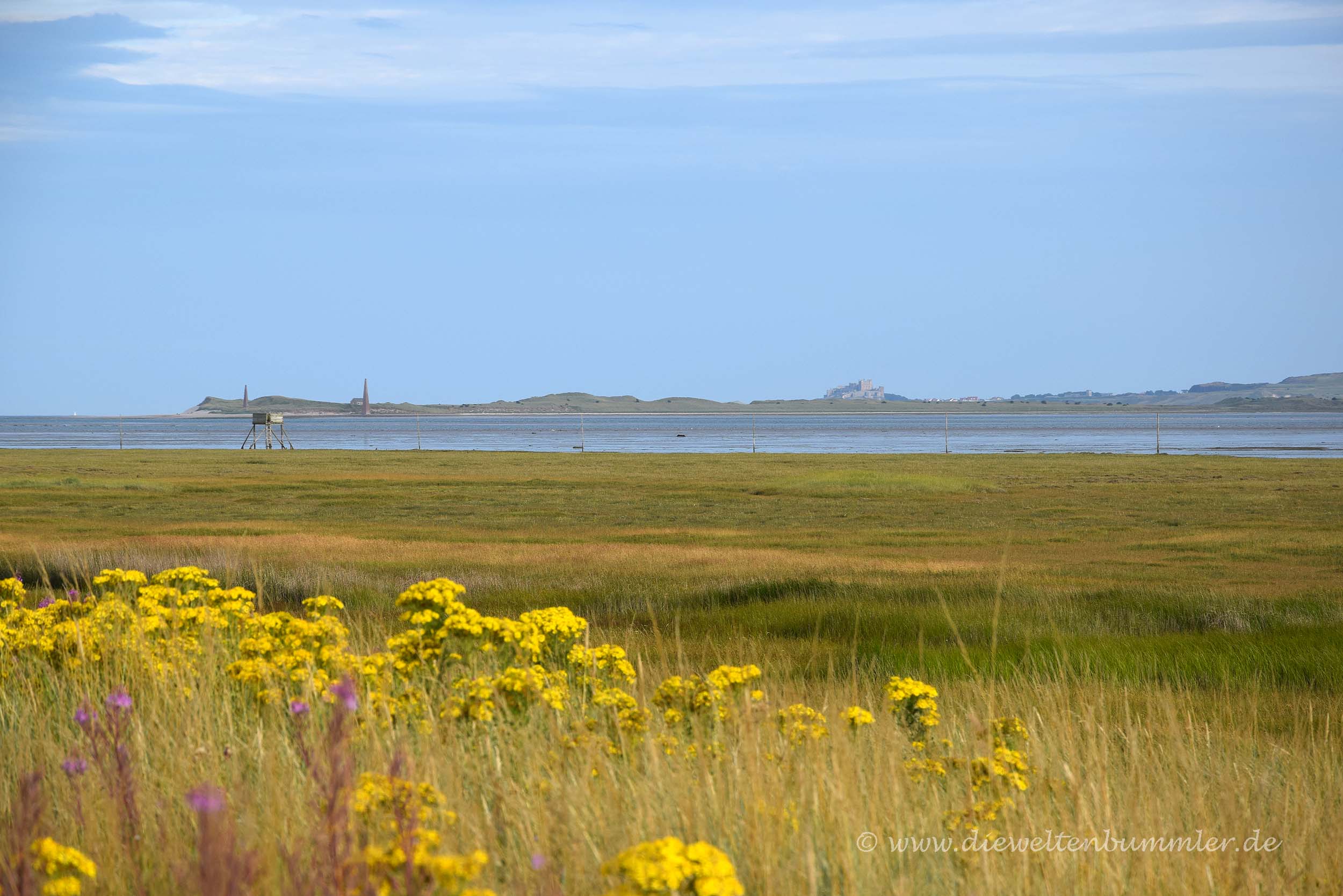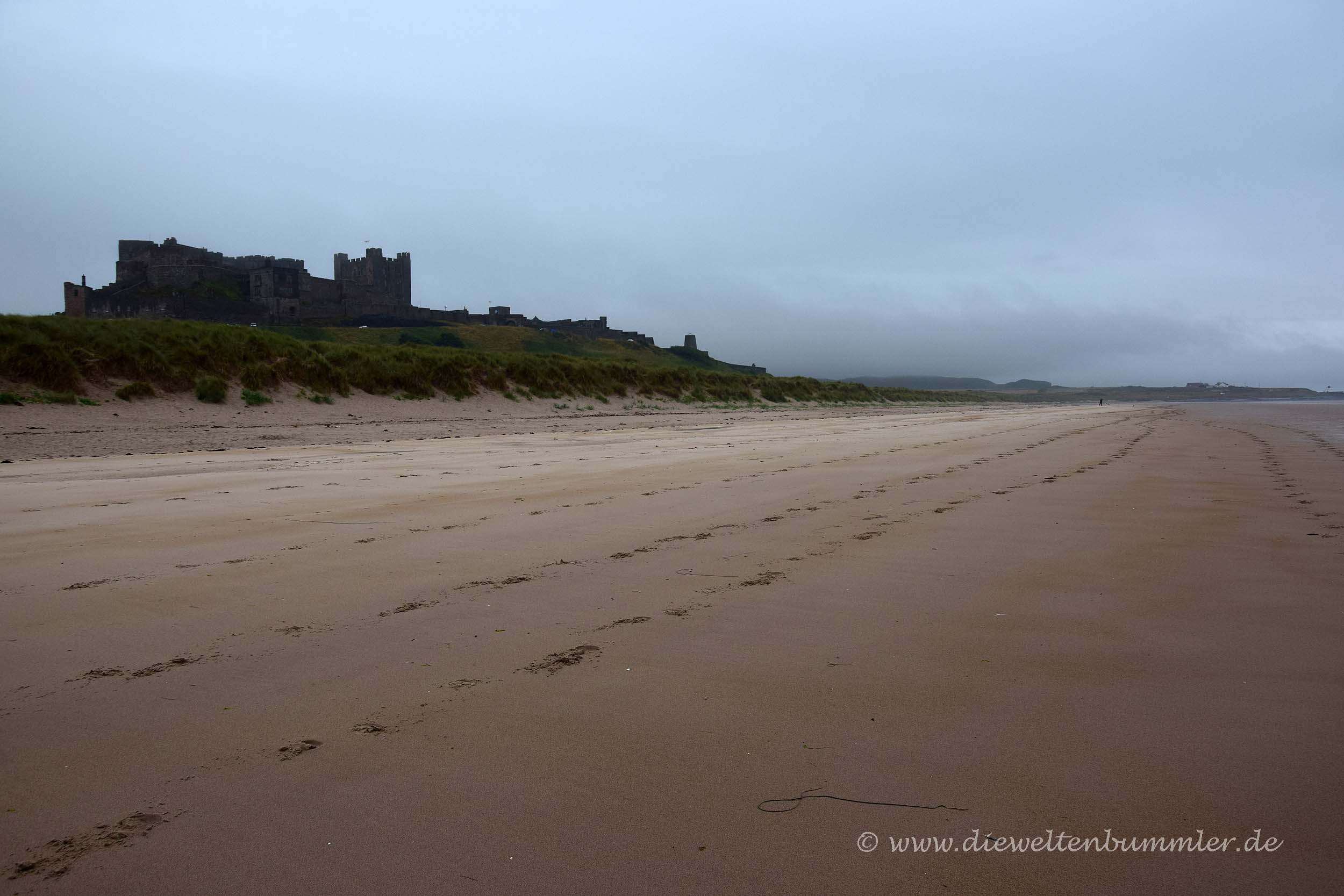 Als wir am nächsten Morgen wach wurden, waren wir froh darüber, dass wir den trockenen Abend zuvor noch ausgiebig genutzt hatten. Denn an diesem fünften Freitag unserer Reise war die Sicht mal wieder richtig schlecht. Nach oben zu gucken ging gar nicht, denn dann tropfte der Regen in die Augen. Es war von Anfang an klar, dass dieser Tag keine guten Bilder mit sich bringen würde. Dennoch fuhren wir zum Bamburgh Castle. Wir hatten das Schloss zwar schon zwei Jahre zuvor besucht, aber es damals irgendwie versäumt, zum Strand hinunter zu gehen, wo man einen schönen Blick auf das Schloss hat.